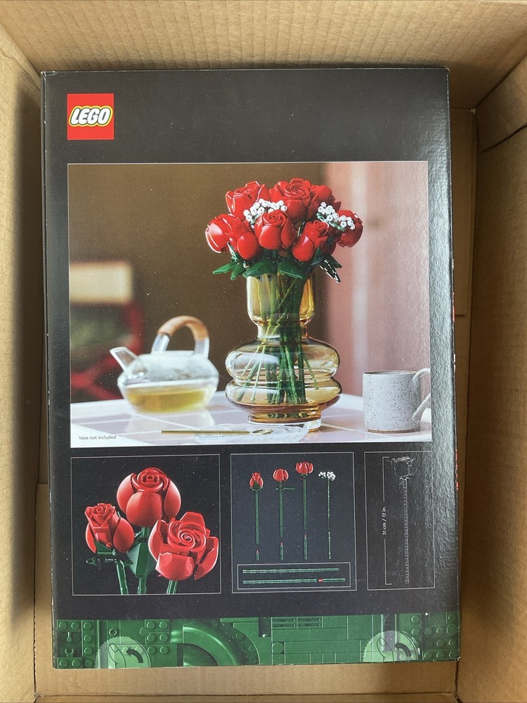 LEGO bunch of roses, brand new in box. Unleash your creativity with the LEGO Icons Bouquet of Roses, an artificial flowers set designed for adult builders. This set, a delightful addition to the Botanicals product line, features 822 pieces that assemble into a stunning arrangement of multicolor roses, capturing the essence of nature's beauty. The thoughtful details and intricate design are perfect for those who appreciate the elegance of architecture and the joy of building. Every piece is crafted from high-quality plastic, ensuring a durable and lasting display. With an item height of 382mm, width of 262mm, and length of 70mm, this MOC (My Own Creation) set is an ideal size for tabletop decoration. Weighing in at 690g, it's a substantial yet charming build that's sure to brighten any space without the need for sunlight or maintenance.