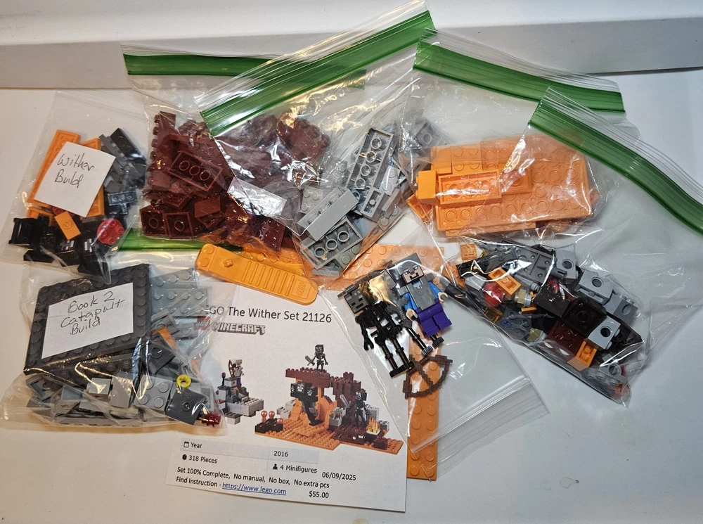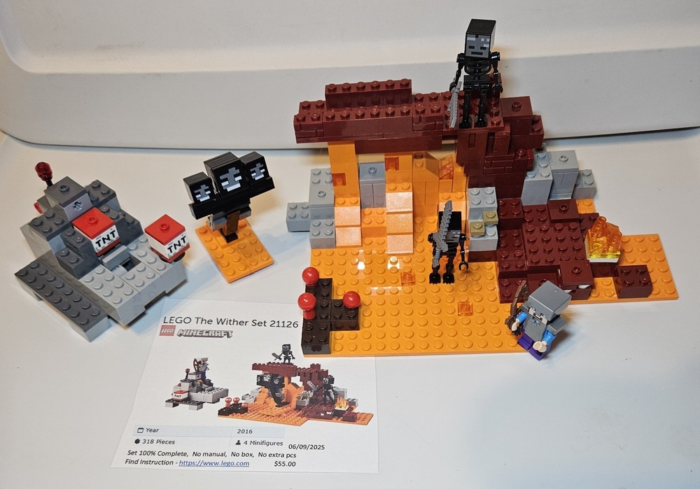 Note: All open box Lego sets I sell are checked using Bricklink.com or Brickowl.com. I take time to make sure all the parts are included. Every set is assembled to verify completeness. This Lego Minecraft 21126 The Wither set is 100% complete with all the minifigures and accessories. Does not include extra pieces, the box or manuals. Set is clean and dust free. Comes from a smoke and pet free home. Set will be shipped disassembled in separate bags numbered to the assembly instructions. Sold as is; as shown.