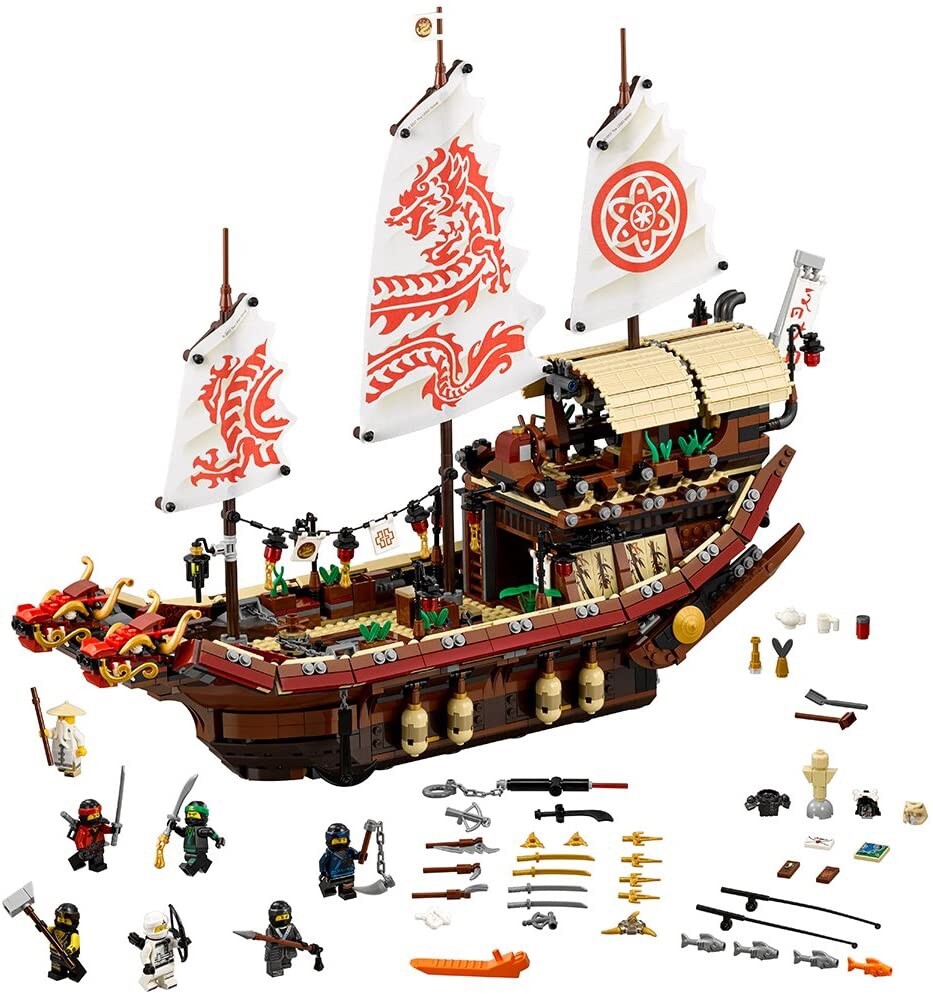 LEGO Ninjago Destiny's Bounty 70618 Building Set 95% Complete Only 1 Mini Figure include to set! What I see as missing is brown part left side of the ship as you can see in picture, it might missing some other little parts too… but 95% is there! NO BOX OR INSTRUCTION BOOK! Set will partially disassemble before shipping!