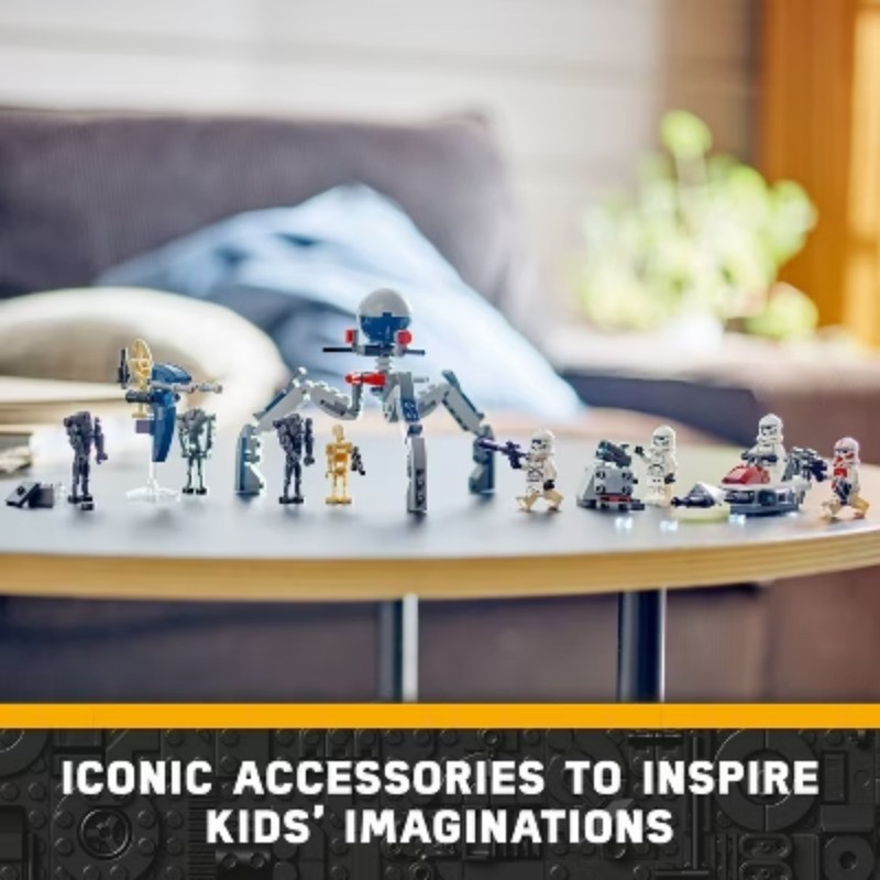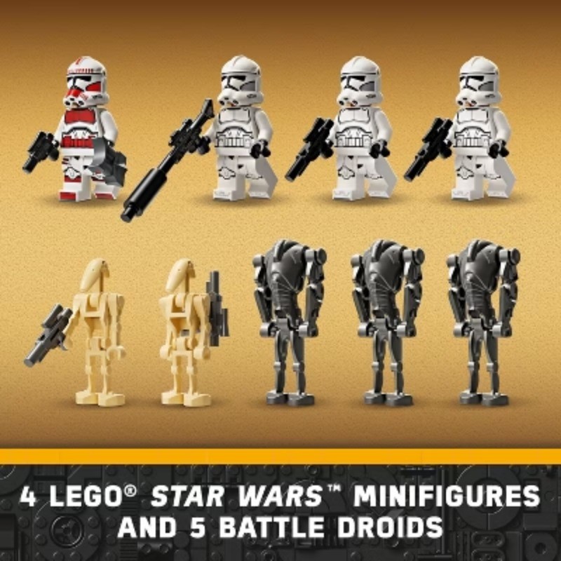 Description Inspire youngsters to recreate thrilling Star Wars: The Clone Wars scenes with this LEGO Star Wars Clone Trooper & Battle Droid Battle Pack (75372) for ages 7 and up. It features 4 LEGO Star Wars minifigures and 5 LEGO figures – a Clone Shock Trooper, 3 Clone Troopers, 3 Super Battle Droids and 2 Battle Droids – with iconic weapons accessories for action play. This LEGO building set also includes a stud-shooting Star Wars speeder bike for 2 Clone Troopers and a buildable STAP speeder vehicle toy for a Battle Droid. A tri-droid with 3 flick shooters and a defensive post with a stud shooter add even more creative role-play possibilities. This Collectible Star Wars building toy makes the perfect anytime gift for young fans! Check out the LEGO Builder app for digital instructions and zoom and rotate viewing tools to enhance children’s building experience. This buildable playset is great to play with on its own and the characters and builds can be combined with other LEGO Star Wars sets (sold separately) in the extensive range. highlights Clone Trooper & Battle Droid Battle Pack for kids – Recreate Star Wars: The Clone Wars scenes with this buildable action toy, featuring LEGO figures, a speeder bike vehicle, accessories, and more 4 LEGO Star Wars minifigures and 5 LEGO figures for action play – A Clone Shock Trooper, 3 Clone Troopers, 3 Super Battle Droids and 2 Battle Droids with assorted accessories Buildable LEGO Star Wars speeder bike – The speeder bike has 2 stud shooters, 2 holders for blasters and space for 2 Clone Troopers Unlimited creative role play for kids– A tri-droid with a rotating top and 3 flick shooters, a STAP speeder for a Battle Droid, a defensive post with a stud shooter, a thermal detonator element and more Collectible Gift for Star Wars fans aged 7 and up – Give this fun, collectible building toy to kids who are into Star Wars: The Clone Wars Fun LEGO Star Wars sets for all ages – LEGO Star Wars building toys enable kids and adult fans to recreate iconic scenes, make up their own action-adventures or simply display the buildable models Compact 215-piece set – The tri-droid measures over 4.5 in. (12 cm) high, 6 in. (15 cm) long and 5 in. (13 cm) wide