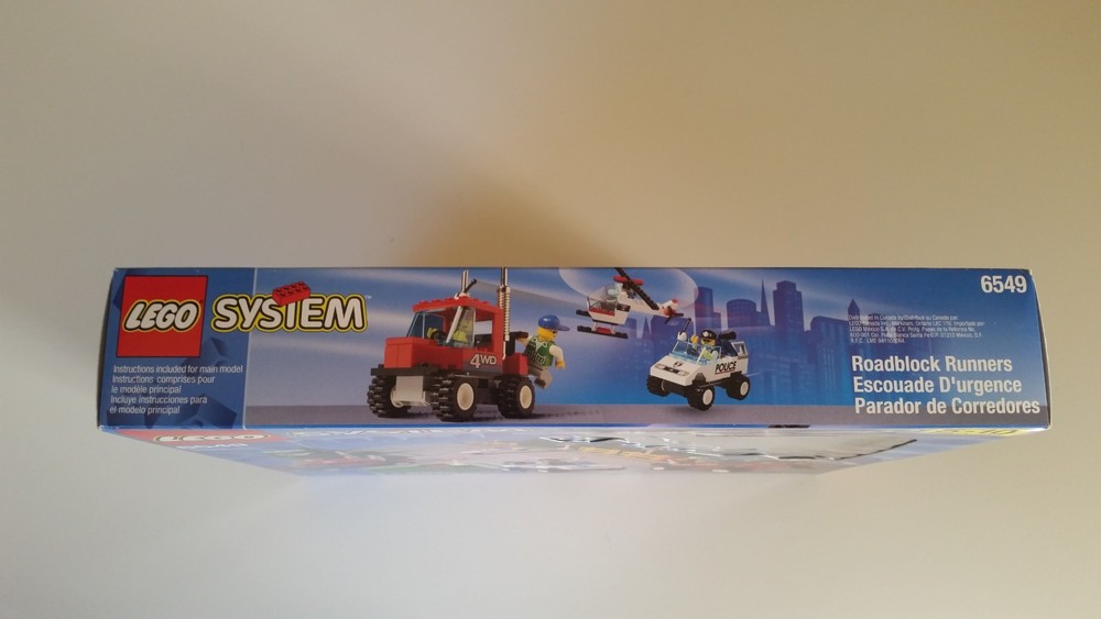 This vintage LEGO set from 1996 is a Town-themed "Roadblock Runners" set with 50 pieces. The set allows for two different build sides and is 2 feet x 3 feet. It comes in a box packaging and is recommended for ages 5-12. The LEGO set number is 6549, and it is part of the 2 in one Floor Puzzle product line by LEGO. Puzzle only, as originally sold. Some crush to box as stored but FULLY COMPLETE