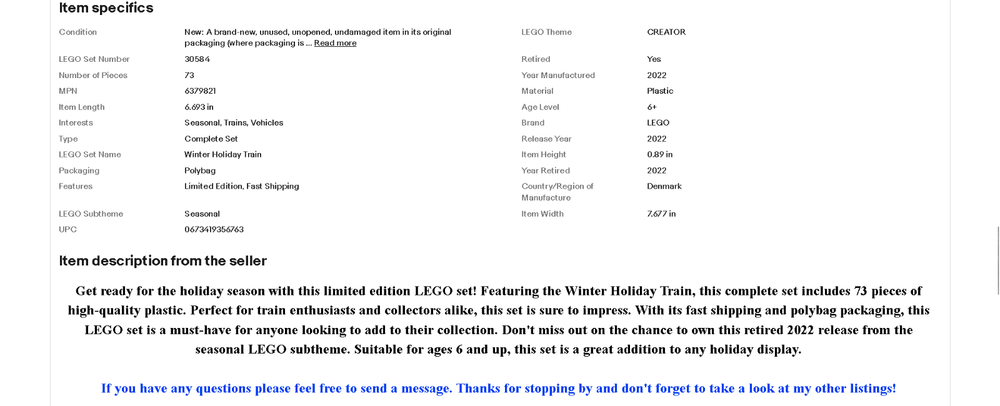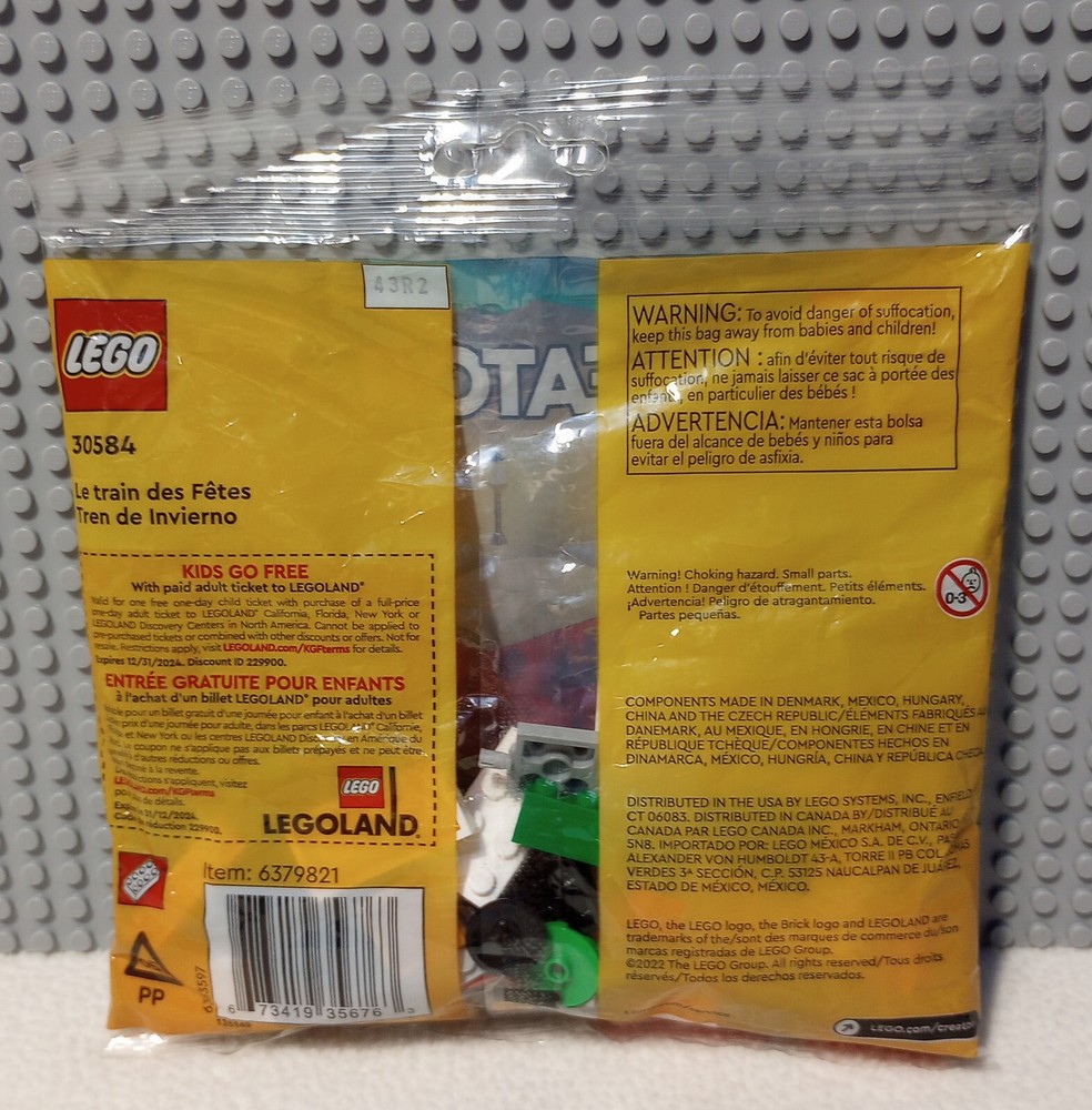 LEGO Theme: CREATOR gtin13: 0673419356763 Packaging: Polybag Item Width: 7.677 in Country/Region of Manufacture: Denmark LEGO Set Name: Winter Holiday Train Release Year: 2022 MPN: 6379821 Item Length: 6.693 in Brand: LEGO Year Retired: 2022 Item Height: 0.89 in Retired: Yes LEGO Subtheme: Seasonal Material: Plastic Year Manufactured: 2022 Features: Limited Edition, Fast Shipping LEGO Set Number: 30584 Age Level: 6+ Interests: Seasonal, Trains, Vehicles UPC: 0673419356763 Number of Pieces: 73 Type: Complete Set