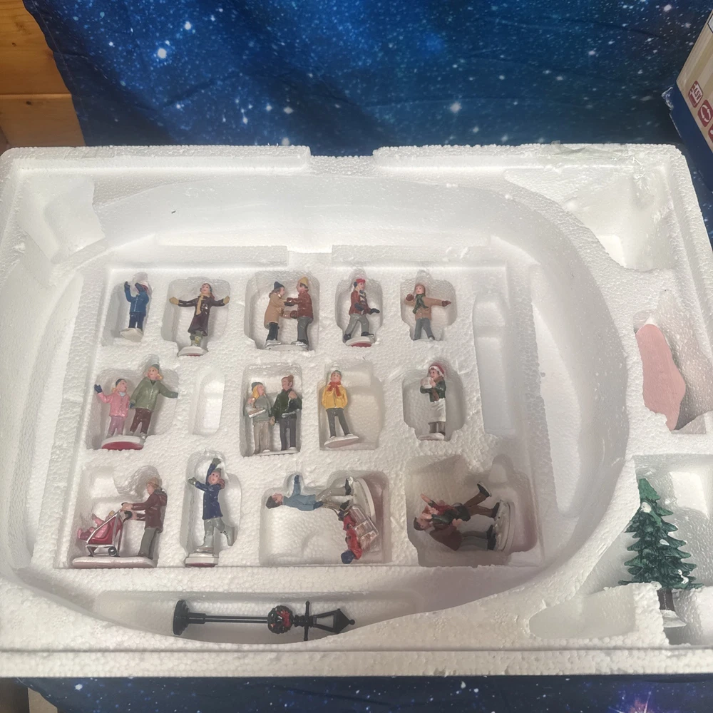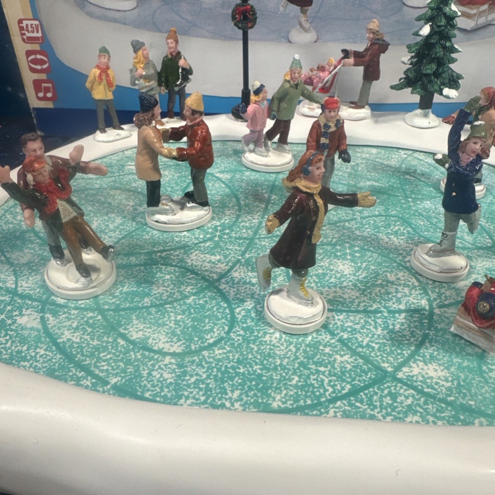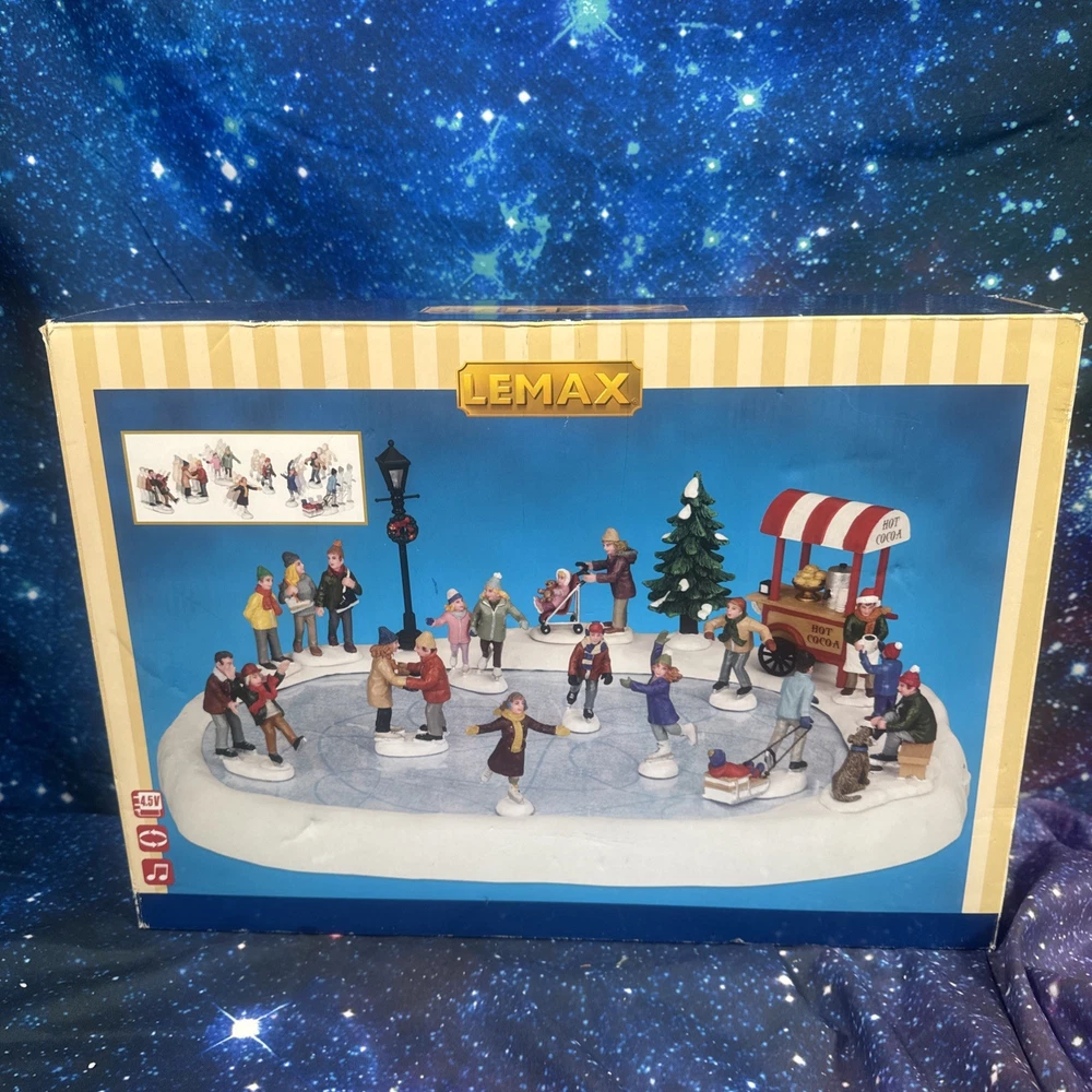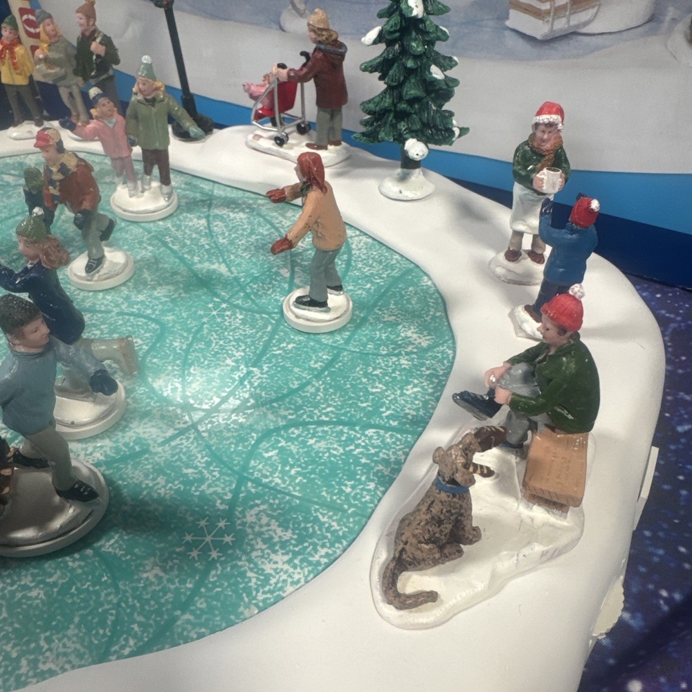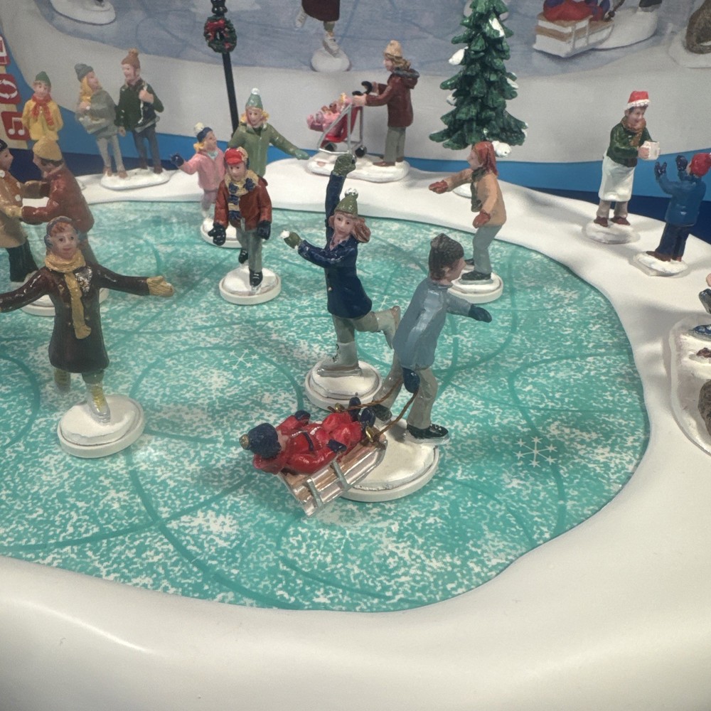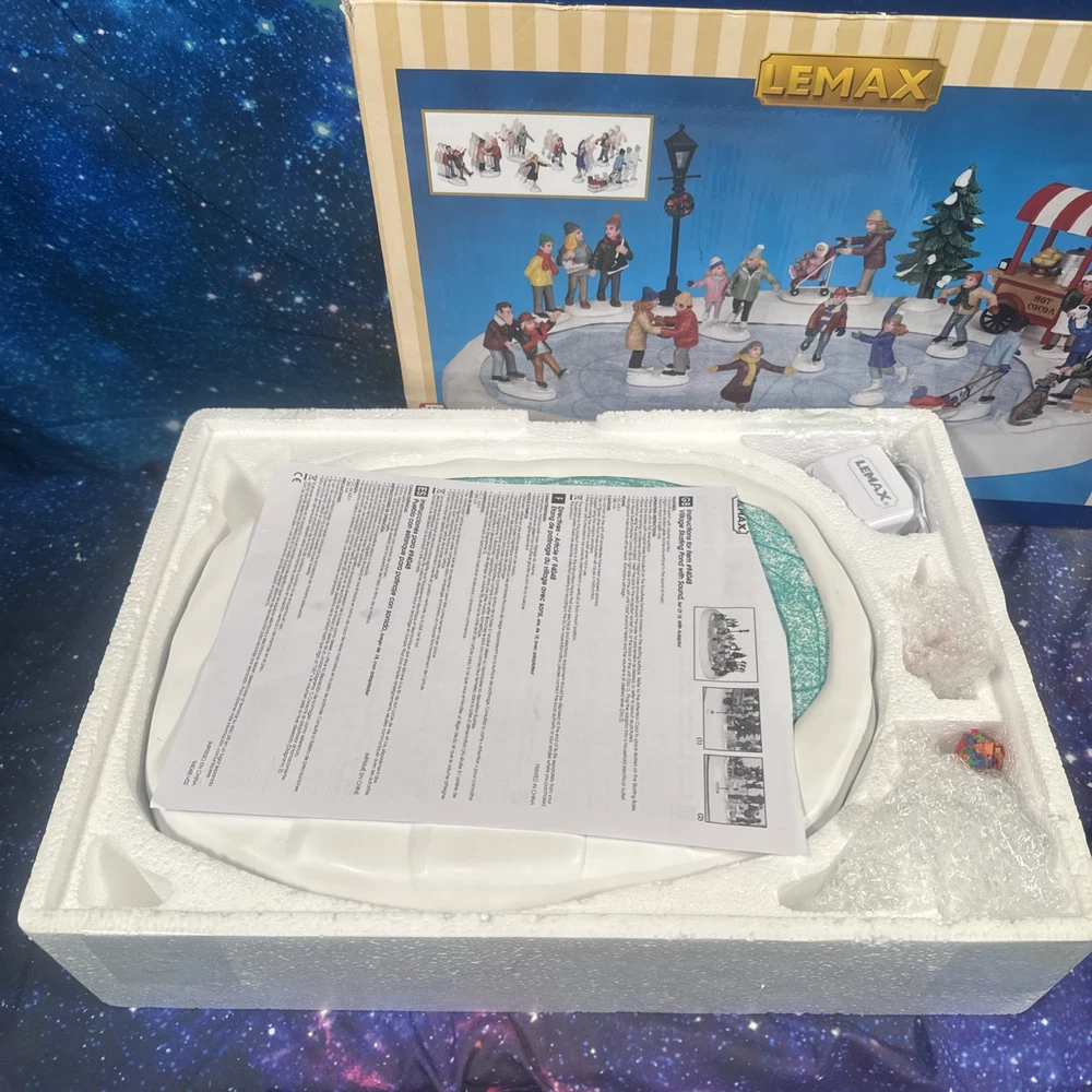 LEMAX Village Animated Skating Pond Christmas Decoration Please note set includes mains but is not working. Not sure if it’s just the mains or the base is faulty. Sold as display only. Also the hot cocoa stand is missing