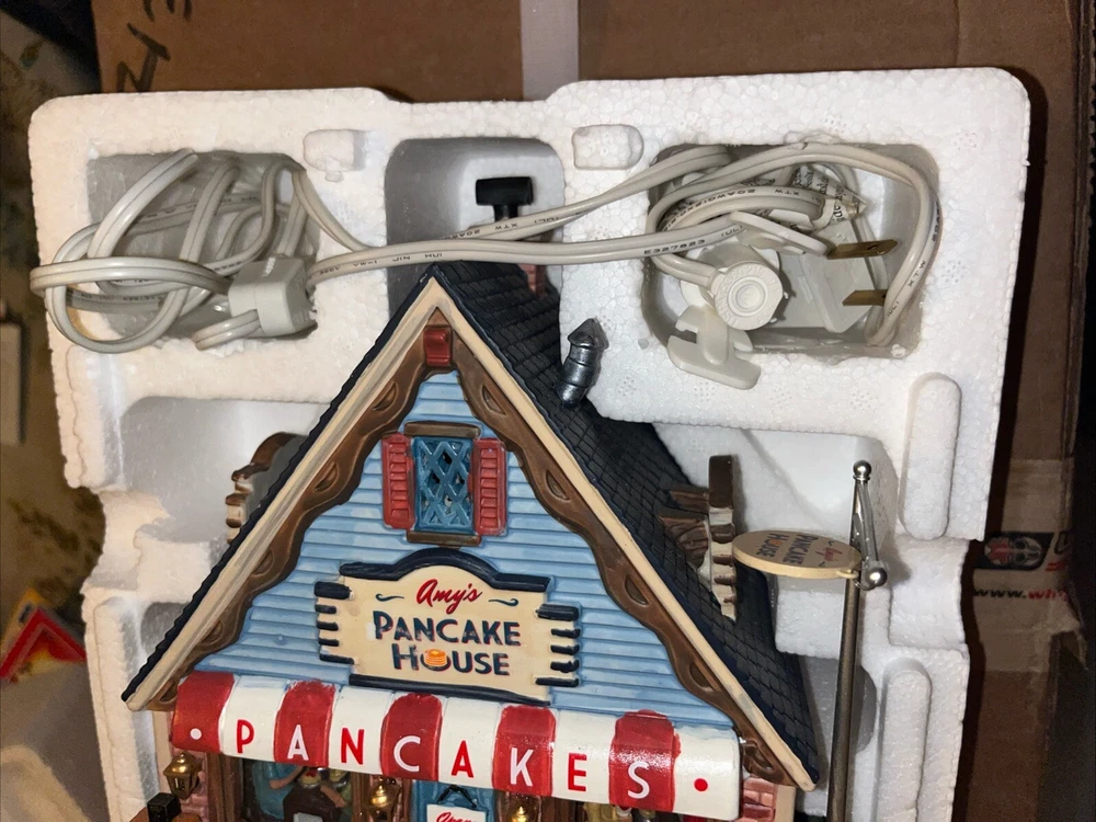 Very Minor flaw on store sign see pics. This product is a collectible porcelain house from the Lemax Signature Collection. It features Amy's Pancake House with intricate details and multicolor design. The house is illuminated and retired, adding to its charm. It was manufactured in 2014 and is an original piece. The house weighs 2 lbs and comes in its original packaging box.