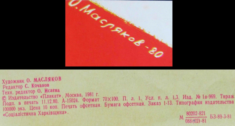 Original main slogan on the poster: ВАШИМ ТОВАРИЩ, СЕРДЦЕМ И ИМЕНЕМ -ДУМАЕМ, ДІШИМ, БОРЕМСЯ И ЖЕВЕМ! Literally English translation: VIA YOUR COMRADE HEART AND NAME, WE ARE THINKING, BREATHING, FIGHTING AND LIVING! POSTER ARTIST: MASLYAKOV OLEG DMITRIEVICH PRINT YEAR: 1981 SUBJECT: LENIN GLORIFYING LANGUAGE: RUSSIAN PRINT RUN: 100.000 PUBLISHED BY: "PLAKAT", MOSCOW SIZE: IN: 25 ¹/₂ x 38 ³/₁₆ = CM: 65 x 97 CONDITION: ROLLED MASLYAKOV OLEG DMITRIEVICH (1928-2008)- Soviet graphic artist, known mainly as a poster artist. Member of the Union of Artists of the USSR. Honored Artist of the RSFSR (1983). Oleg Dmitrievich Maslyakov was born in Sevastopol. Lived in Tula (1933-1953), studied at the art studio of N. I. Orekhov. He graduated from the Moscow Art School in memory of 1905, studied with S. Dobroserdov. During his studies, he was engaged in front film advertising in cinemas in Moscow, created the first political posters. Since 1957 he has been constantly working in the field of social and political posters. Collaborated with the workshop "Agitplakat" of the Union of Artists of the USSR, with publishing houses: "Soviet Artist", "Fine Art", "Soviet Russia", "Poster". He worked in the Workshop of visual agitation of the Union of Artists of the RSFSR. Since 1990 he has been painting. Author of a number of articles about the poster and the book of poems "To you" (M., 2004). Author of social and political posters: "Get ready for your journey, man!" (O.D. Maslyakov, E. S. Tsvik; 1960), "You cannot dare to spy today and in the future" (1960), "We are strong with one will, we swore an oath for peace!" (1961), "Youth to collective farms!" (all -1962), “I dedicate my flight to you, XXII Party Congress! Cosmonaut Major Titov "(1963)," Worker! Save a minute every day! " (1963), "Always ready for a new feat!" (1965), “Profitable Enterprise - Income. Beneficial for the plant - beneficial for the people! " (1966), "Profitable for the plant - profitable for the people!" (1966), Get Out of the Arab Land! (1968), "Sport is a faithful assistant in work" (1973), "Let's please the Motherland with new successes in 1974!" (1974), “May 1. We will overfulfill the tasks of the Motherland! " (1974), "The Army of the World is the Strongest of All!" (1980), "High organization, order, discipline - at every workplace!" (1984), "October - a new era in the history of mankind" (1986). Together with V. S. Ivanov, he performed a spectacular poster "All-Russian review of rural amateur performances" (1964). He was awarded the prize of the Soviet Peace Committee (1974, 1980), gold and silver medals of the Exhibition of Economic Achievements (1974, 1975, 1977, 1979, 1980). Was the chief artist of the "Plakat" publishing house (1985-1990). Laureate of the First Prize of the international competition "Poster for Peace" (1982), III prize of the poster competition for the X World Congress of Trade Unions in Prague (1982). Posters by O.D. Maslyakov are kept in the isofond of the Russian State Library (RSL), the State Museum of Political History of Russia (GMPIR), the Volgodonsk Ecological and Historical Museum, the Mordovian Museum of Local Lore named after I.D. Museum of Local Lore, National Museum of the Republic of Adygea, Nevyansk Historical and Architectural Museum, Rybinsk Museum-Reserve, Yaroslavl Art Museum (YAHM), Yaroslavl Museum-Reserve, in private Russian and foreign collections. www.facebook.com/sovietartposters Listing and template services provided by inkFrog