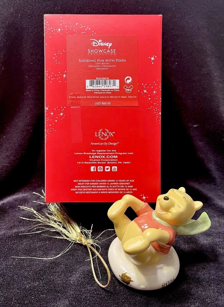 LENOX Disney Showcase Sledding Fun With Pooh 2016 Ornament, SKU 858745, Porcelain, Hand Painted, Accented in 24k Gold, Gold Rope Tassel is Detached