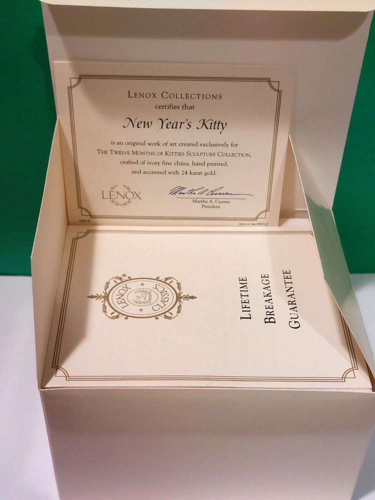 YES, I do combine on shipping even if ebay tells you I do not ! The Lenox "New Years Kitty" sculpture is crafted of hand painted Lenox ivory china accented with 24 karat gold. This from t he 12 Months of Kitties Sculpture Collection. The Kitty bears the Lenox hallmark and comes with the Certificate of Authenticity. The sculpture is about 4 inches tall and about 2 1/4 by 2 3/4 inches at the widest points This is NO LONGER AVAILABLE FROM LENOX it's Brand New, Never Displayed, Mint Condition in Original Lenox Box with COA Click here to see other CATS This item was just opened for the first time for Pictures and was checked for defects, it is Purrfect. If you have any questions feel free to ask Please check my listings for more Lenox collectibles. Yes, I do combine on shipping , multiple purchases can save you money on shipping. Payment must be received within 2 days of the purchase. Winning bidders must pay for the U.S. Mail delivery. With a cleared payment your package usually ships within 48 hours. Thanks for looking. --Yes, I do ship to APO and PO Boxes-- The shipping rate given does include insurance and tracking number.