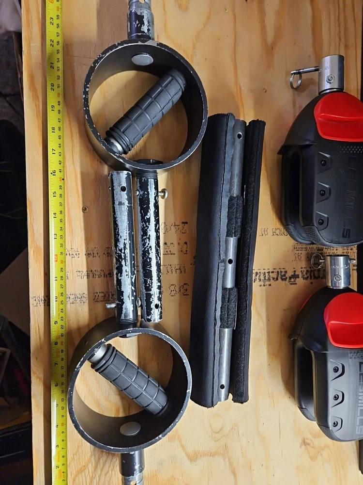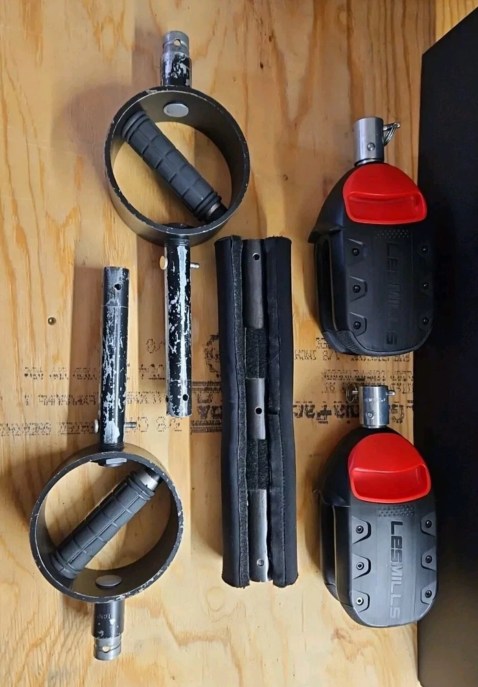 LES MILLS SMARTBAR Custom Set Clamps Breakdown Bar Kit Modular Read Look Unit max length is 61", shorter set point approximately 50". Modular packable workout bar it. See pictures. Includes 5 piece kit. With Zip close bag for storage as seen. Center padded bar. Two in line offset grip handles. Two end piece swivel Les Mills clamping ends. See pictures. Product will be shipped timely and packaged with care. Offers are encouraged. Please feel free to reach out with questions. Please see pictures. Thank you. Good used condition. Heavy paint wear from age and use. Markings from age and use. See pictures. Functional as it should. The LES MILLS SMARTBAR Custom Set includes modular weight plates and clamps for a full-body workout at the gym. The breakdown bar kit allows for easy assembly and adjustment during training sessions. Industrial shelf 1.