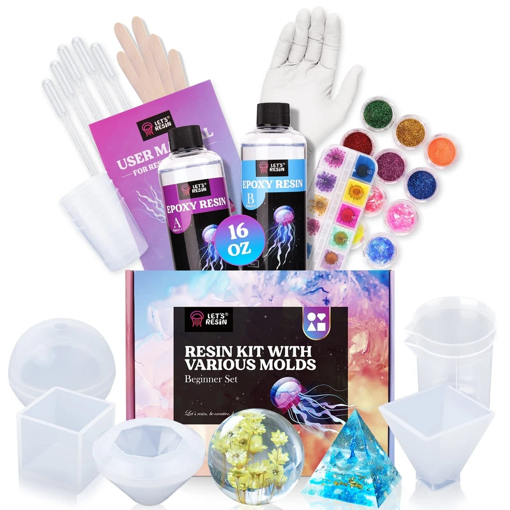 LET'S RESIN 16OZ Resin Molds Silicone Kit Complete Set Bundle with Sphere, Pyramid Molds, Resin Epoxy Starter Kit for Beginner Resin Casting Product Details Brand: LET'S RESIN Age Range (Description): Adult Color: purple Theme: Floral Item dimensions L x W x H: 3.15 x 1.97 x 1.97 inches Brand: LET'S RESIN Age Range (Description): Adult Color: purple Theme: Floral Item dimensions L x W x H: 3.15 x 1.97 x 1.97 inches Material: Resin, Silicone Seasons: All Seasons Included Components: Molds Item Weight: 16 Ounces Size: CA10223 Number of Pieces: 4 Style: Box Model Name: resin Special Feature: Resin starter kit with molds, epoxy resin, glitter set, and dried flowers Art Craft Kit Type: Resin Kit Manufacturer: LET'S RESIN Product Dimensions: 3.15 x 1.97 x 1.97 inches Item model number: 1 Item Weight: 1 pounds Country of Origin: China Date First Available: June 29, 2021 All in One Epoxy Resin Kit: Dive into resin art with our complete kit featuring 4 versatile silicone molds, 16oz of premium epoxy resin, a dazzling 12-color glitter set, 12 real dried flowers, and essential tools like measuring cups, wooden sticks, gloves, and droppers. Perfectly tailored for beginners, ensuring a seamless start to your resin art journey. High-Quality Epoxy Resin: The eposy resin kit includes 16oz of specially formulated epoxy resin, comprising 8 oz resin part and 8 oz hardener part. With a simple 1:1 volume ratio mix, achieve flawless results without the worry of fisheye or unevenness. It usually takes 8-24 hours to cure in summer and longer in winter. When using resin in winter, please warm the resin by water bath first and keep the working surface warm as well Superior Silicone Molds: LET'S RESIN silicone molds boast exceptional quality, crafted from safe and durable silicone material with superior tear strength. Designed for longevity, these molds maintain precise shape, ensuring your art remains flawless. Compatible with various casting materials including epoxy resin, soap, wax, and more. Dried Flowers and Vibrant Glitters: Elevate your resin creations with our collection of 12 dried real flowers and an array of colorful glitters and sequins. Perfect for crafting stunning resin jewelry such as pendants, rings, bracelets, or adding flair to any project. Unleash your creativity and design unique pieces that reflect your style. Perfect Gift for Creativity: Our resin starter kit comes packaged in a beautifully designed box, making it an ideal gift for birthdays, anniversaries, or Christmas. Comes with a comprehensive tutorial, it's perfect for beginners looking to master resin art. Have questions? We're here to helpreach out to us anytime for assistance.