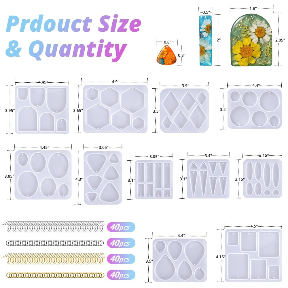 LET'S RESIN Resin Earring Mold, 171 Pcs Resin Jewelry Molds Making Kit with 11 Pack Variety Shape Silicone Molds, Earring Molds for Epoxy Pendant, Earrings, Necklace, Keychains Product Details Brand: LET'S RESIN Age Range (Description): Adult Color: 11 pcs earring molds Theme: Jewelry Item dimensions L x W x H: 4 x 4 x 2 inches Brand: LET'S RESIN Age Range (Description): Adult Color: 11 pcs earring molds Theme: Jewelry Item dimensions L x W x H: 4 x 4 x 2 inches Material: Metal, Silicone Seasons: Winter Included Components: Molds Number of Pieces: 171 Style: Retro Model Name: ELR00224 Special Feature: Variety of shapes and designs, reusable, easy to use and demold Art Craft Kit Type: Resin Craft Kit Manufacturer: LET'S RESIN Product Dimensions: 4 x 4 x 2 inches Item model number: ELR00224 Item Weight: 8.8 ounces Date First Available: March 14, 2023 171 PCS RESIN EARRING KIT - This kit comes with everything you need to make your own dope resin earrings, there are 11epoxy resin molds and 160 metal pieces, including 80 gold and silver jump rings and 80 earring hooks. With all these sets, you can make up to 80 pairs of earrings with all sorts of cool designs pendants. SIMPLE & CLASSIC SHAPES - These resin earring molds silicone each piece has a different shape, each silicone molds for epoxy resin has 6-8 cavities of varying sizes. Using them to make resin earrings can be very versatile, for example small rounds with large ovals you can get a lively and elegant style, etc. Get your hands on our resin epoxy molds earring kit today and start creating your own gorgeous, personalized jewelry. A GIFT FOR ANY OCCASION - Whether you're looking to start your own small business or want to create personalized gifts for girls, women, girlfriends, wife, best friends, grandmother, mother, family, etc. on special occasions such as Christmas, birthdays, anniversaries, Mother's Day, Valentines Day, Graduation or Wedding, our earring resin molds kit has everything you need to get started. EASY TO USE AND DEMOLD - Made of premium silicone, our epoxy silicone molds are flexible, reusable, and easy to use, clean and demold.They feature a glossy interior to ensure wonderful finishes of your earrings.Torch or heat gun are not recommended as they may cause damage. WHY CHOOSE US: With years of focusing on epoxy resin molds, LET'S RESIN is committed to providing crafters with tools and materials to turn imagination into reality. Strictly control product quality and attach great importance to the consumer experience. If you have any problems, please contact us ASAP. We will do our best to solve it for you.