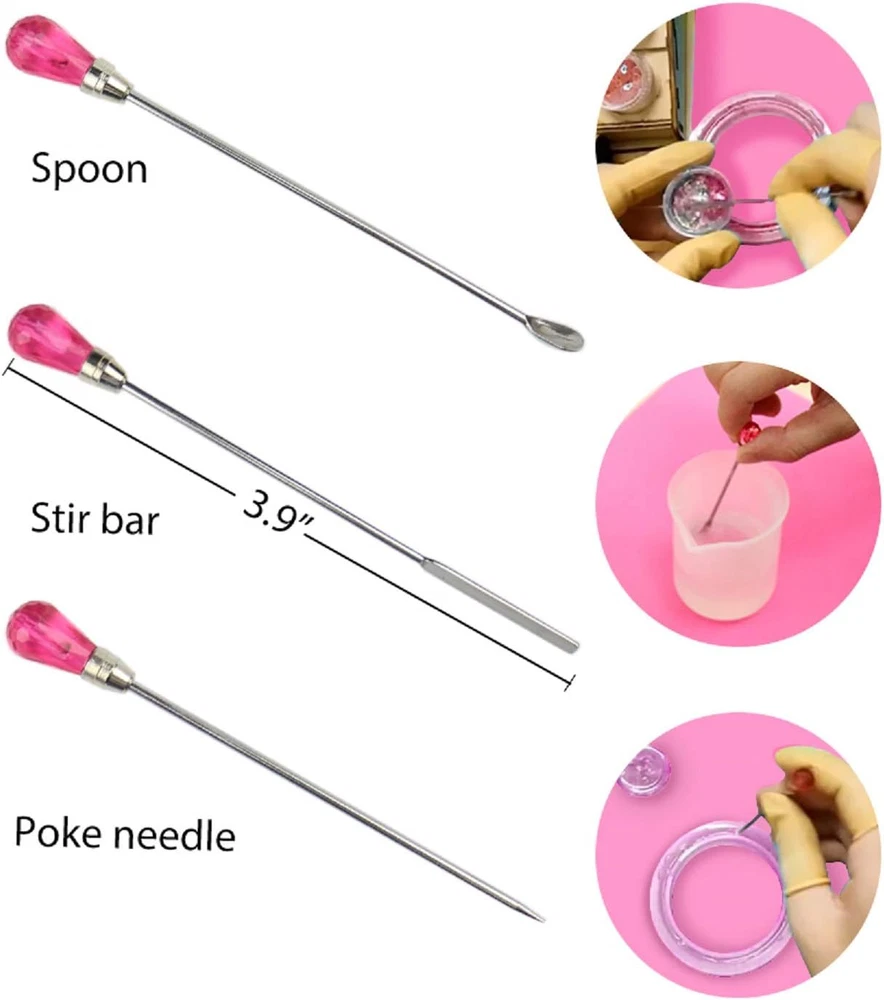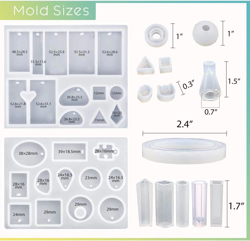 RESIN KIT FOR BEGINNERS: 16 Pcs jewelry molds/100pcs screw eye pins/3pcs metal stirring rods/5pcs plastic droppers/10 pcs finger cots. English Manual is included, the perfect combination for making resin jewelry, resin charm making. A must-have Kit for the jewelry DIY lover or handicraft or the newbie to the resin, you could make your unique Christmas, birthday, new year gifts for your friends and family. HIGH QUALITY: These resin jewelry molds are with smooth and shiny interiors, very flexible and durable, make it reusable. DURABLE RESIN SILICONE MOLDS After your project is fully cured,it will be easy to pop out of your resin molds with ease. WIDE APPLICATION: These resin jewelry making kit have a variety of shapes and designs of resin molds, add some resin pigment, resin dye and embed different kinds of embellishments or fillers, great for making resin jewelry, resin charms, resin earrings, resin pendant, resin bracelet, resin bangle. PRACTICAL TOOLS: The metal stirrers are made of stainless steel with diamond shape head, able to scoop, stir and mix the resin, or scoop out the resin decorations like glitter powder and the paillette. You can also use it as nail art tools. 100% Satisfaction Guarantee: please feel free to contact us at any time if you have any doubt for these resin molds for jewelry. LET'S RESIN strives to offer you 100% satisfaction. Package Include: 2 Pcs x Resin Jewelry Molds 5 Pcs x Pendant Resin Molds 1 Pcs x Bracelet Resin Molds 1 Pcs x Diamond Resin Molds 1 Pcs x Mini Cone Molds 4 Pcs x Earrings Resin Molds 1 Pcs x Mini Sphere Molds 1 Pcx x Ring Molds 3 Pcs x Metal Stirring Rods 5 Pcs x Plastic Droppers 100 Pcs x Screw Eye Pins 10 Pcs x Finger Cots 1 x English Manual included