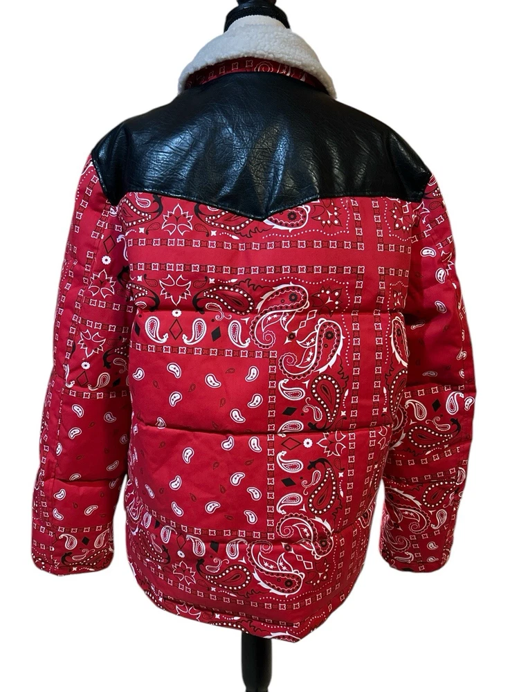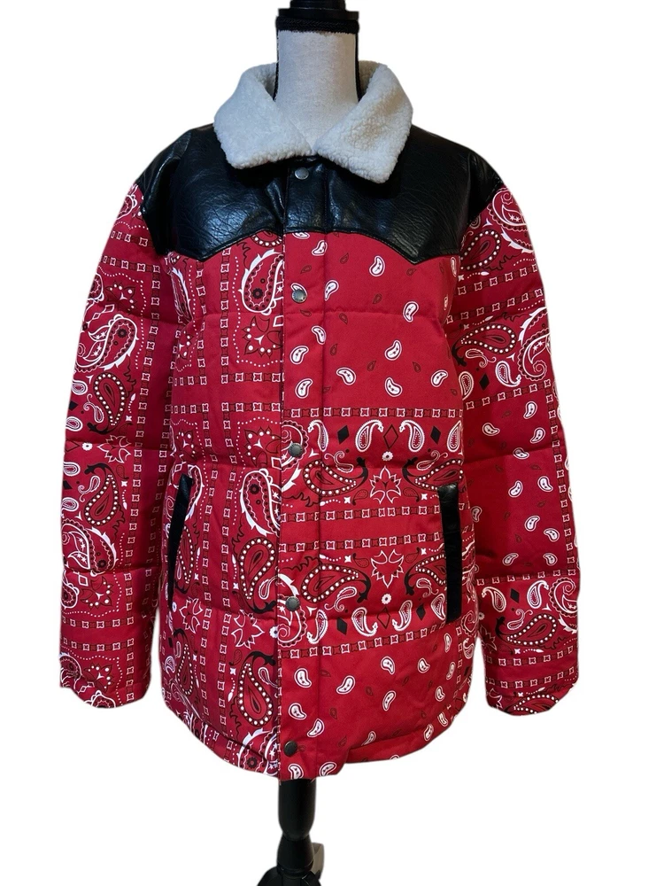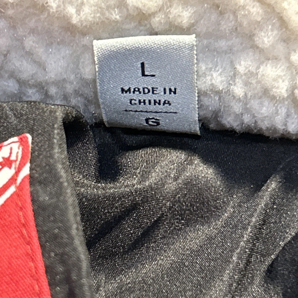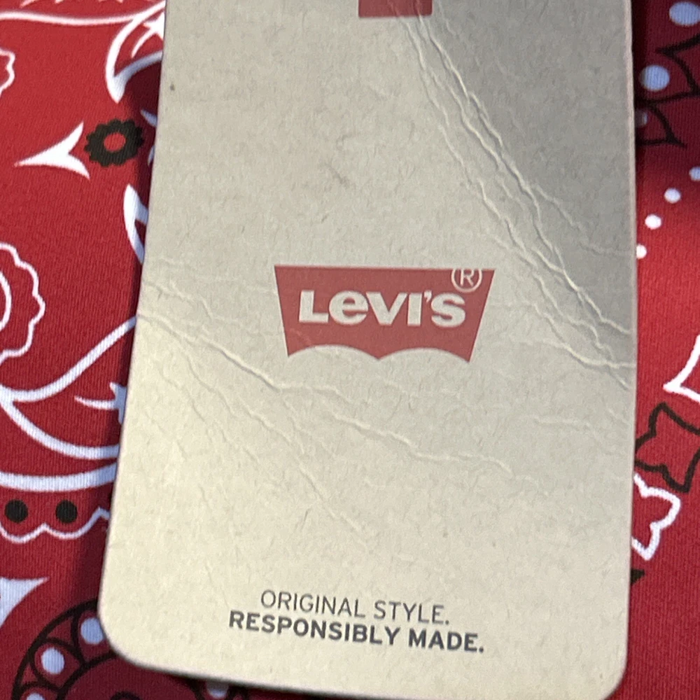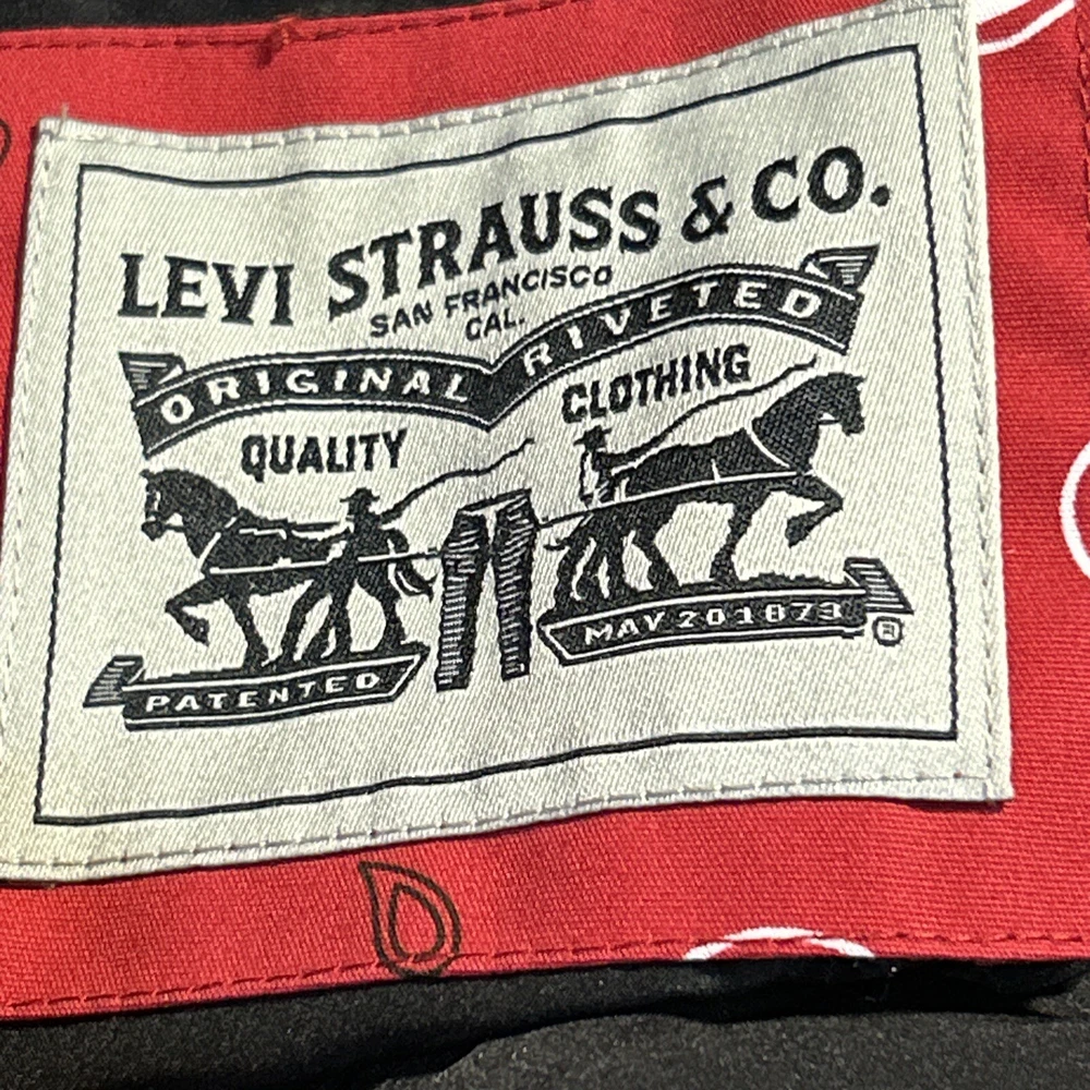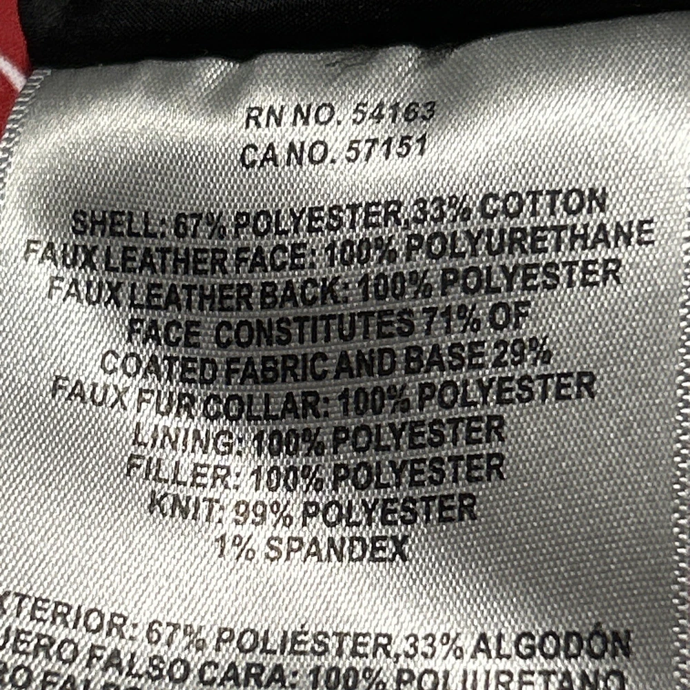 67% Polyester, 33% Cotton FUNCTIONALITY: Center front zipper closure with snap button overlay, two lower welt pockets, one interior safety pocket STYLISH FEATURES: Contrast faux leather yoke, sherpa lined collar, Levi's red tab logo at lower left seam WARMING FEATURES: The quilted paneling is filled with faux down insulation to trap in body heat