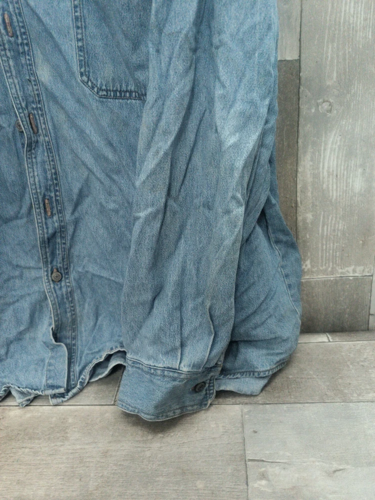This vintage Levi's Red Tab denim shirt is a must-have for any fashion-savvy man. With a solid blue color and distressed detailing, this shirt is perfect for a casual, preppy look. The long sleeves and collared neckline make it suitable for all occasions, from work to parties. Made from comfortable, machine-washable cotton, this shirt features a spread collar and embroidered logo accents. The size is XXL, and it is part of the Levi's Red Tab product line. Whether you're going for a Western or classic look, this shirt is the perfect addition to your wardrobe.