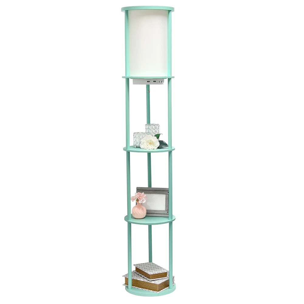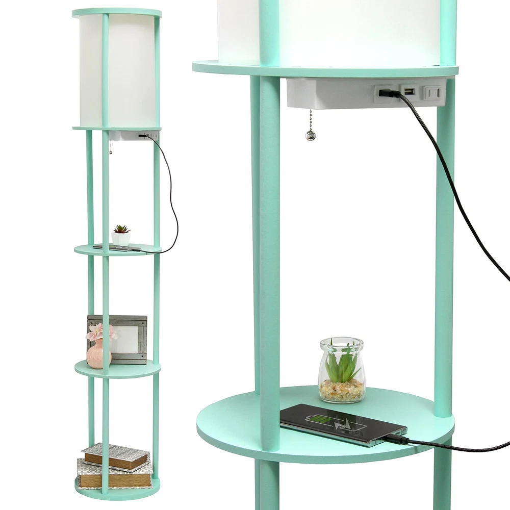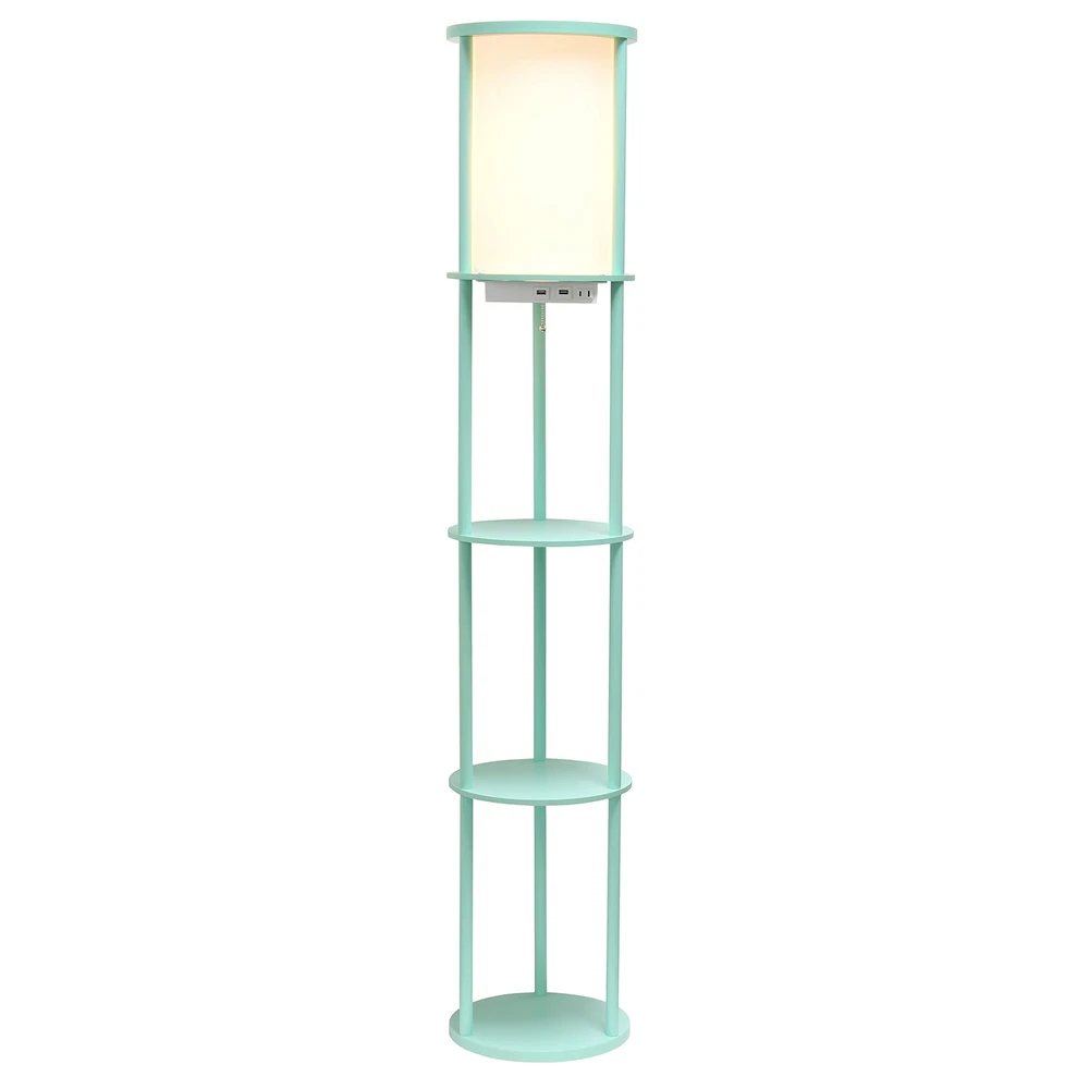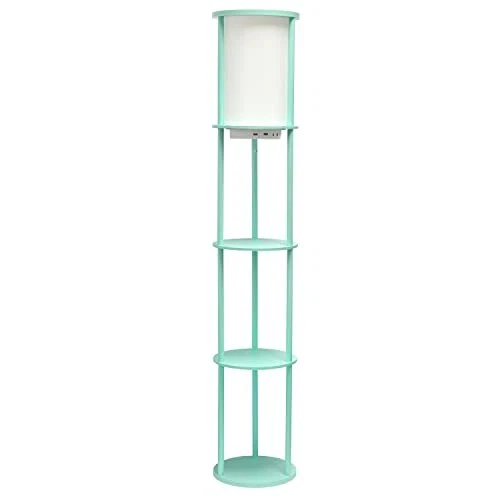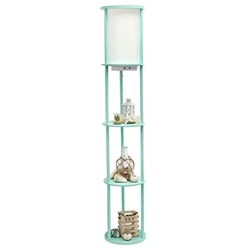 Elevate your living space with this stylish yet functional 3-shelf floor lamp. lluminate your room, showcase your favorite decor, and charge your essential electronic devices at the same time! This gorgeous piece adds versatility as the shelves can be used to display photographs and other memorabilia while the linen lamp shade casts a soft, warming light throughout your living space. This lamp adds sophistication and style to any home's décor. Check out all of the available base finish color options available to suit your needs. MODERN DESIGN: The beautiful linen shade complements the soft curves and aqua finish for a simple yet modern look that works well with all décor. The white shade casts a soft charming glow illuminating your favorite books or pictures displayed on the shelves. A convenient pull chain on/off switch is located directly under the shade for easy access. TECH READY: This lamp is equipped with 2 output 5V 2A USB ports and 1 outlet, perfect for charging all of your electronic devices all in spot! BUILT-IN SHELVES: Stay organized while showcasing your favorite pictures, books or candles on the 3 built-in shelves. Form and function come together to make a true statement piece for your home. ASSEMBLY REQUIRED: Phillips Head Screwdriver is required but not included with your purchase. Instruction manual is included. BULB REQUIREMENT SOLD SEPARATELY: This floor lamp uses 1 x 100W equivalent Type A medium base bulb, which is not included in your purchase but can be easily found online or your local hardware .