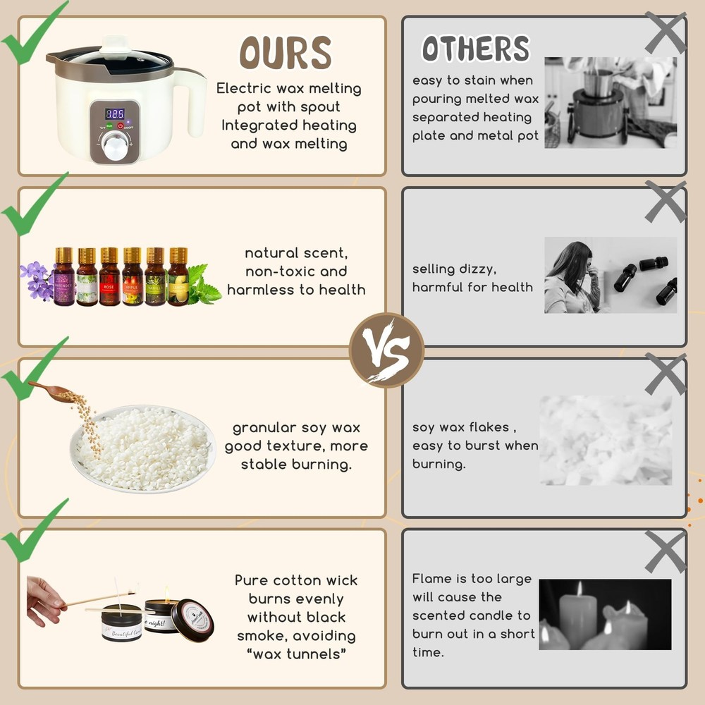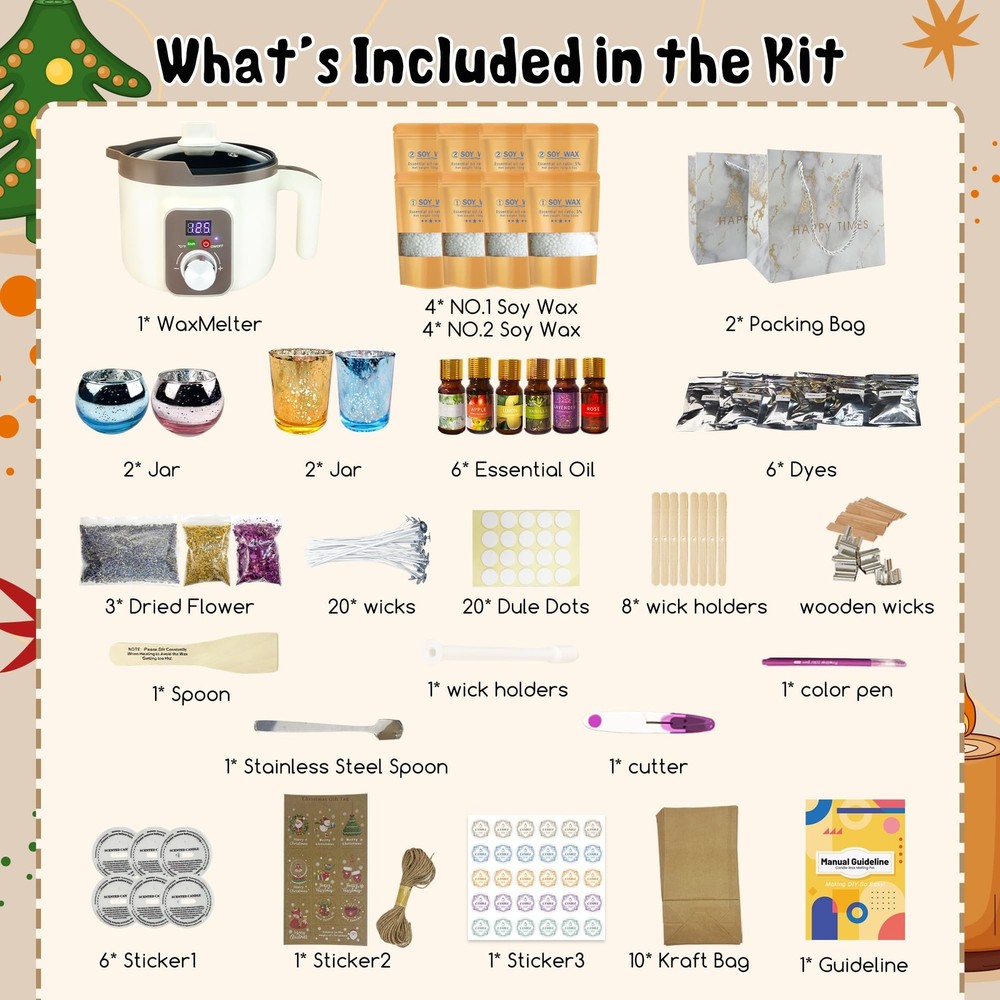 LFISGNN DIY Complete Candle Making Kit with Smart Wax Melter, Candle Making Supplies and Packaging Supplies Full-Set Kit for Making Candles for Art & Craft Product Details Color: Complete Kit with Candle Glass Brand: LFISGNN MPN: CMK-Brown-US UPC: 745431985884 EAN: 0745431985884 Brand: LFISGNN Age Range (Description): Adult Color: Complete Kit with Candle Glass Theme: Fantasy Item dimensions L x W x H: 8 x 7 x 6 inches Brand: LFISGNN Age Range (Description): Adult Color: Complete Kit with Candle Glass Theme: Fantasy Item dimensions L x W x H: 8 x 7 x 6 inches Seasons: All Seasons Included Components: Smart Wax Melter, candle making supplies, packaging supplies, soy wax, beeswax, paraffin wax, gel wax, candle containers, wicks, fragrance oils, dye, instruction booklet Style: Modern Model Name: CMK-Brown-US Art Craft Kit Type: Candle Making UPC: 745431985884 Manufacturer: LFISGNN Product Dimensions: 8 x 7 x 6 inches Item model number: CMK-Brown-US Item Weight: 7.3 pounds Country of Origin: China Date First Available: December 4, 2024 Save Your Time and Energy: LFISGNN Newly updated candle making kit with electirc wax melter and lots of candle making supplies,suitable for beginners not sure what to buy to start your candle-making journey.Only one kit slove all your problems