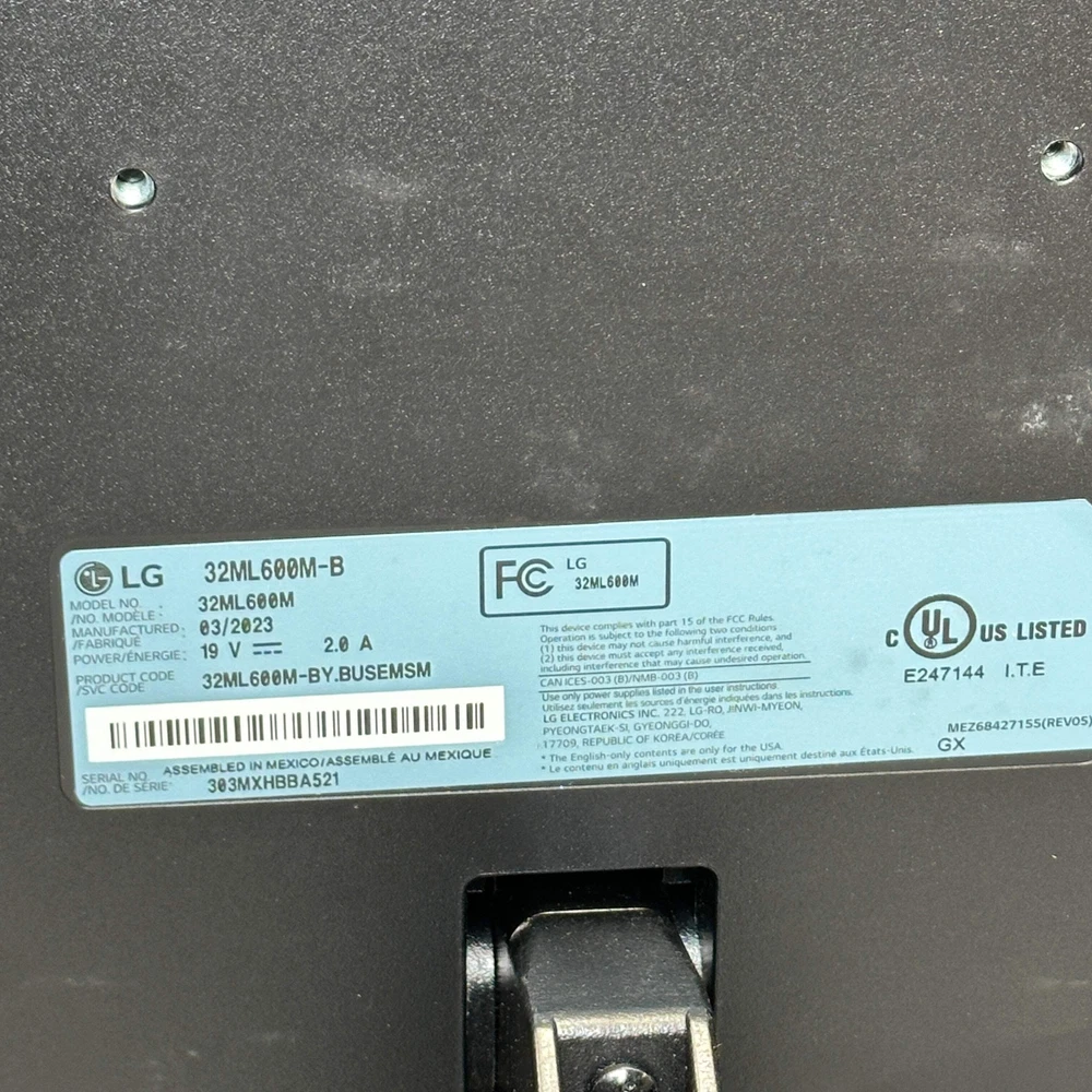 Item available today is the, LG 32ML600M-B 32” HD IPS LED HDR 10 Monitor - Black . This is a new monitor in open box . I opened the factory sealed box for photos. Ready for use. Please see photos for more details. Items in photos are what come with the listing. Thank you for shopping small business. Terms of Sale Listing is for item and/or accessories shown in photos only. Some states may require a tax be charged at the time of checkout, this is eBay automated. We ship and answer questions Mon-Fri 8am-4pm EST . We stand behind our products and would be happy to assist you if you experience an issue. Please contact us first. We ship to your confirmed PayPal address only using UPS or USPS. Items over $200 may require signature upon delivery. There are no returns on items sold for parts. A RESTOCK FEE UP TO 20% MAY BE CHARGED FOR RETURNS THAT ARE NOT OF FAULT OF THE SELLER OR ITEMS NOT RETURNED IN THE SAME CONDITION. Thank you for shopping small business! Shipping Information Only ships within the Continental United States with one business day processing time. LM 11 /18/2024 ( E1 )