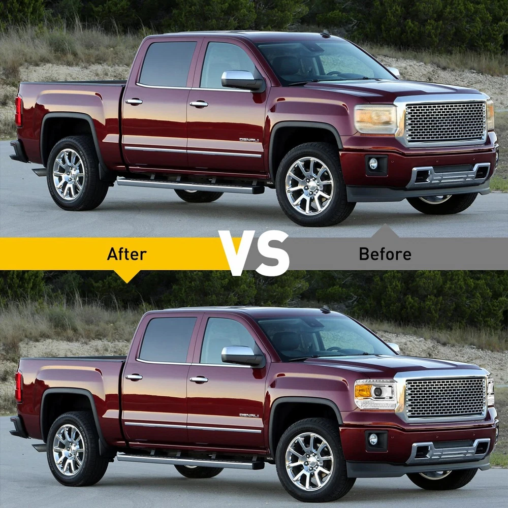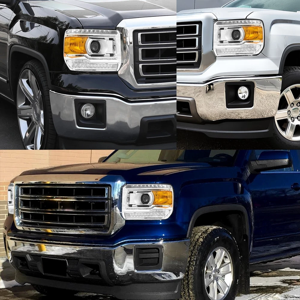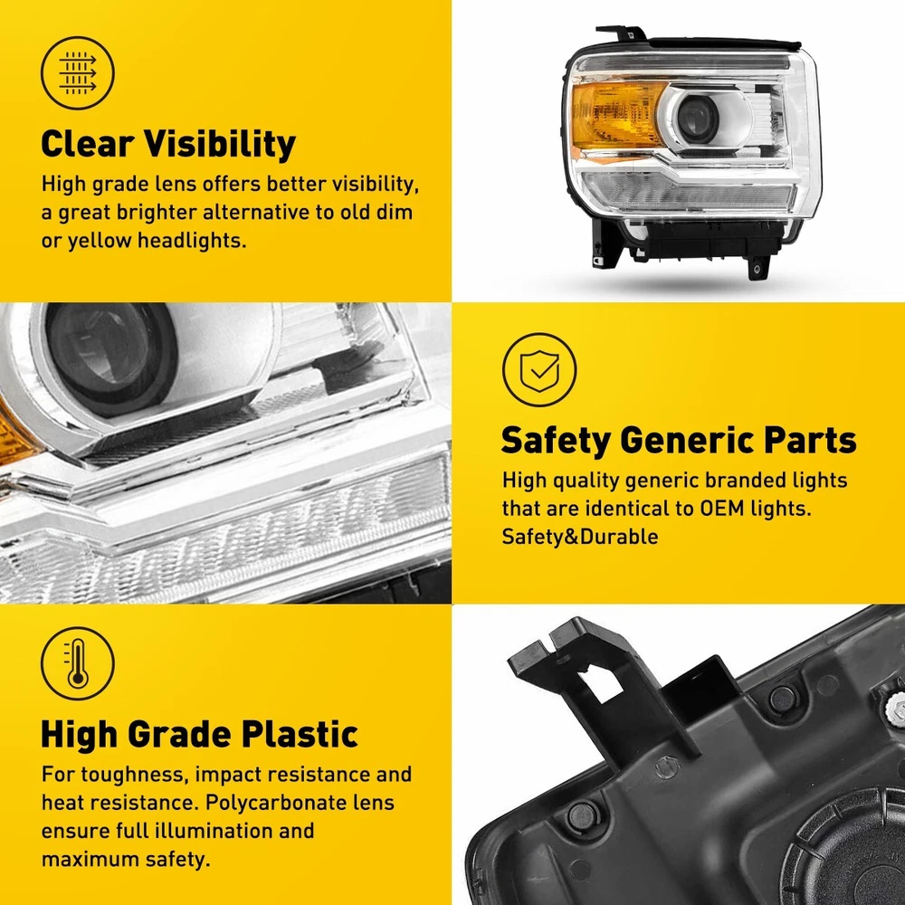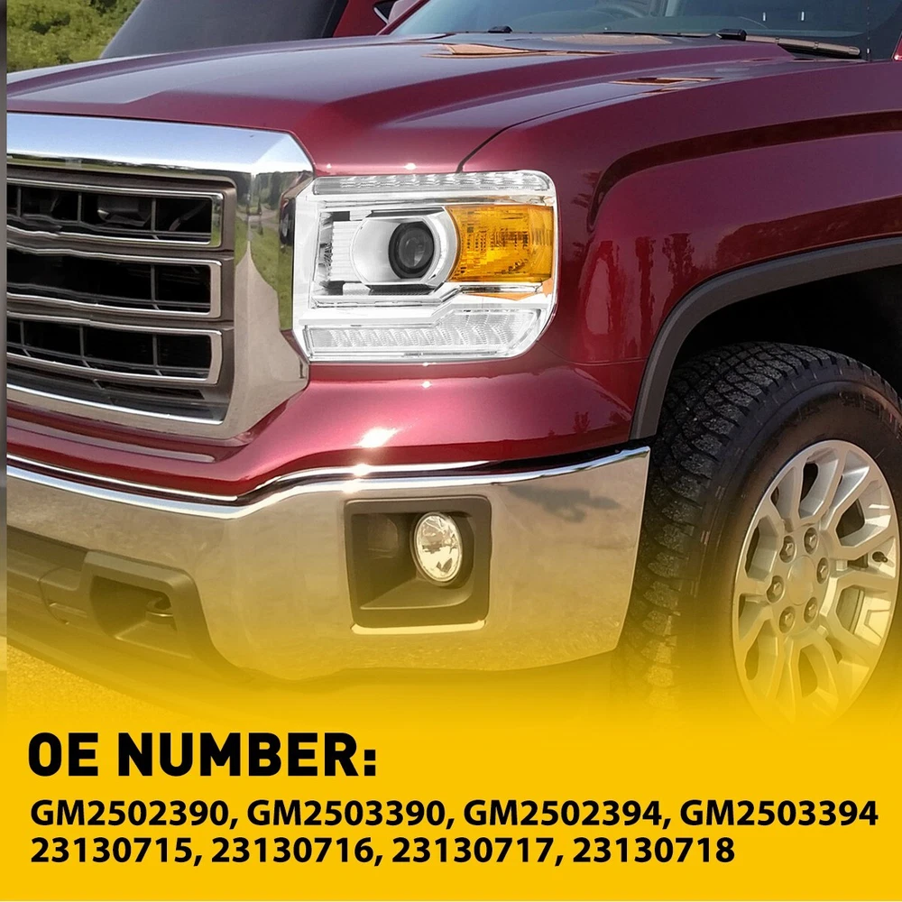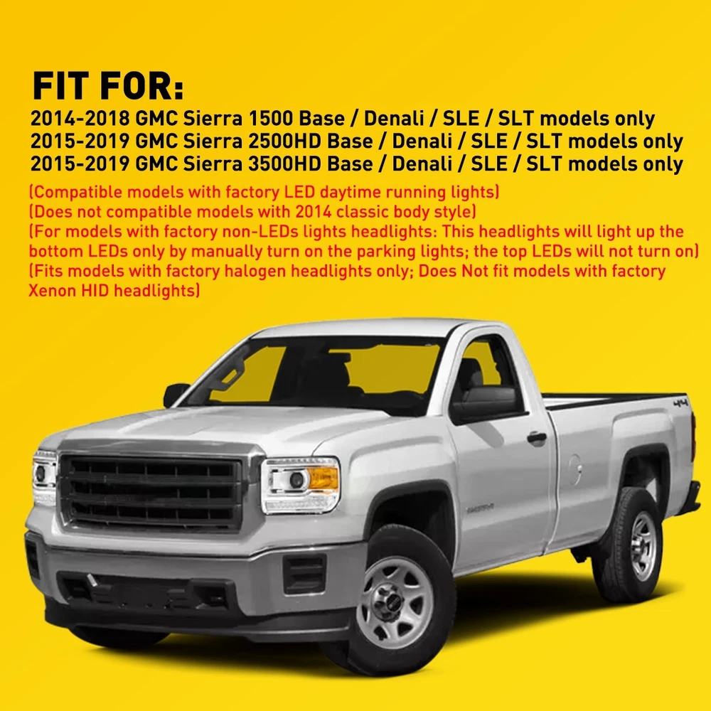 Fit for: 2014-2018 GMC Sierra 1500 Base / Denali / SLE / SLT models only 2015-2019 GMC Sierra 2500HD Base / Denali / SLE / SLT models only 2015-2019 GMC Sierra 3500HD Base / Denali / SLE / SLT models only (Compatible models with factory LED daytime running lights) (Does not compatible models with 2014 classic body style) (For models with factory non-LEDs lights headlights: This headlights will light up the bottom LEDs only by manually turn on the parking lights; the top LEDs will not turn on) (Fits models with factory halogen headlights only; Does Not fit models with factory Xenon HID headlights) Specifications: OE number: GM2502390, GM2503390, GM2502394, GM2503394 LH+RH For 2014-2018 GMC Sierra 1500 2500 3500 Amber LED DRL Head Lights Headlamp Fit for: 2014-2018 GMC Sierra 1500 Base / Denali / SLE / SLT models only 2015-2019 GMC Sierra 2500HD Base / Denali / SLE / SLT models only 2015-2019 GMC Sierra 3500HD Base / Denali / SLE / SLT models only (Compatible models with factory LED daytime running lights) (Does not compatible models with 2014 classic body style) (For models with factory non-LEDs lights headlights: This headlights will light up the bottom LEDs only by manually turn on the parking lights; the top LEDs will not turn on) (Fits models with factory halogen headlights only; Does Not fit models with factory Xenon HID headlights) Specifications: OE number: GM2502390, GM2503390, GM2502394, GM2503394 23130715, 23130716, 23130717, 23130718 Material: ABS+PC (ABS Plastic Housing/Polycarbonate lens) Appearance color: 1.Housing Color: Chrome 2.Lens Color:Clear 3.Reflector Color:Amber Note: Projector √(Include) DRL √ (Include) Bulb × (Not include) Features: *Easy to install: Direct replacement, drilling and cutting are not required. *Superior quality: Made of ABS and PC materials with toughness and heat resistance functions to ensure its long service life and durability. *Angle adjustment: Equipped with a headlamp Angle adjustment knob, you can adjust the best Angle of view through the knob. *Suggestion: 1.Please confirm the OE number before purchasing!!! 2.Professional installation is required!!! Packaging include: Headlights*2(Left+Right) ABOUT US LH+RH For 2014-2018 GMC Sierra 1500 2500 3500 Amber LED DRL Head Lights Headlamp Fit for: 2014-2018 GMC Sierra 1500 Base / Denali / SLE / SLT models only 2015-2019 GMC Sierra 2500HD Base / Denali / SLE / SLT models only 2015-2019 GMC Sierra 3500HD Base / Denali / SLE / SLT models only (Compatible models with factory LED daytime running lights) (Does not compatible models with 2014 classic body style) (For models with factory non-LEDs lights headlights: This headlights will light up the bottom LEDs only by manually turn on the parking lights; the top LEDs will not turn on) (Fits models with factory halogen headlights only; Does Not fit models with factory Xenon HID headlights) Specifications: OE number: GM2502390, GM2503390, GM2502394, GM2503394 23130715, 23130716, 23130717, 23130718 Material: ABS+PC (ABS Plastic Housing/Polycarbonate lens) Appearance color: 1.Housing Color: Chrome 2.Lens Color:Clear 3.Reflector Color:Amber Note: Projector √(Include) DRL √ (Include) Bulb × (Not include) Features: *Easy to install: Direct replacement, drilling and cutting are not required. *Superior quality: Made of ABS and PC materials with toughness and heat resistance functions to ensure its long service life and durability. *Angle adjustment: Equipped with a headlamp Angle adjustment knob, you can adjust the best Angle of view through the knob. *Suggestion: 1.Please confirm the OE number before purchasing!!! 2.Professional installation is required!!! Packaging include: Headlights*2(Left+Right) FAQ Shipping Returns Contact Us Payment Why swith to LED? LEDs not only give your vehicle a clean, modern look but, with proper use, will outlast any halogen bulb and HID bulb! Low energy draw, high lumen output, and instant on/off LED technology out shines stock bulbs in every way. Which bulbs are used in my vehicle? Check Sylvania automotive lamp replacemnt guide , you can select the year, make, and model of your vehicle, then select the application you want to replace or upgrade from stock. What does CAN Bus mean? CAN Bus means Controller Area Network Bus. This system monitors your vehicle and reports operating conditions. CAN Bus systems are commonly found in European vehicles such as BMW, Audi, Mercedes, Volkswagen, Porsche, and in many American vehicles. While most late model American vehicles have CAN Bus systems, it is always good to check with your vehicle dealer to see which system your vehicle has before purchasing electrical products. When do you need Warning Canceller? Some vehicles with cmplex internal computers(such as Audi,BMW,Jaguar,Mercedes,etc.) might report on-dash errors or flickering on the headlights. The warning canceller fixes the dashboard warning and flickering effect. Bulb Out Dashboard Error: On some vehicles, the dashboard will report as if you have a headlight bulb missing or burnt. It does not affect the headlights functioning, but the light on-dash will be on. The warning canceller fixes the issue. Flickering Issue: This happens when your vehicle does not recognize the new headlights installed. When turning the headlights on, the vehicle's computer does not understand the signal back from the headlights hence thinking they are still off. This triggers the headlight flickering effect. The warning canceller solves this issue. LED Advantages: Very low and efficient energy consumption than halogen bulbs & HID Bulbs Compared with HID bulbs, LED bulbs Light up instantly, no warm up period Low voltage protection, high precision constant current driver chip Longer lifespan than HID and halogen bulbs Light can be controlled easily in color and intensity Easy to install a LED headlight conversion kit (1) We will ship your item(s) within 24 hours. (2) We ship this item to US only via USPS first class mail. It usually takes 3-6 working da