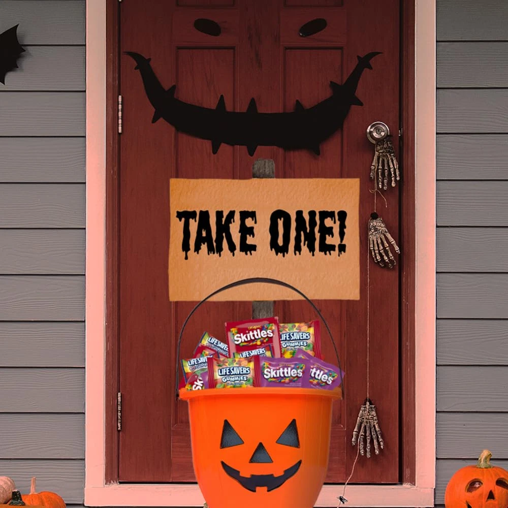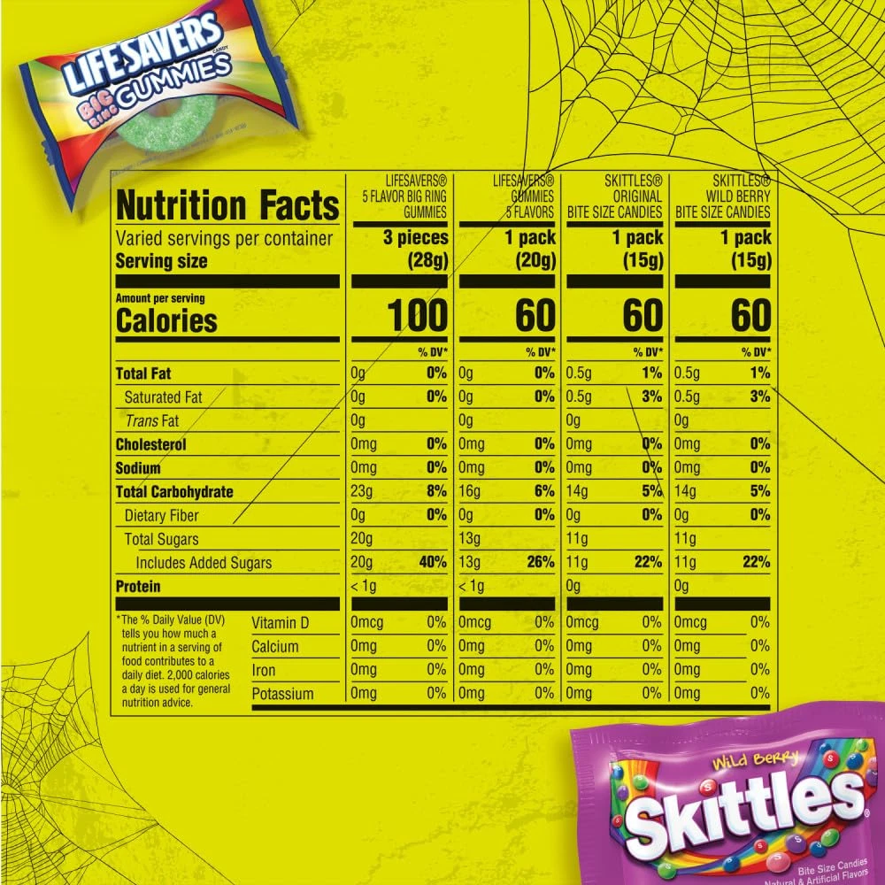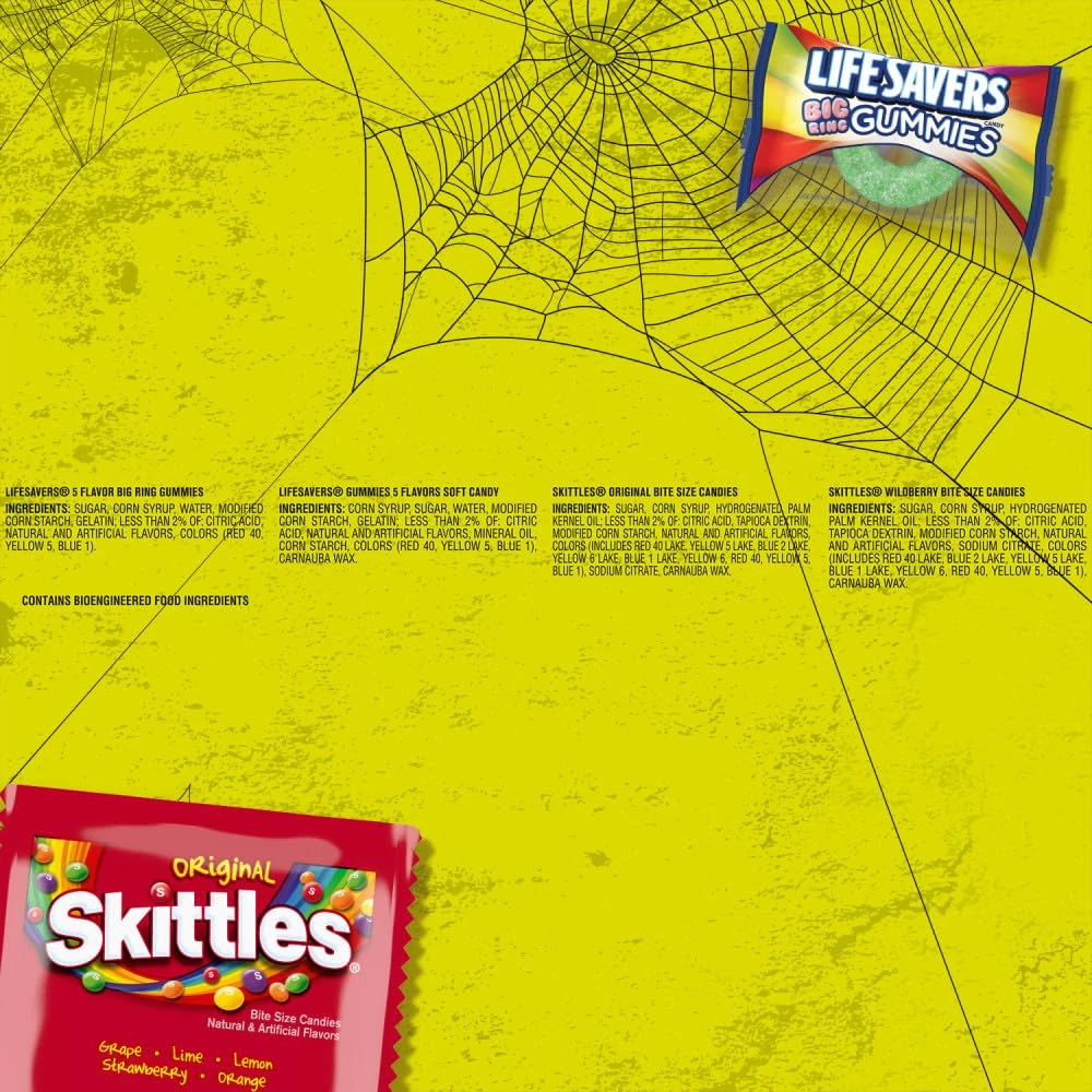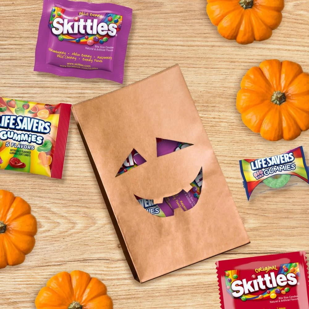 Contains one (1) 18.56-ounce bulk bag filled with 35 pieces of fun size SKITTLES Original, fun size SKITTLES Wild Berry, fun size LIFE SAVERS Gummies, and LIFE SAVERS Big Ring Gummies Halloween Candy Fill your candy cauldron with this delicious assortment of fruity, chewy, and gummy candy to have your neighborhood ghouls and goblins lining up at your doorstep Hosting a Halloween Bash? Fill boo bags and treat bags with this bewitching mix of chewy and gummy fruity treats Swap out the popcorn bowl for a candy cauldron filled with fruity, chewy, and gummy treats at your next scary movie night with pals Bring Treat Season to the office by filling the office candy dish with a bewitching selection of SKITTLES & LIFE SAVERS Halloween Candy Get ready for Treat Season with this 35-piece bulk variety bag of SKITTLES Original, SKITTLES Wild Berry, LIFE SAVERS Gummies, and LIFE SAVERS Big Ring Gummies Halloween Candy. Whether you're hosting a Halloween Bash or prepping treat bags for trick-or-treaters, this collection offers a bewitching assortment of fruity treats. With flavors to satisfy every ghost and ghoul, this bulk variety candy bag guarantees plenty of treats for all your Halloween festivities. Don't miss out—grab your SKITTLES & LIFE SAVERS Halloween Fruity Candy Variety Bulk Bag today!