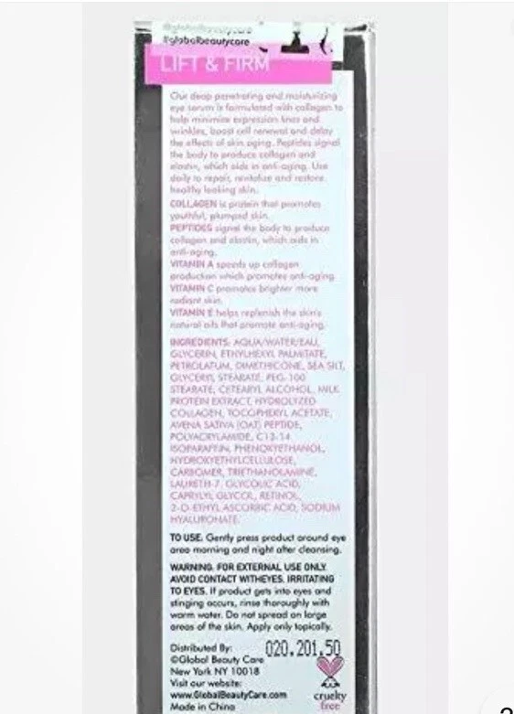 Features:Paraben-FreeMPN:NoneScent:NoneBody Area:EyesBrand:Collagen ++Department:Unisexgtin13:0814655035368Type:Day & Night TreatmentIngredients:CollagenUPC:0814655035368Size:RegularSkin Type:All Skin TypesCountry/Region of Manufacture:ChinaFormulation:CreamMain Purpose:FirmingVolume:0.5 fl oz