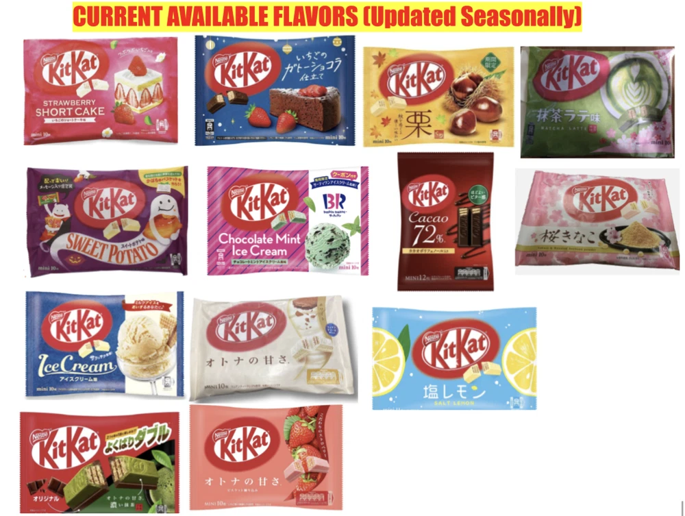 JAPAN EXCLUSIVE Nestle KitKat Flavors- changes seasonally!! DO CHECK BACK - this listing will be updated based on changes in seasonal options available! PLEASE NOTE: The base price for shipping this item is ~$10 from Japan (to the US), and goes up by about $3 for each additional bag added. As many locations have taxes charged on items (but not always shipping), the price has been adjusted to be more affordable to people in these locations. **Spring 2024 Note: Current exchange rate means shipping prices are LOWER than usual! In order to allow for those that have taxes applied to their purchased items (but not shipping costs), we're offering the current discounted item price without any change to the shipping cost for a LIMITED TIME based on the USD/JPY exchange rate! THIS PRICE WILL CHANGE once the exchange rate goes back up!!** Current Flavors Available (all bags 10 mini bars per unless otherwise stated): 'Adult' (low sweetness) Strawberry [white chocolate] Best by October 2024 or later [depending on stock] 'Adult' (low sweetness) Fiantine [white chocolate] Best by 2025[depending on stock] SOLD OUT Strawberry Gateau Chocolat [milk chocolate] SOLD OUT Sweet Potato (Halloween special) [white chocolate] DARK 72% Cacao [dark chocolate] Best by 2025 (depends on purchase date) *12 Piece Bag* NEW JANUARY RELEASE Strawberry ShortCake [white chocolate] Best by November 2024 SOLD OUT Chestnut [white chocolate] SOLD OUTIce Cream [white chocolate] SOLD OUT Salt Lemon [white chocolate] Baskin Robbins Cholo-Mint Ice Cream [white chocolate] Best by December 2024 Half and Half [green matcha tea white and milk chocolate ] Best by late 2024 ( depending on stock) Matcha Latte [white chocolate] Best by December 2024 Sakura Kinako (roasted soybean powder) [white chocolate] Best by December 2024 (or later depending on stock) For each bag you add to your cart, you will earn an additional percentage off of each package in the order when you pay for all the items together! Make your own special combination!! FANTASTIC as a Valentines, birthday or other party gift. SELLER IS NOT RESPONSIBLE if chocolate melts in hot climates- please take the weather in your region into account before ordering! All chocolate is stored in a indoor climate-controlled space where prior melting to shipment has not occurred. All pieces leave the seller whole. Any wafer pieces that are broken during shipping are not the responsibility of the seller. Buyer is responsible for any applicable charges for purchasing items internationally. The item will be labeled correctly on the customs form (not as gift), and a reasonable value will be put on the form as well. Any damage to the shipping box or plastic wrapping of items is not the responsibility of the seller while being transported. Items are shipped exactly as described in a sturdy container. All pieces leave the seller whole. Any pieces that are broken during shipping are not the responsibility of the seller. As this is a consumable product, returns are generally not accepted. In the case of severe damage during shipping, please contact the seller with multiple photos of the damage in order to make an insured mail claim. Only in this case is a refund possible. Whenever possible, seller will used TRACKED AIRMAIL for deliveries. Currently Japan Post refuses air or surface parcel mail to certain destinations (please check these restrictions at https://www.post.japanpost.jp/int/information/overview_en.html). Please be aware that this could increase shipping time dramatically, and the seller is not responsible for these restrictions nor delays in the arrival of any package. Food/drink items and Large Volume/Low Weight items: Japan Post is the only method that accepts any food or beverage items for international shipping. Their costs are higher due to the privatization of the company, and are based on the weight of the item. In most cases with airmail shipping, packages arrive into US Customs approximately 5-7 days after acceptance at the Japan Post office, and to their final destination approximately 2-7 business days after that. Delays on either side of customs could change this time, and is not the responsibility of the seller. Every effort to get the package to you as quickly as possible is taken. Currently Japan Post refuses air or surface parcel mail to certain destinations (please check these restrictions at https://www.post.japanpost.jp/int/information/overview_en.html). Please be aware that this could increase shipping time dramatically, and the seller is not responsible for these restrictions nor delays in the arrival of any package. If you are NOT located in the US/Canada/UK or Australia, please contact seller prior to purchase to check the available shipping options. Thank you for your understanding.