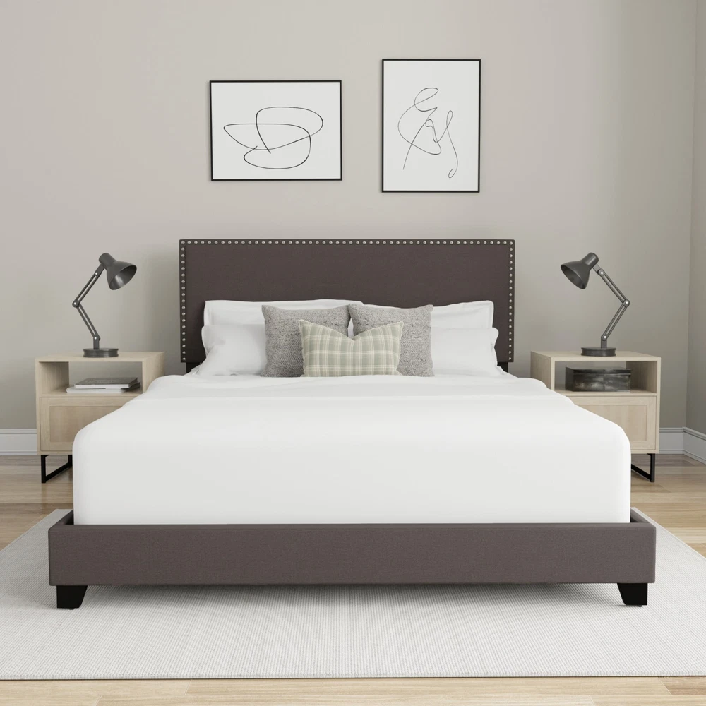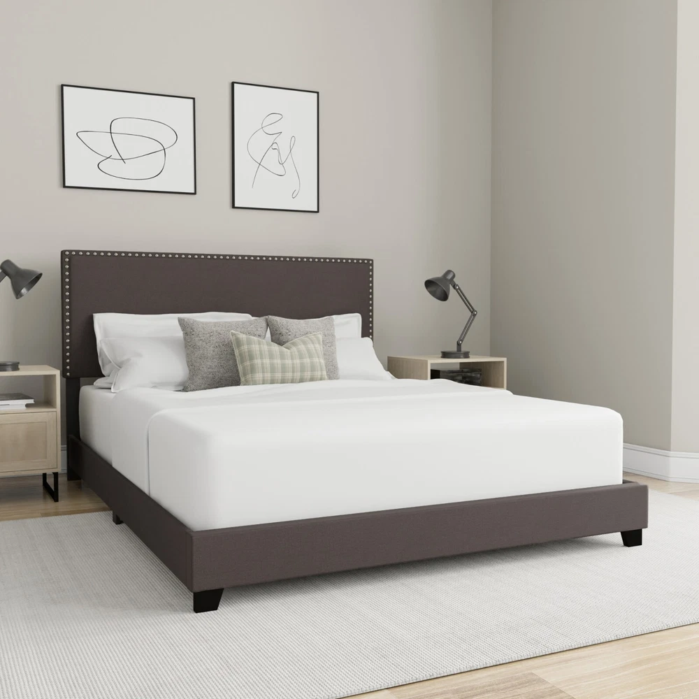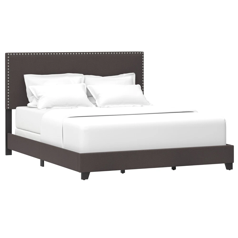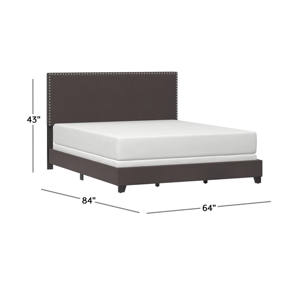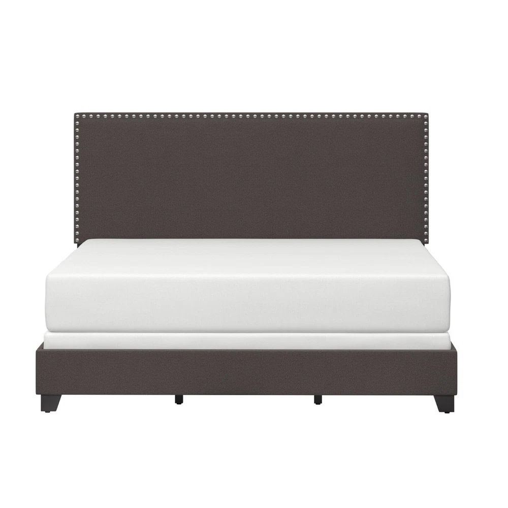 Drift Off to Dreamland in Style: Willow Queen Upholstered Bed Transform your bedroom with the Willow Queen Bed , a stylish and versatile piece that combines timeless design with modern elegance. Perfect for a master, guest, or youth room, this bed adds a touch of sophistication to any décor. Features You'll Love: Elegant Design : Traditional silhouette enhanced with bold silver-hued nailhead trim . Neutral Charcoal Fabric : Upholstered in soft 100% polyester for a sleek yet cozy feel. Espresso-Finished Feet : Complements the dramatic yet simple look. Fully Upholstered : Includes headboard, footboard, and side panels for a cohesive and polished finish. Durable Build : Solid wood frame supports up to 500 lbs. Dimensions: Overall : 43"H x 64"W x 84"L Headboard Height : 43" Footboard Height : 8.5" Additional Details: Box Spring & Mattress Required : Complete the look with your favorite bedding. Convenient Shipping : Item ships in one box. Assembly Required : Easy-to-follow instructions included. With its simple square profile , bold accents, and neutral tones, the Willow Queen Bed seamlessly blends into most décors while adding fresh flair to your space. Upgrade your bedroom and experience both style and comfort today!