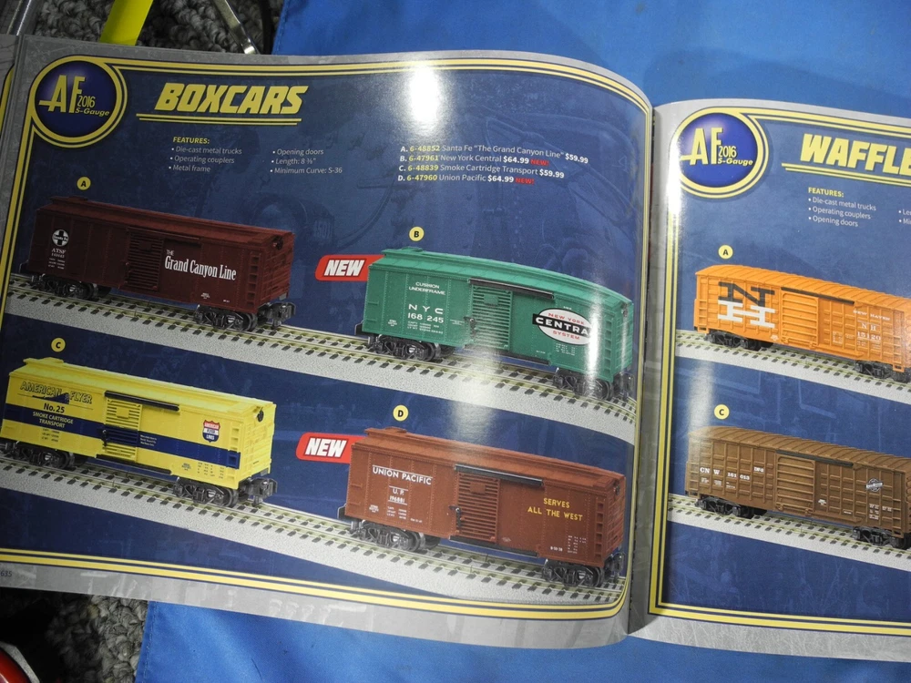 LIONEL 2016 AMERICAN FLYER TRAIN CATALOG S GAUGE train accessories NEW Lionel AMERICAN FLYER 2016 Catalog S-Gauge Lionel AMERICAN FLYER 2016 Catalog, 59 pages. Lionel Catalogs, collect the very best! What a great way to have all of Lionel’s trains at your fingertips, with photographs, descriptions and manufactures retail prices. Highly collectible, great research tool, catalogs are in excellent, start your collection today! * Includes Accessories & Christmas Sets & Cars Brand NEW! Volume discounts! FREE SHIPPING! MEDIA MAIL! Please look carefully at all photos and bid accordingly 100% Positive Feedback! Availability: In Stock and ready to ship. FAST SHIPPING!!! Have Mint condition Lionel 2015, Volume 2 Catalog. This 148 page catalog is full of Lionel 115th Anniversary; O Scale; Traditional O; and Accessories. To name a few items: The 6-82959, 115th Anniversary Berkshire loco is limited to 250 pieces. Each numbered loco is including a certificate of authenticity. The features include a Nano painted finish, uniquely numbered, a signed and numbered certificate of authenticity, special packing, Legacy Control. SD60E Diesel start out the general catalog, listing these in HS Southern. SD38 Locos in Conrail & Penn Central, Reading & Northern; GP 9's in BN, Chessie System; Rio Grand & Southern; E7AA Sets offered include the Seaboard, Burlington, and Great Northern. Steam Locos FEF-3 include the Union Pacfic 844, 835 and 838 models, along with the 8444, and 844. Other styles offered are in the Heislers, 2-8-0, & Weathered steam engins. 86' Hi-Cube Boxcars, General American Milk Cars, Logging Disconnects, 40' Flatcars with Lumber Loads; Rail ro Road Intermodal Service, PSl-4 Flatcars with Loads, PS-5 Gondolas with 50's Flatcars; ACF 40 Ton Stock Cars; PS-1 BoxCars, and 60's BoxcCars along with 8-Door 86' Hi-Cube Box cars & 89' Auto Carriers; Unibody Tank cars; Bathtub Gondola's; Twin Hoppers, Cranes with Boom cars & Cabooses are also pictured. The 21" Passenger cars in assorted road names are being offered, as well as the 18" aluminum Passenger cars. LionChief Plus FT A-A Sante Fe; Rio Grande and Erie diesels; In GP20, BNSF, NYC, Norfolk Southern & Susquehanna are pictured, and Camelback steams are in the Jersey Central and Lackawanna road names. The Mikado LionelChief has the UP & NYC Rio Grande offered; to name a few. Command Control Rotary Snowplows in Pennsylvania, Rio Grande, and NorthPole Central are pictured; Tie-Jectors, Tie Work Cars; PostWar Inspired, Space & Military equipment are also offered. Several Dealer Exclusive sets with titles of: Marquettte Freight GP38; CNW Windy City GP38; Boston & Maine Paul Revere GP9; & Jersey Central Yard Boss Sets are being offered. The assorted freight rolling stock is also offered with a new Smithsonian Boxcar. Several Road Names in the Baby Madison Passenger cars are also shown. Accessories are also pictured. This is only a sample of what is being offered in this catalog for the year. Will combine shipping on multi-catalog purchases. Member TCA 65-1165; TTOS #361; LCCA #1426.