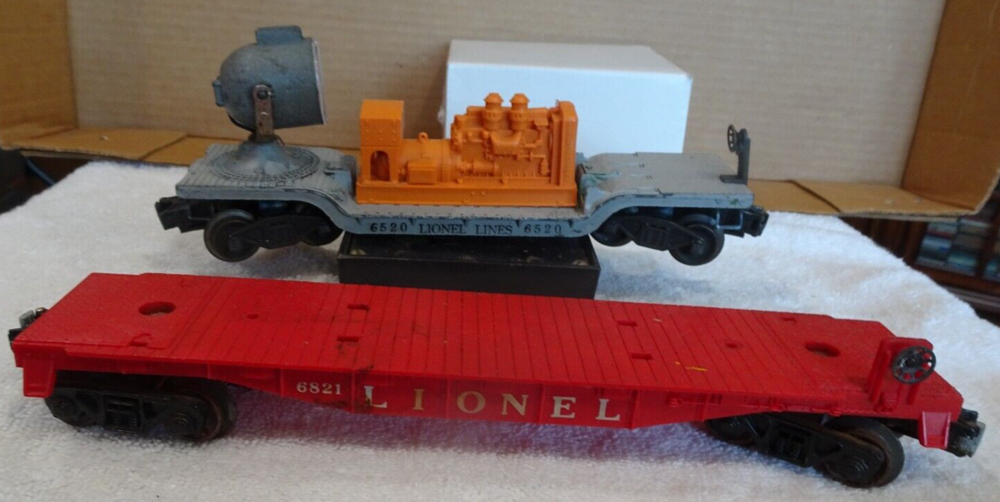 LIONEL 6821 Flatcar / 6520 Searchlight Car Nice. BOX-9 Please See Pictures As They Are The Biggest Part Of The Description