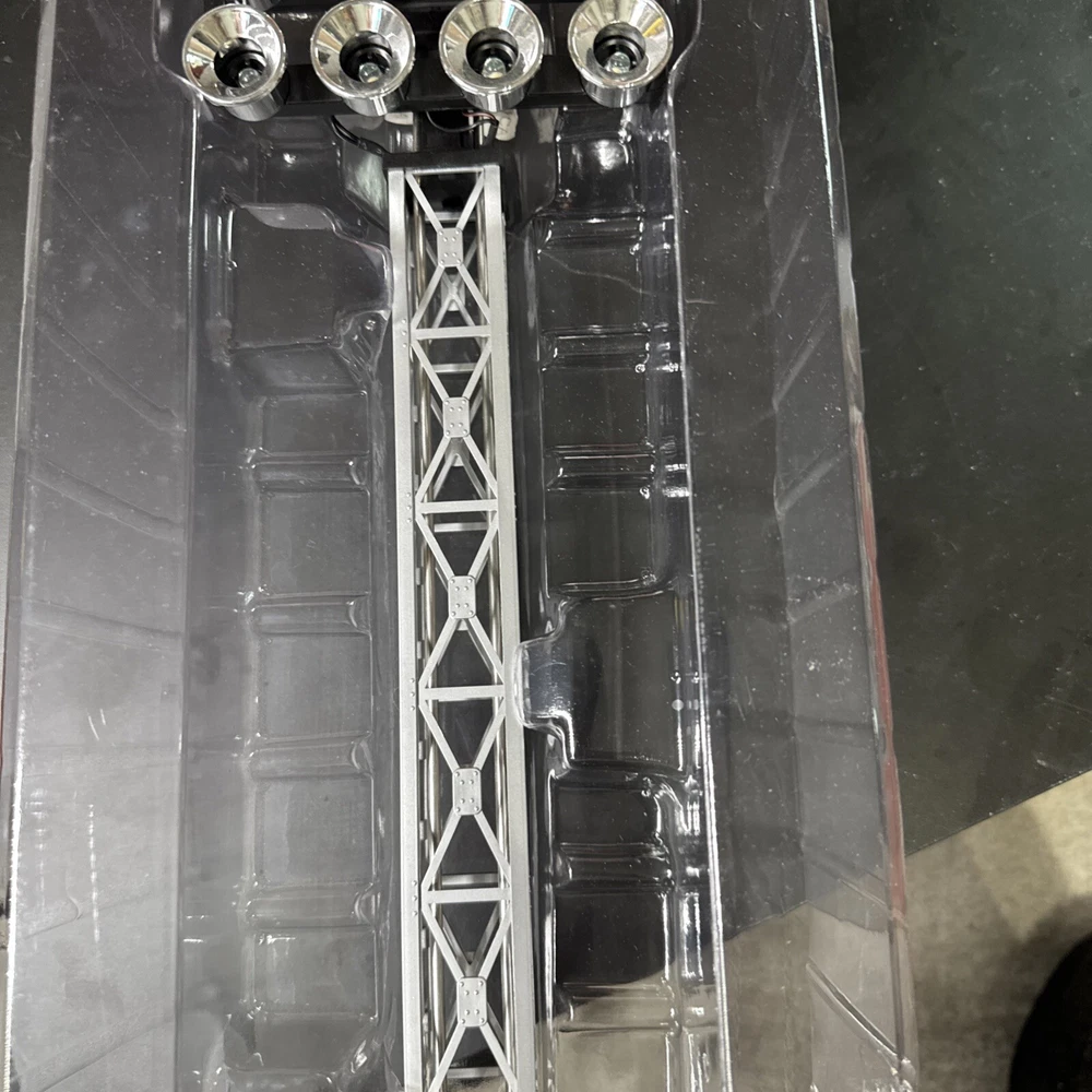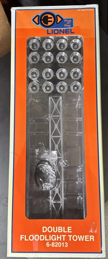 Open box. Never installed nor used. Excellent mint shape. Tested and verified operational. The Lionel Double Floodlight Tower is a pre-built, silver-colored accessory for model railroads in a 1:48 scale. It features two floodlights that can be easily plugged in and controlled using an analog system. Suitable for ages 8-11 years, this plastic unit from China is part of the Plug-N-Play series by Lionel, designed to enhance the realism of train track layouts.