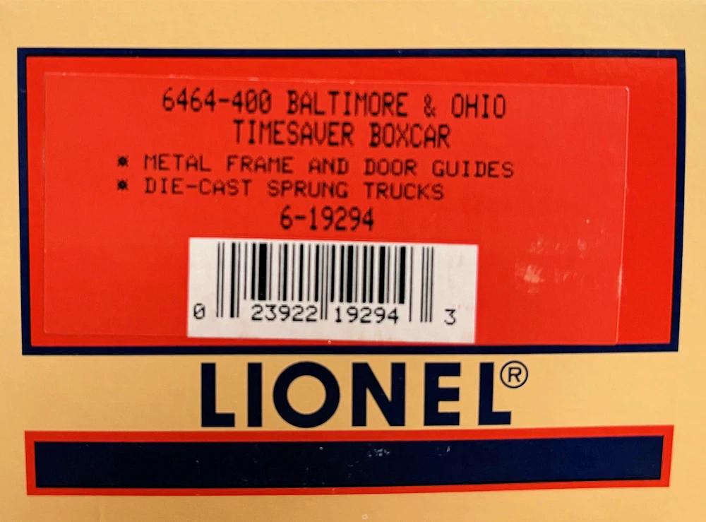LIONEL 6-19294 O-GAUGE BALTIMORE & OHIO B&O 6464-400 TIMESAVER BOX CAR RTR OVP D LIONEL 6-19294 O-GAUGE BALTIMORE & OHIO B&O 6464-400 TIMESAVER BOX CAR RTR OVP DARK BLUE & ORANGE METAL WHEELS AND AXLES OPERATING KNUCKLE COUPLERS FREE scheduling, supersized images and templates. Get Vendio Sales Manager. Make your listings stand out with FREE Vendio custom templates! FREE scheduling, supersized images and templates. Get Vendio Sales Manager. Over 100,000,000 served. Get FREE counters from Vendio today!