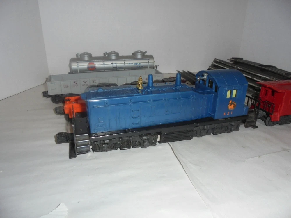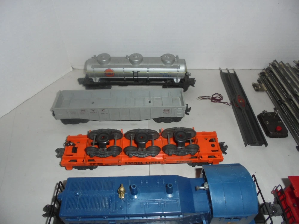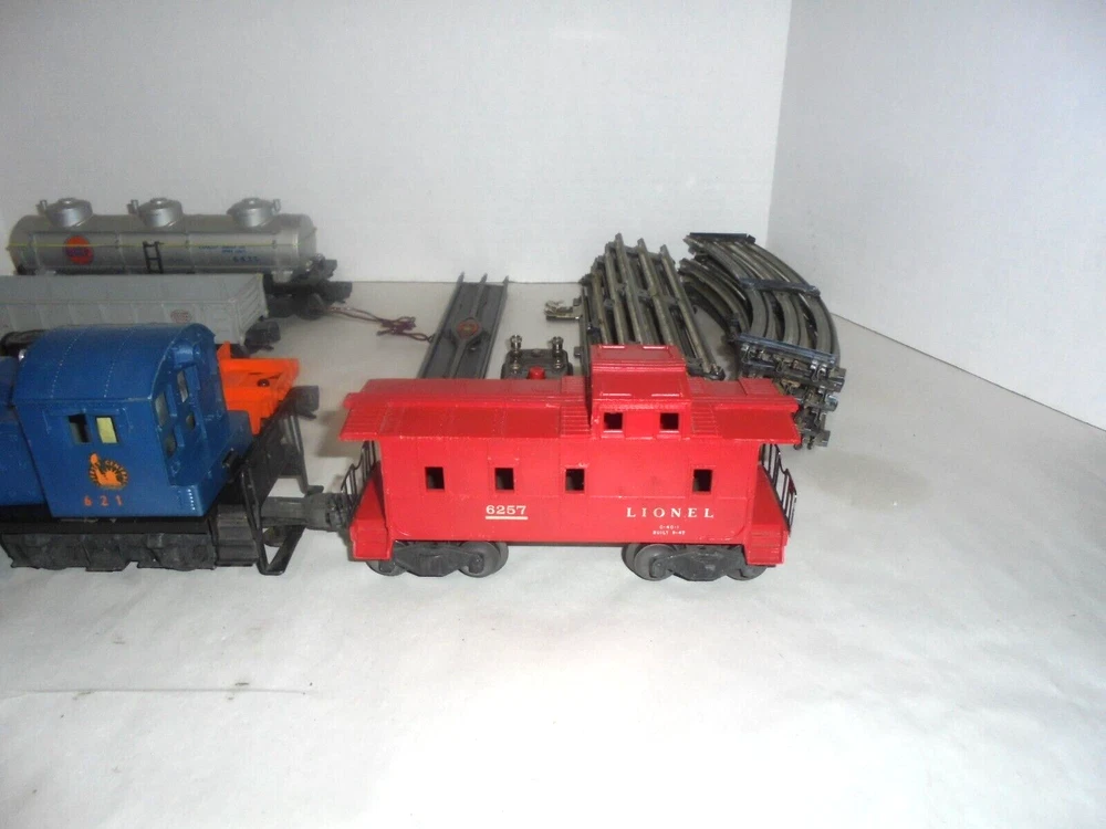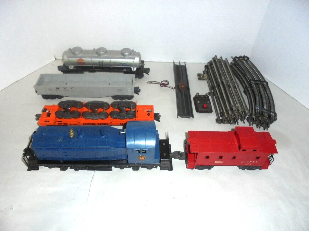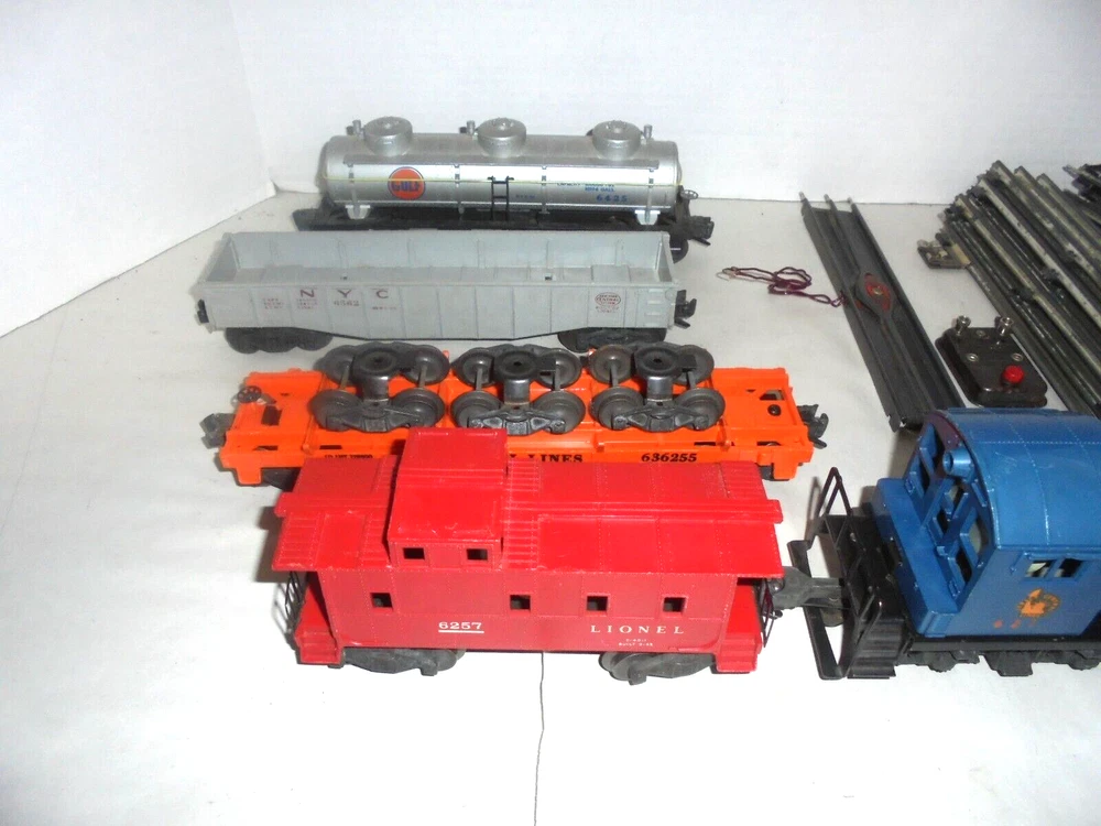 Material:Plastic, SteelAssembly Status:Ready to Go/Pre-builtGauge:OCountry/Region of Manufacture:United StatesScale:O OR O/27 SAMECorporate Roadname:JERSEY CENTRALGrade:C-6 Very GoodTheme:TransportationSet Includes:Caboose, Flat Car, Locomotive, Ore/Coal Wagon, Tank Car, TrackYear Manufactured:1956Franchise:LIONELColor:MulticolorNumber of Items in Set:5MPN:LIONEL FREIGHT TRAIN SETType:Starter SetControl System:AnalogPower Type:ACVintage:YesBrand:LionelFeatures:Limited Edition, Not Painted, Painted, Sound Function