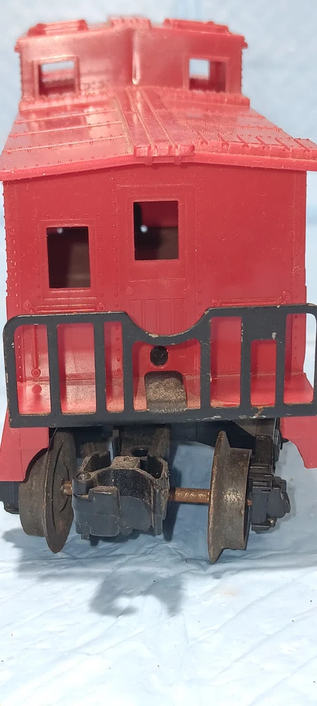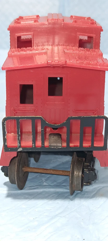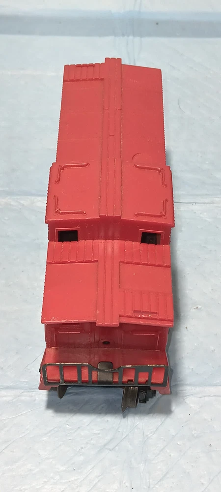 The Unmarked Caboose No. 6167 was available in 1963 and 1964 and was manufactured in various shades of plastic. Issued as a component of various starter sets during these years, they would also be offered in numerous uncataloged sets. These cars are difficult to catalog because the boxes are non-existant, however, attempts have been made to catalog these by their mold number. Some of the RED cabooses use mold 6059-2 while some of the YELLOW ones use mold 6167-52. The most collectable car of this type is the D Variation that uses a Die 4 body. All of these came with either AAR or arch-bar trucks and there are five known variants of this unmarked caboose: Variation A: Unpainted RED body whose chassis does not have handrails and has one solid coupler. Listed in the Lionel Service Manual and Cataloged as 6167-25. Variation B: Cataloged as 6167-125 in the Lionel Service Manual with one operating disc coupler and one solid coupler and has a RED body. Variation C: Unpainted YELLOW body that has one solid coupler. Listed in the Lionel Service Manual and Cataloged as 6167-50. Variation D: OLIVE DRAB body whose chassis does not have handrails and has one solid coupler. Known to have been used as a component for the uncataloged Firestone Tire & Rubber Company set No. 19338 . Variation E: Unpainted BROWN body that uses a Die 4 and was issued uncataloged. Estate find, items has been in storage for decades
