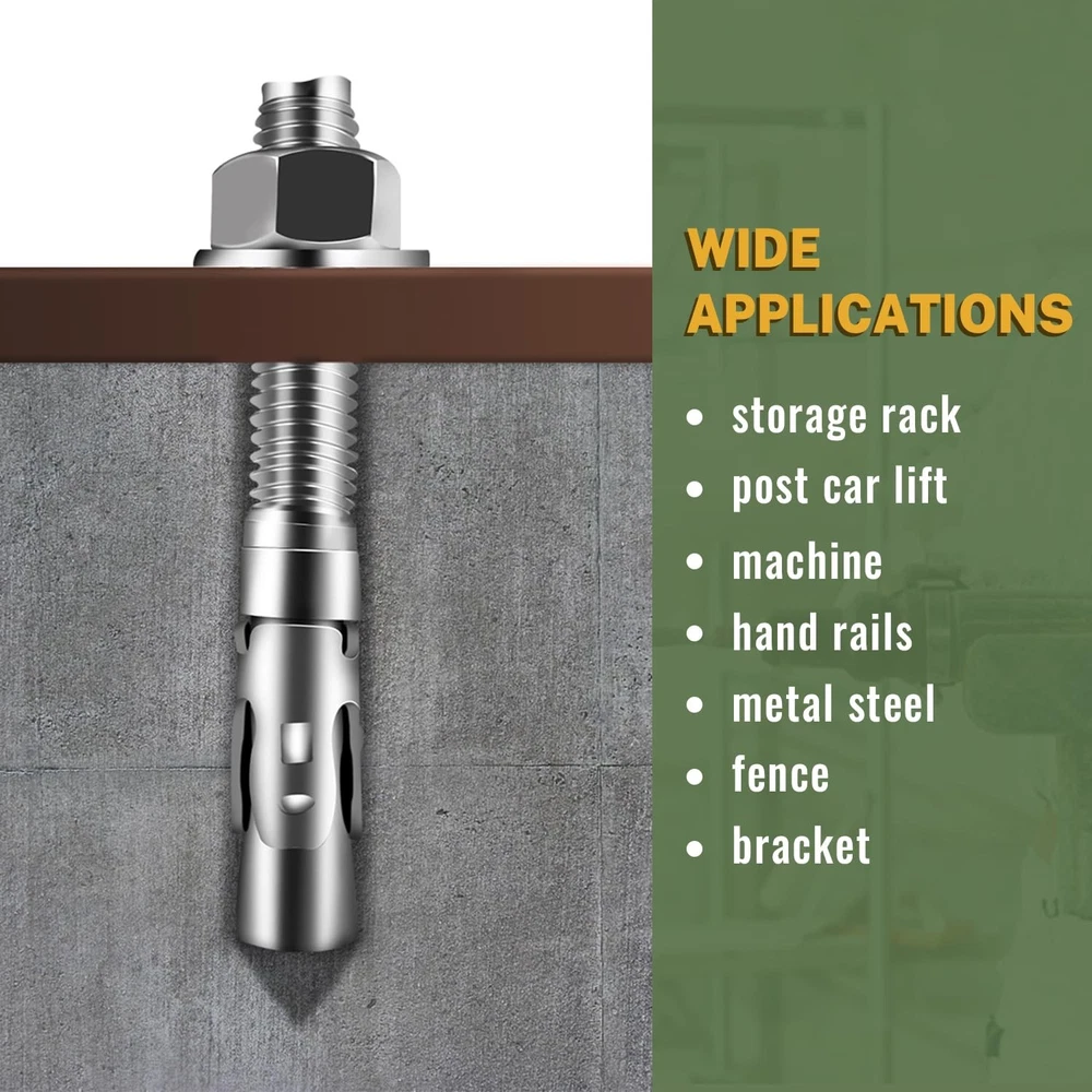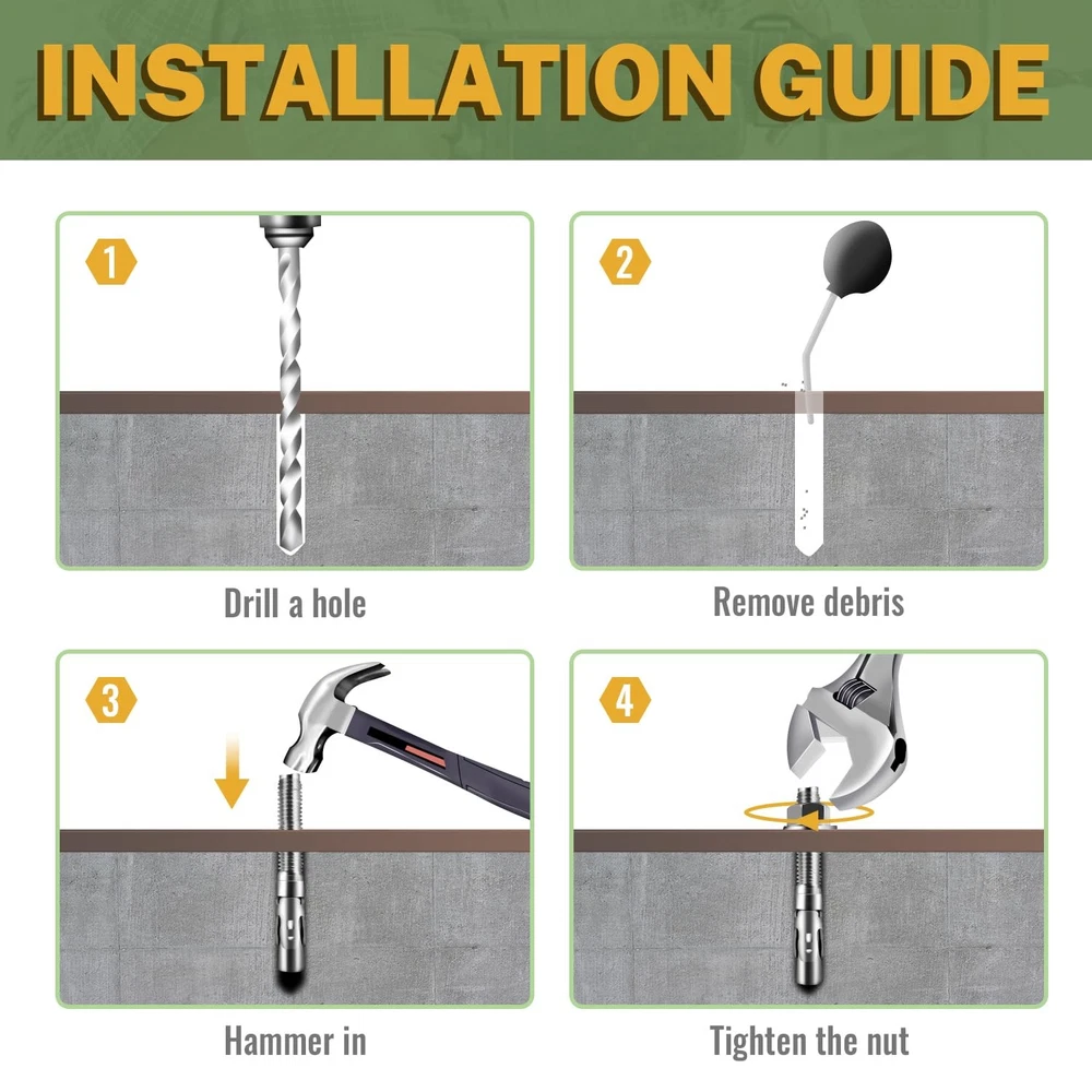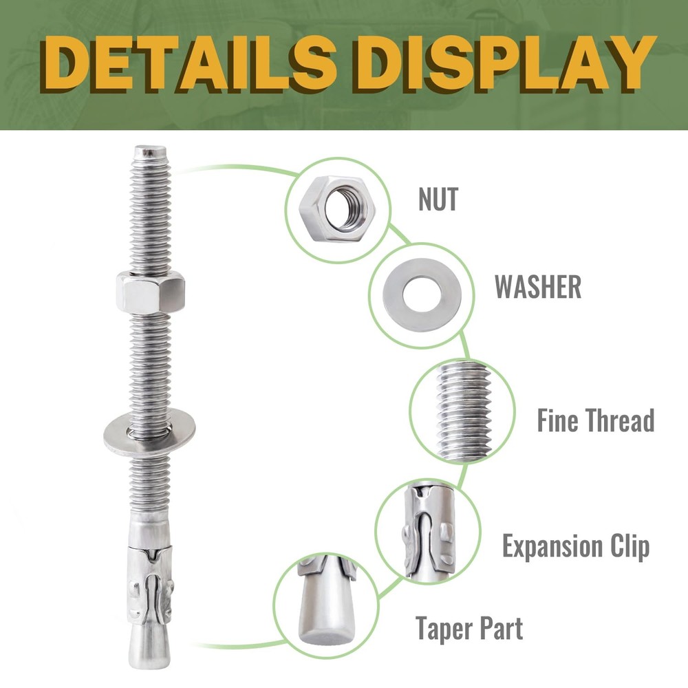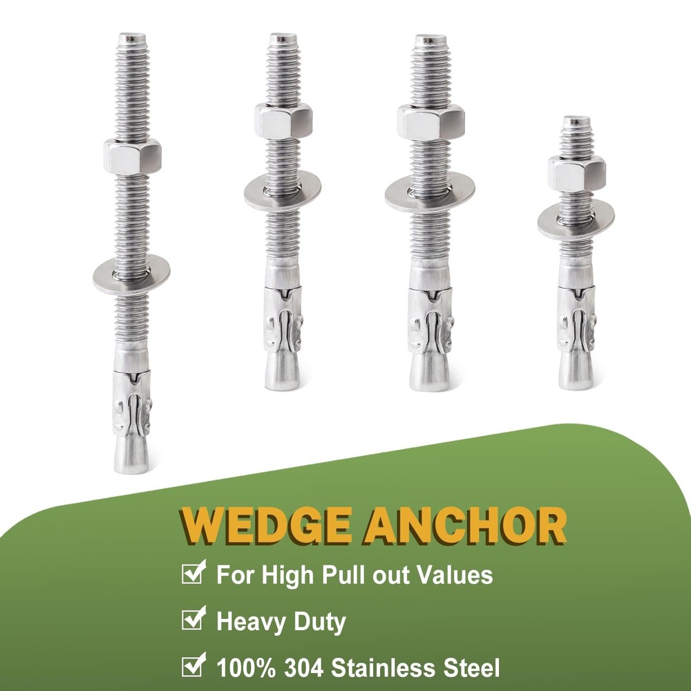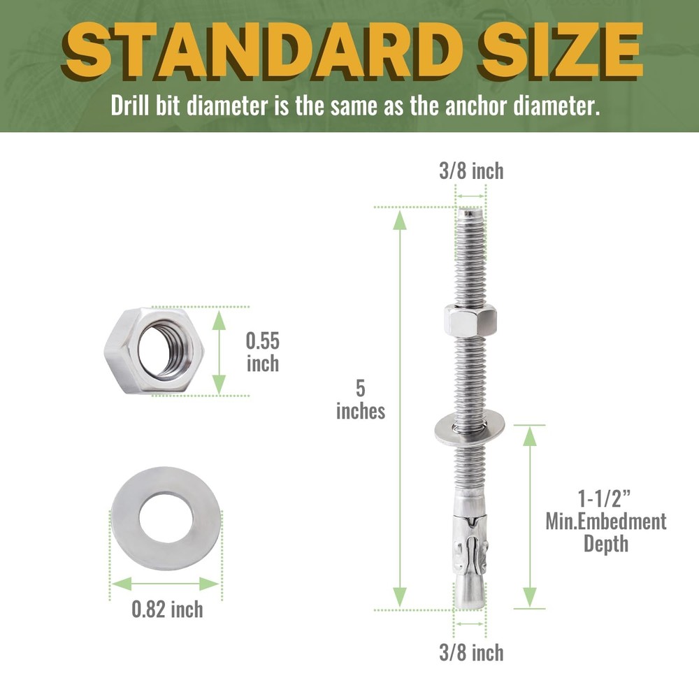 Parameters: - Anchor Diameter: 3/8" - Anchor Length: 5" - Minimum Embedment Depth: 1-1/2" - Maximum Fixture Thickness: 3" The maximum thickness of the fixture or the maximum thickness of the material being fastened to the base material is 3", which ensures a minimum embedment depth of 1-1/2". Why Choose Us? ※ 304 Stainless Steel ※ Our concrete wedge anchors are made of 304 stainless steel, which is hard and not easy to bend, can be used in a variety of heavy-duty working environments. Besides, it offers excellent protection against corrosion and rust, ensuring your projects stand the test of time. ※ With Nuts & Washers ※ For your convenience, each wedge anchor is equipped with a nut and washer. ※ Wide Applications ※ Great heavy duty concrete wedge anchors for installing racking, machinery, car lifts and other fixtures. ※ Excellent After-sales Service ※ lf you have any questions when using our wedge expansion anchors, please contact us. We are always ready to help you. Superior Strength: Our concrete wedge anchors, made of 304 stainless steel, offer exceptional strength and reliability as well as provide excellent protection against rust and corrosion even in harsh conditions. It will never bend during use Easy Installation: Pre-drill a hole with a drill bit first and remove the debris. The diameter of the drill bit/hole is the same as the diameter of the anchor. Hammer the wedge expansion anchor into the hole. Tighten the nut to comlplete the installation Professional Choice: Our wedge screw anchors are professionaly designed for both indoor and outdoor use. The concrete wedge anchors have a maximum working pressure of 2000 psi and a temperature range of -100 to +660 °F Wide Application: heavy duty concrete wedge anchors are suitable for heavy-duty fastening applications that require high pull out values. These wedge anchor bolts are ideal for structural anchorage, storage racking anchorage, machinery and hand rails installation. It is for concrete only, not for block or brick base material Package Includes: You'll receive 6 pcs 3/8" x 5" wedge anchors. A nut and washer have been placed on each wedge anchor for your convenience