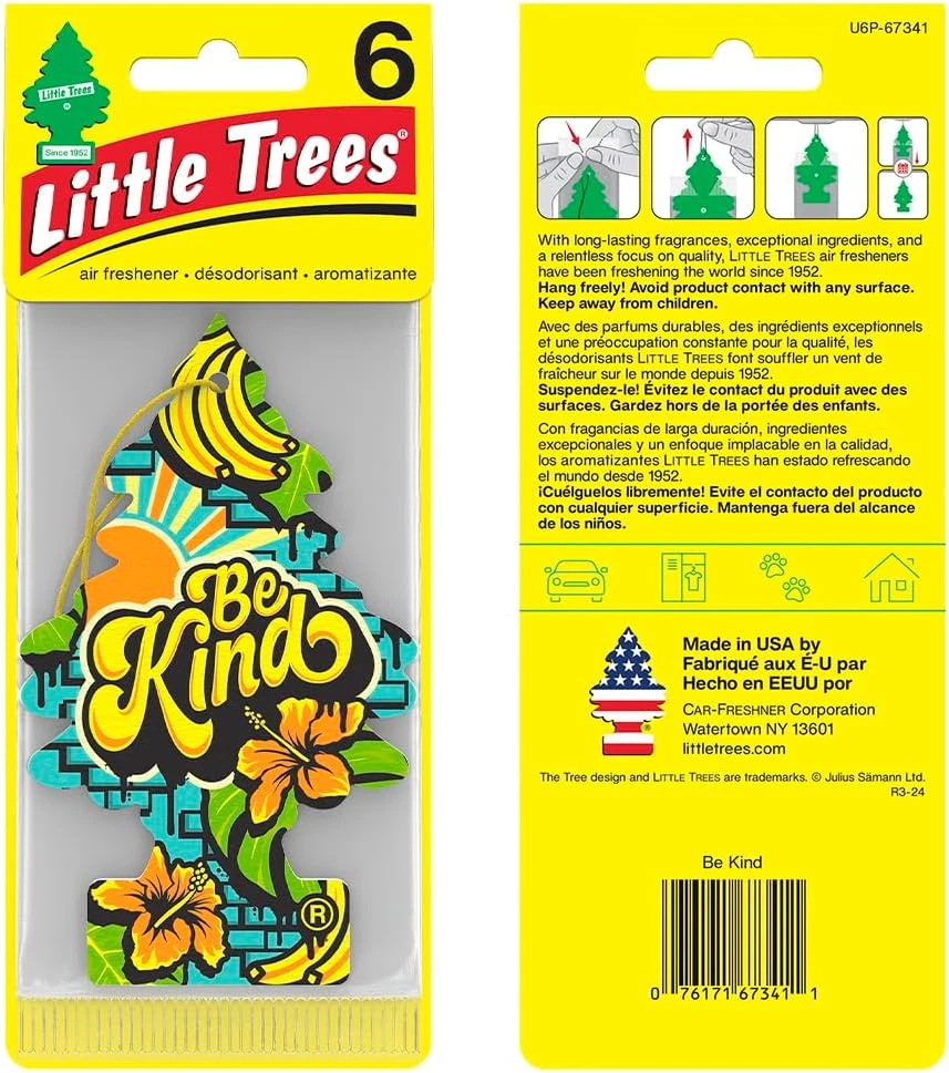 Store New Arrivals Add to Favorite View Feedback Contact LITTLE TREES Car Air Freshener | Hanging Tree Provides Long Lasting Scent for Auto or Home | Be Kind, 24 Air Fresheners Description Item model number U6P-67341 Power Source passive diffusion Color Be Kind Scent Tropical Hibiscus, Banana Brand LITTLE TREES Country of Origin USA Item Form Hanging Paper Package Dimensions 7.87 x 3.46 x 3.11 inches; 5.82 ounces Manufacturer LITTLE TREES BE KIND: Spread a message of kindness with tropical hibiscus and sweet, creamy banana LONG-LASTING FRAGRANCE EXPERIENCE: Specialized proprietary technologies combined with exceptional fragrances deliver long-lasting quality results. MORE THAN JUST A CAR AIR FRESHENER: Freshen up at home or on the road with the original car air freshener. Great to use in laundry rooms, garages, bathrooms, and pet odor areas. FRESHEN YOUR LIFE: LITTLE TREES air fresheners come in a wide range of product styles and fragrances, making it easy to find one you love! MADE IN THE USA: Rigorous testing and high quality standards ensure a premium fragrance experience made from only the best ingredients. THE ORIGINAL CAR AIR FRESHENER: LITTLE TREES is the original car air freshener that freshens at home and on the road. ABOUT US We offer the best prices around on high quality products. Our E-store includes media such as books, movies, music and games while offering electronics, toys, sporting apparel, clothing, tools, general home, garden items and more. SHIPPING We are always working hard to ensure your package arrives as soon as possible. Please understand that some factors like weather, high postal traffic, and the performance of shipping companies are outside of our control. We offer free shipping to the lower 48 states and ship within 2 business days of payment, usually sooner. We do not accept P.O. Boxes. Please provide a physical address. RETURNS We offer a 30-Day Return Policy on items which you are not completely satisfied with. You have the option for a full-refund or an exchange of the item. No returns are available on items shipped outside of the USA. PAYMENT We accept PayPal. CONTACT US This page content is yet to come Please ad us to your favorite seller and visit again later Thank You CUSTOMER SATISFACTION We try our very best to make sure every customer is completely satisfied. If there's a problem, message us! We're happy to help.