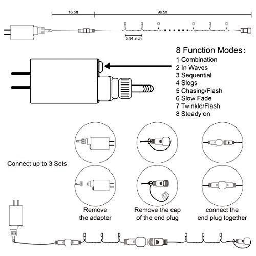 Return Policy Fast Delivery Trusted seller LJLNION 300 LED String Lights Outdoor Indoor, Extra Long 98.5FT Christmas Lights, 8 Lighting Modes, Plug in Waterproof Fairy Lights for Wedding Party Bedroom Decorations (Multicolor) Product Description 98.5ft Christmas Decorations string lights: With 300 multicolor individual LED bulbs. Each fairy string lights has end-to-end connection; you can connect up to 3 sets together to illuminate a wider range. 8 Lighting Functions: Our Halloween string lights have 8 lighting modes: combination, in waves, sequential, slogs, chg/flash, slow fade, twinkle/flash, and steady on. Fit different occasions, moods, feelings, holidays, festivals, anniversaries, etc. Pressing the round button on the transformer to change the lighting modes. 29V Low Voltage String Lights: Keep at a low temperature state after lighting up for hours, ensure and maximize the safety. Directly plug in and unplug it for power on and off. US standard outlet, voltage 110V. Adapter to the first LED light: 16.5ft. Total length (lights string and leading line): 115ft. Waterproof & Widely Use: The strong construction makes the string lights tough and sturdy, and waterproof designed string lights perfect for indoor outdoor decorations, ideal for Christmas, wedding, party, home, bedroom, wall, garden or balcony decorations. Tips: Please note that the LED and transformer are IP 44 waterproof, so it can meet normal use outside but not enough to put under water directly. Shipping Returns Payment Shipping Shipping is FREE to all addresses other than APO/PO boxes in the lower 48 states. All our stock ships from US-based warehouses. Shipped via USPS or UPS (depending on location and package weight) Unless stated otherwise, all orders will ship within 24-72 hours of your payment being processed. Check our feedback to see the great reviews of FAST shipping we offer. Returns Seller does not accept returns Payment We currently accept payment via eBay managed payments only. Once payment is cleared, we will dispatch your shipment within 1-3 business days. Please refer to the "Shipping" tab for more information regarding shipping speed to your destination.