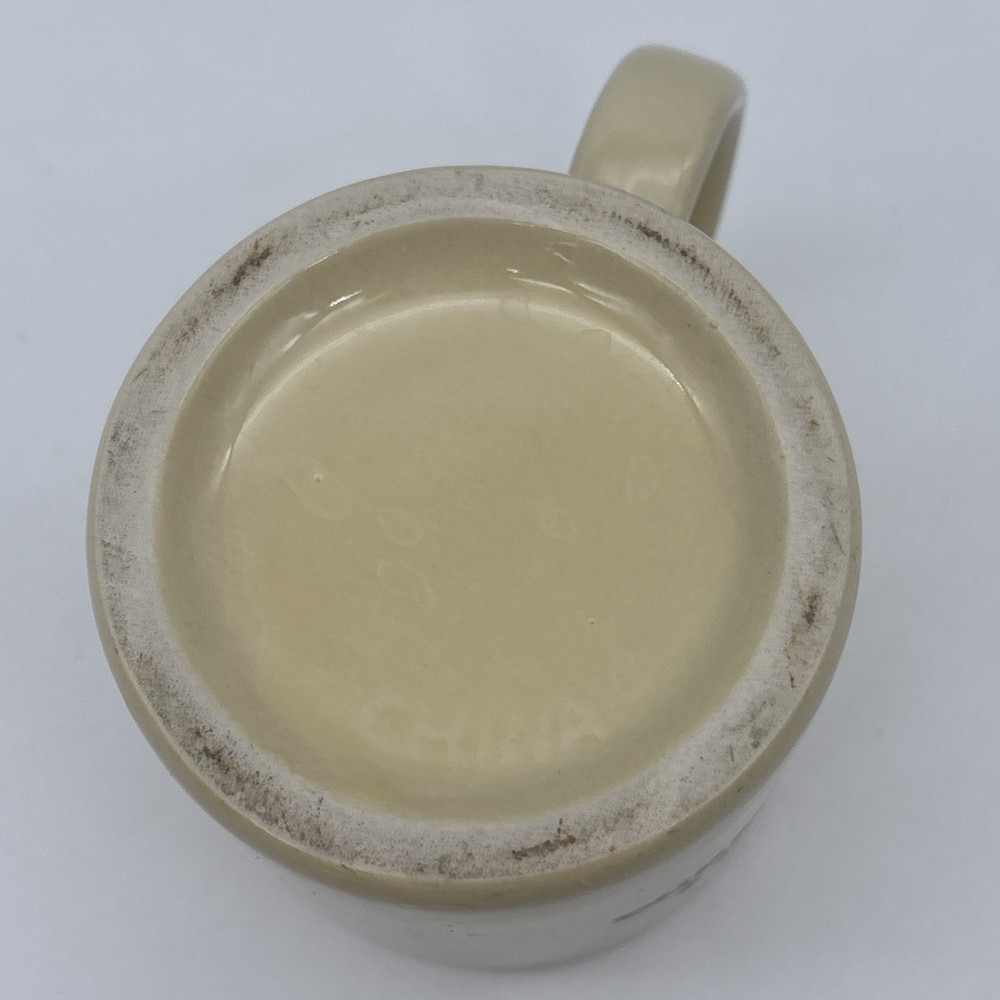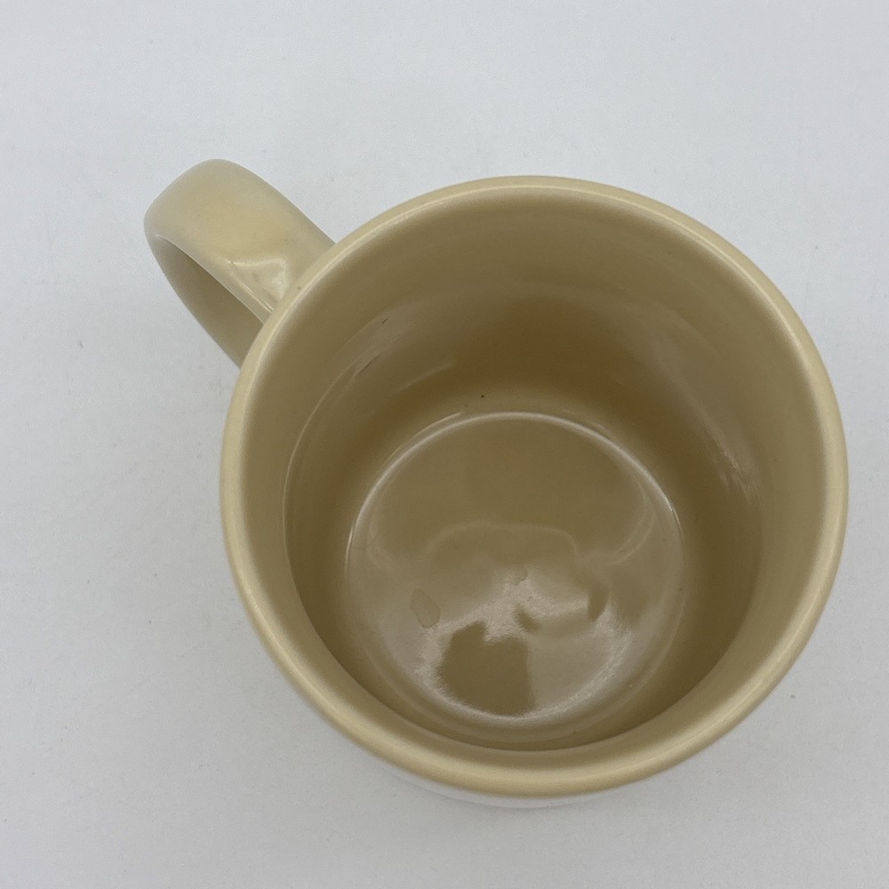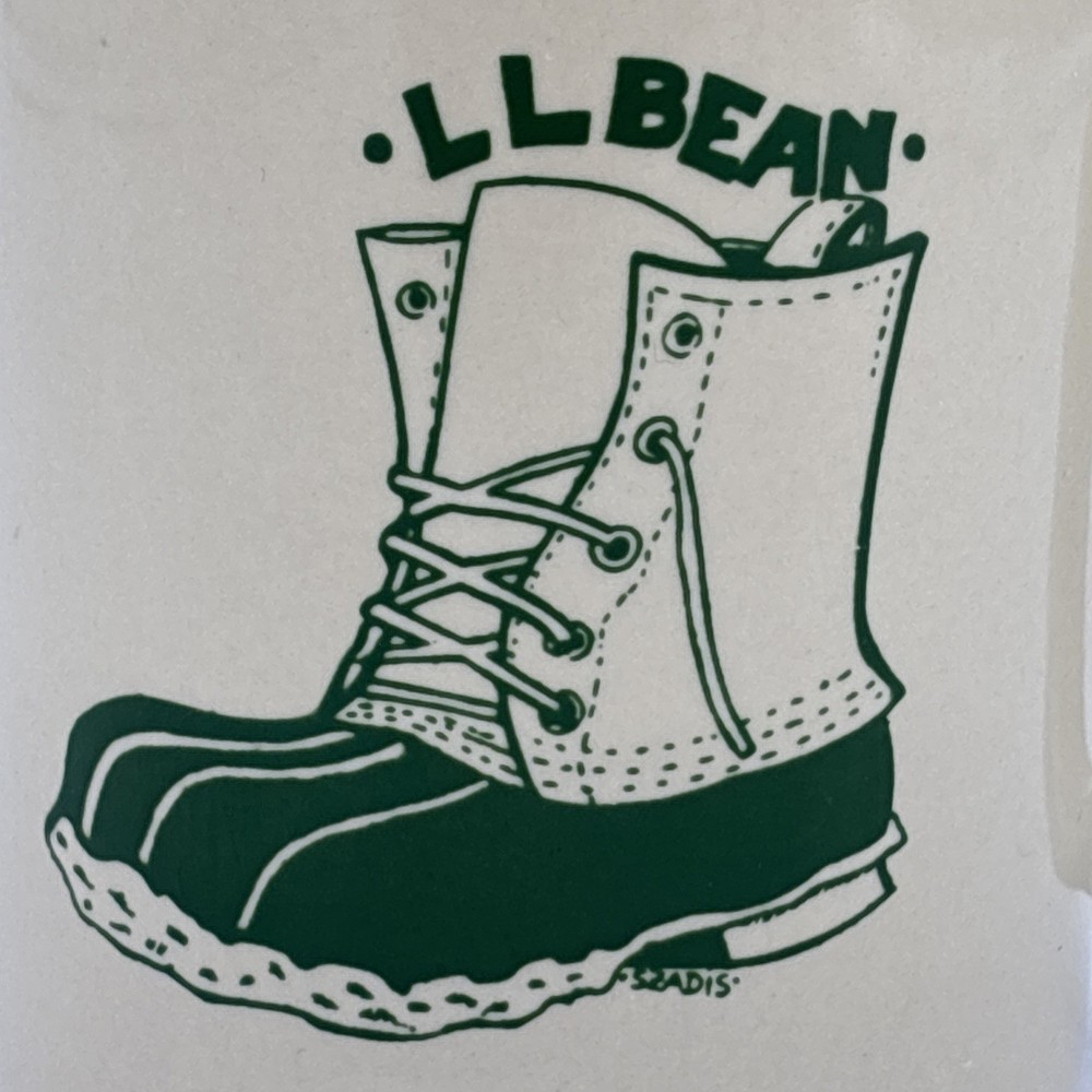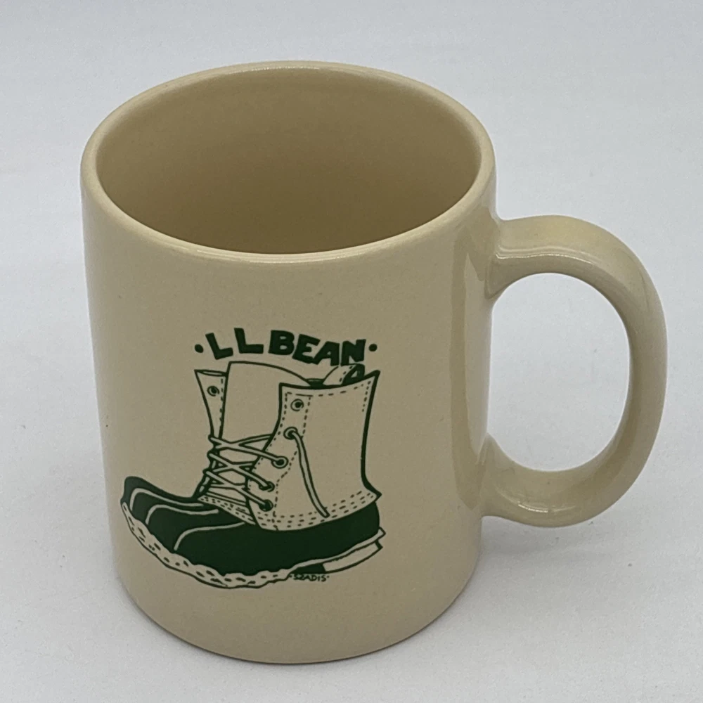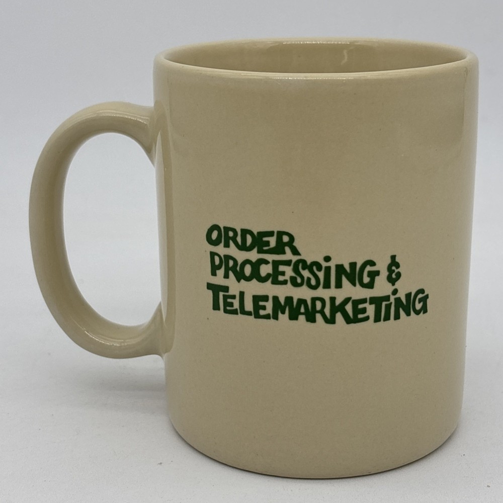 Yellow beige colored coffee cup with the iconic L.L. Bean duck boot on one side, and “Order Processing & Telemarketing” on the other. The bottom of the cup is faintly marked China. Cup is used, but in great shape!