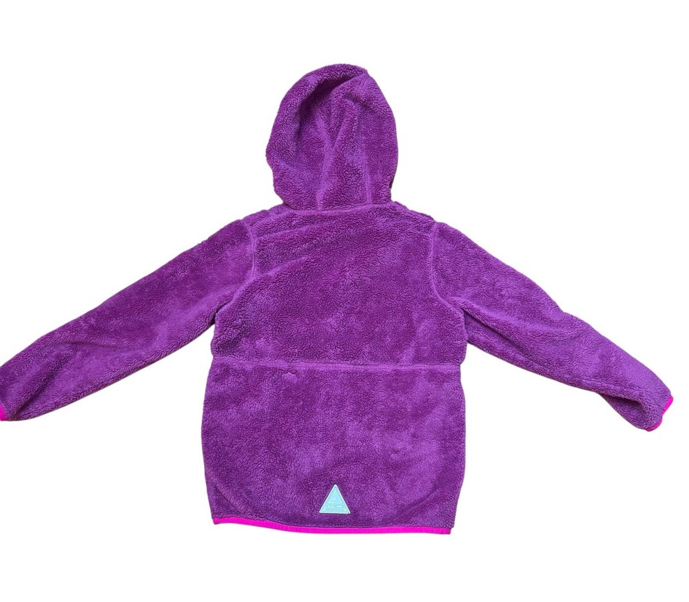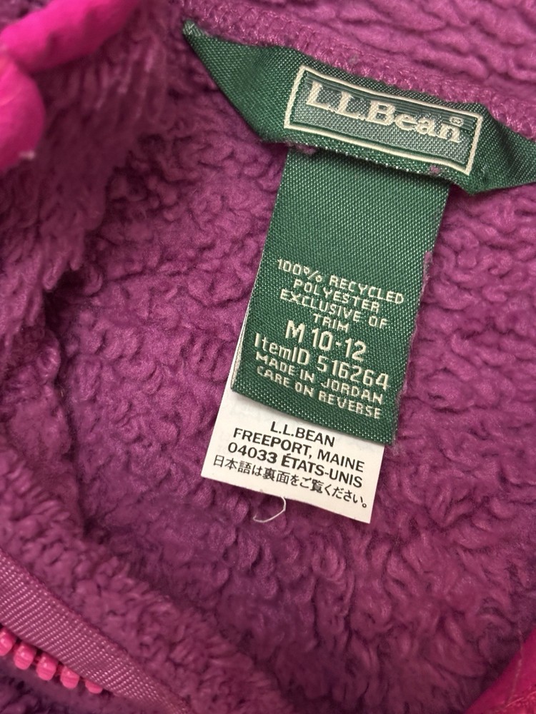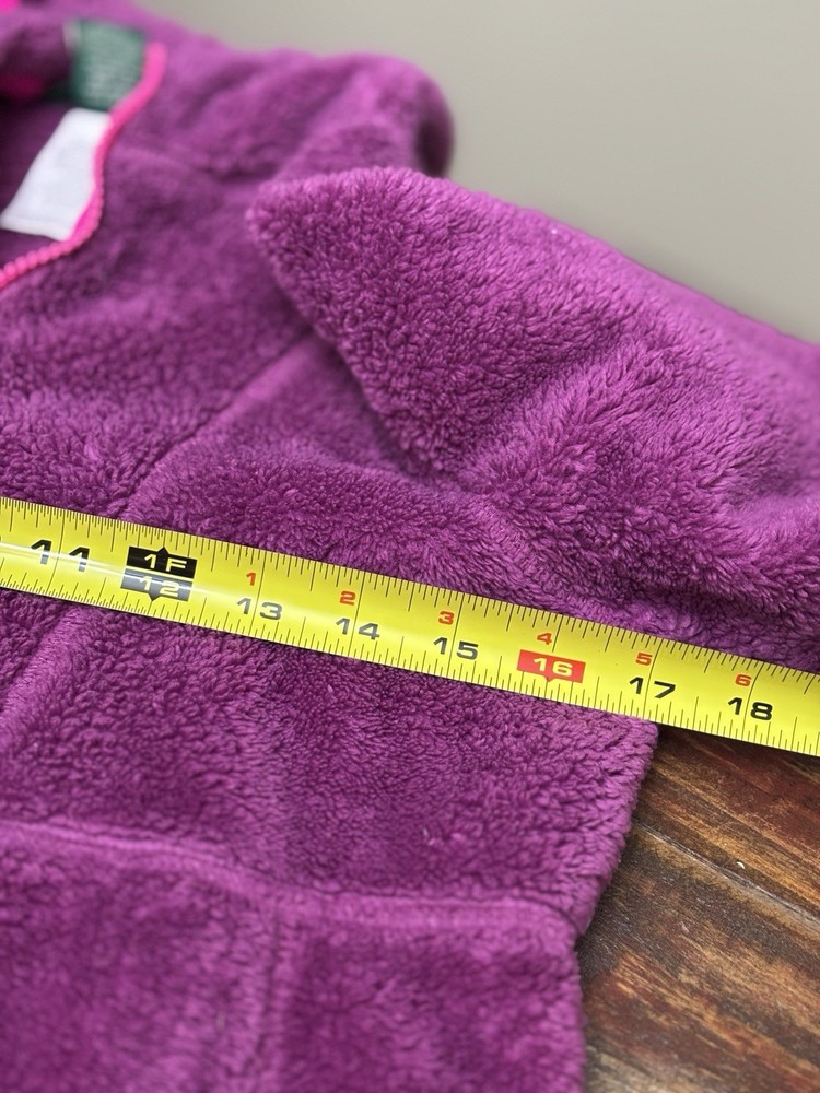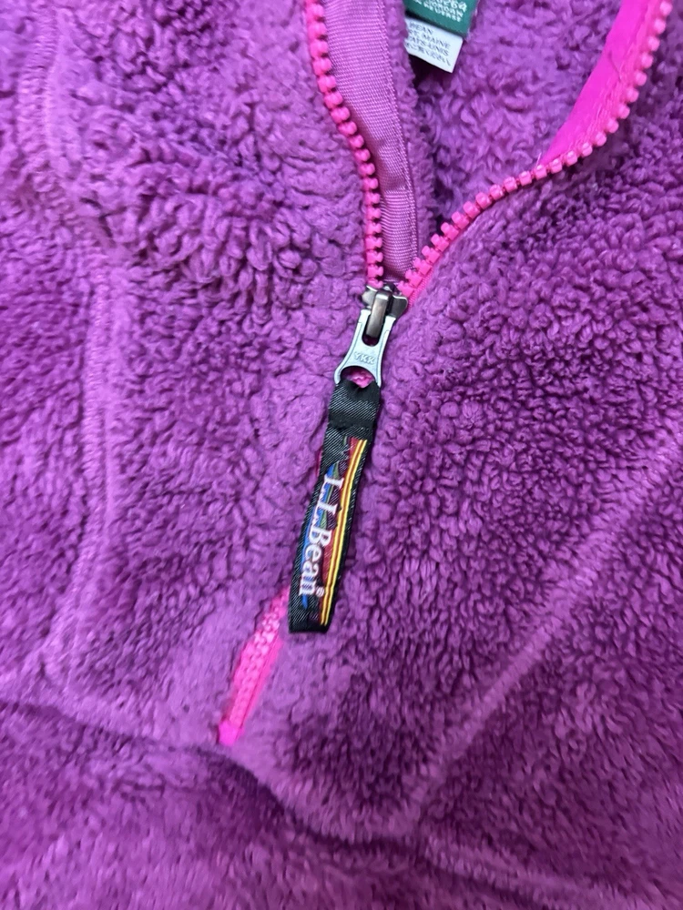 The LL Bean Girls Purple 1/4 Zip Fleece Jacket in size M is a versatile and stylish outerwear piece perfect for young girls. Made of polyester fleece with a solid purple color, this classic fit jacket features a hood, full zip closure, and long sleeves, making it ideal for winter, fall, and spring seasons. The jacket provides warmth and comfort while the accents of the zipper add a fun touch to the basic style. Whether for walking, school, or hiking, this LL Bean jacket combines practicality with a colorful and trendy design for young fashionistas. Chest measurement 17” see photos