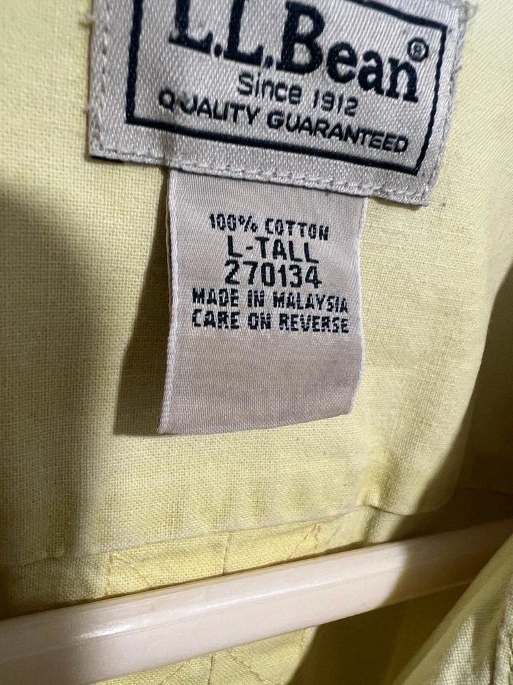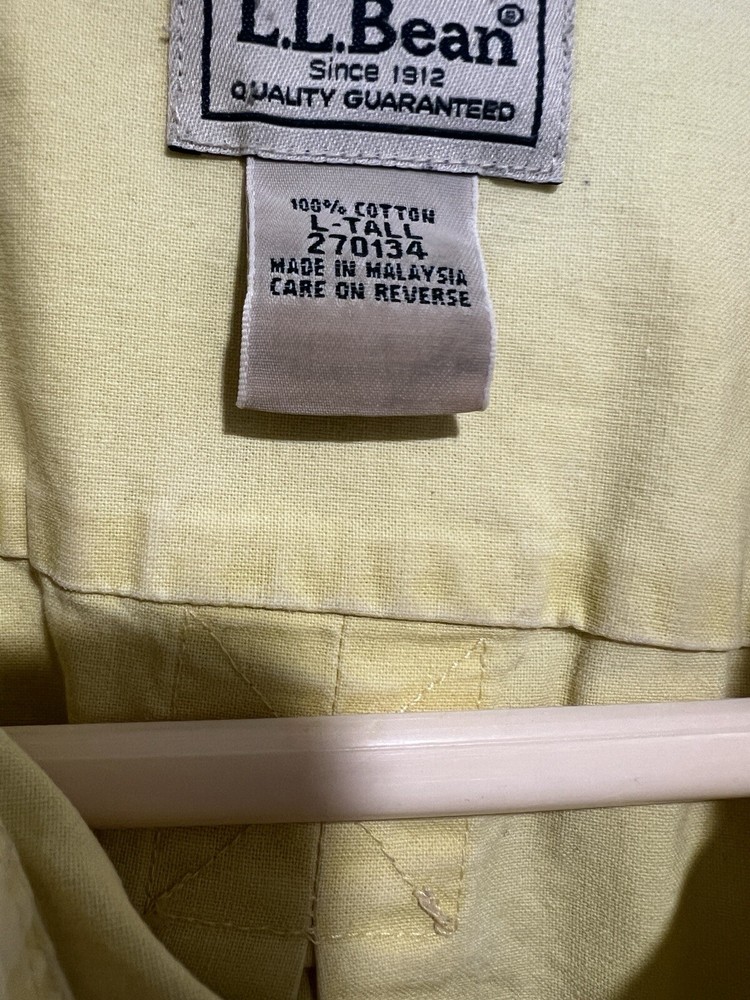 Country/Region of Manufacture: Malaysia Occasion: Casual, Travel, Workwear Size: LT Theme: Outdoor Pattern: Solid Features: All Seasons Closure: Button Color: Yellow Department: Men Collar Style: Point Sleeve Length: Long Sleeve Fabric Type: Canvas UPC: Does not apply Brand: L.L. Bean Fit: Regular Material: Cotton, 100% Cotton Type: Button-Up gtin13: Does not apply Accents: Button Garment Care: Machine Washable Vintage: No Neckline: Collared Size Type: Big & Tall
