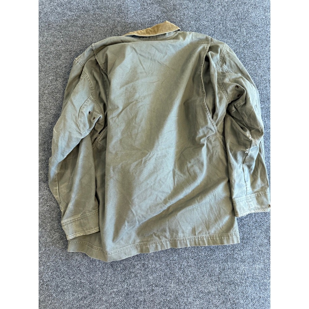 L.L. Bean Original Field Coat in a classic olive drab green cotton canvas features a warm red plaid flannel lining and a tan corduroy collar. This rugged workwear staple is designed with a button-front closure, multiple large utility pockets including a zippered chest pocket, and reinforced shoulders. Underarm grommets provide ventilation, while the durable construction ensures long-lasting wear for outdoor activities or casual everyday use. Note the visible wear and small holes on the sleeve as shown in the photos, adding to its authentic vintage character. See photos for condition.