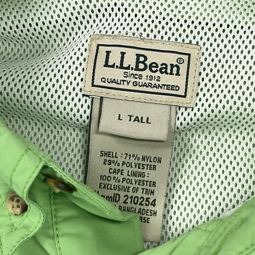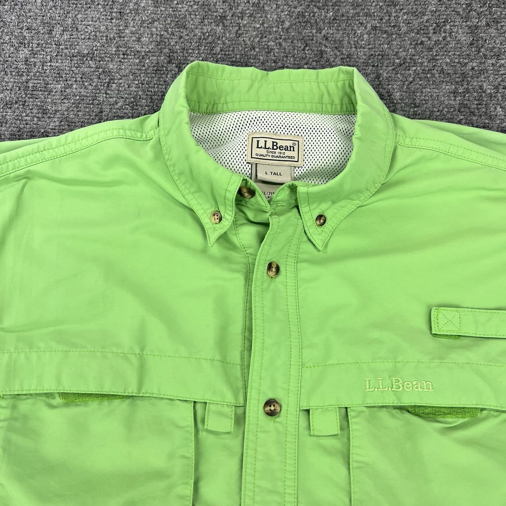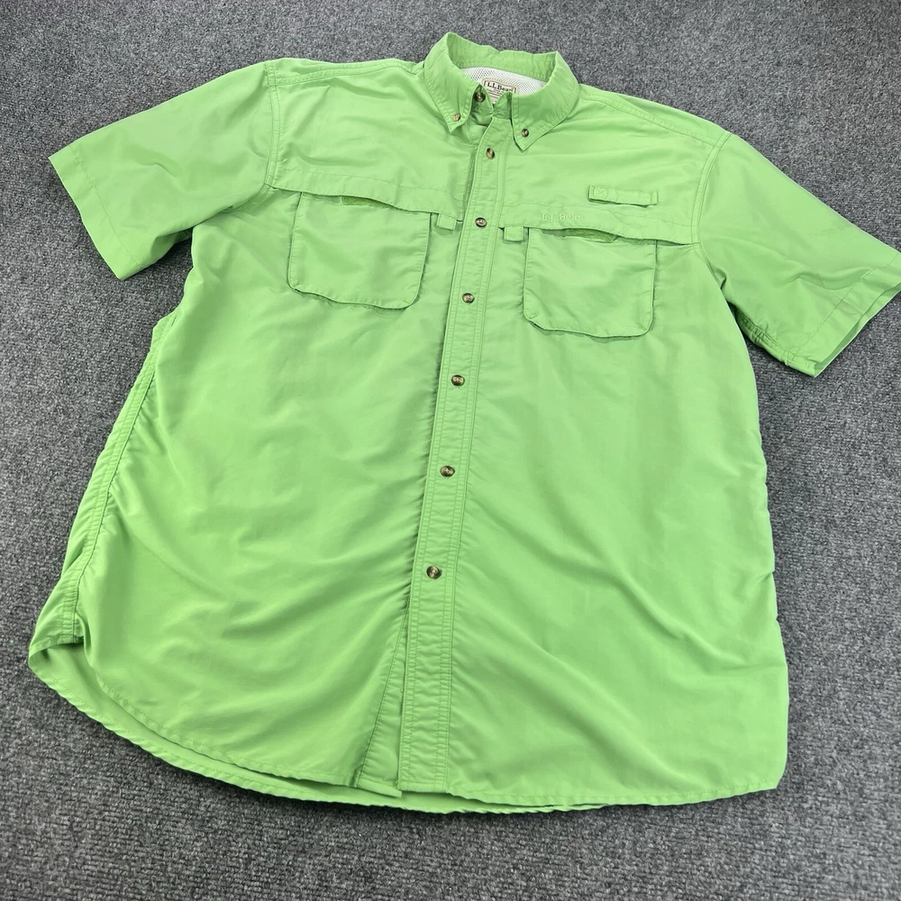 Sleeve Length: Short Sleeve Collar Style: Button-Down Brand: L.L. Bean Pattern: Solid Closure: Button Garment Care: Machine Washable Color: Green Type: Button-Up Season: Fall, Spring, Summer, Winter Neckline: Collared Handmade: No Fabric Type: Microfiber Department: Men Size Type: Regular Occasion: Casual Personalize: No Graphic Print: No Accents: Logo Vintage: No Material: Nylon, Polyester Theme: Outdoor Fit: Regular Size: L Features: All Seasons, Breathable, Easy Care, Lightweight, Lined, Pockets
