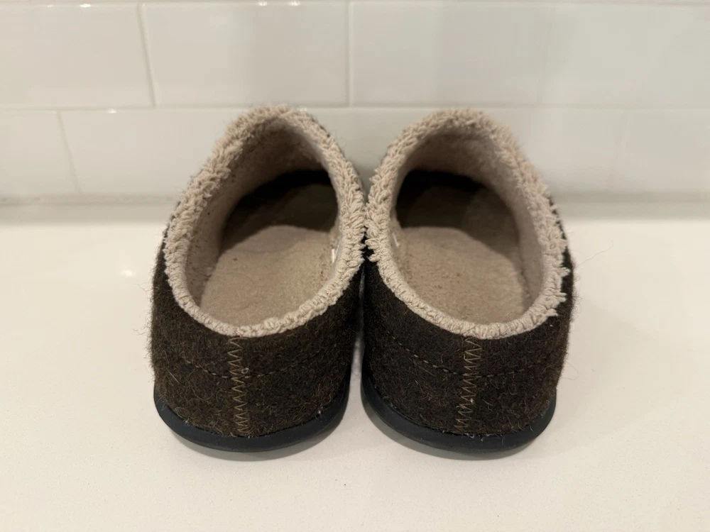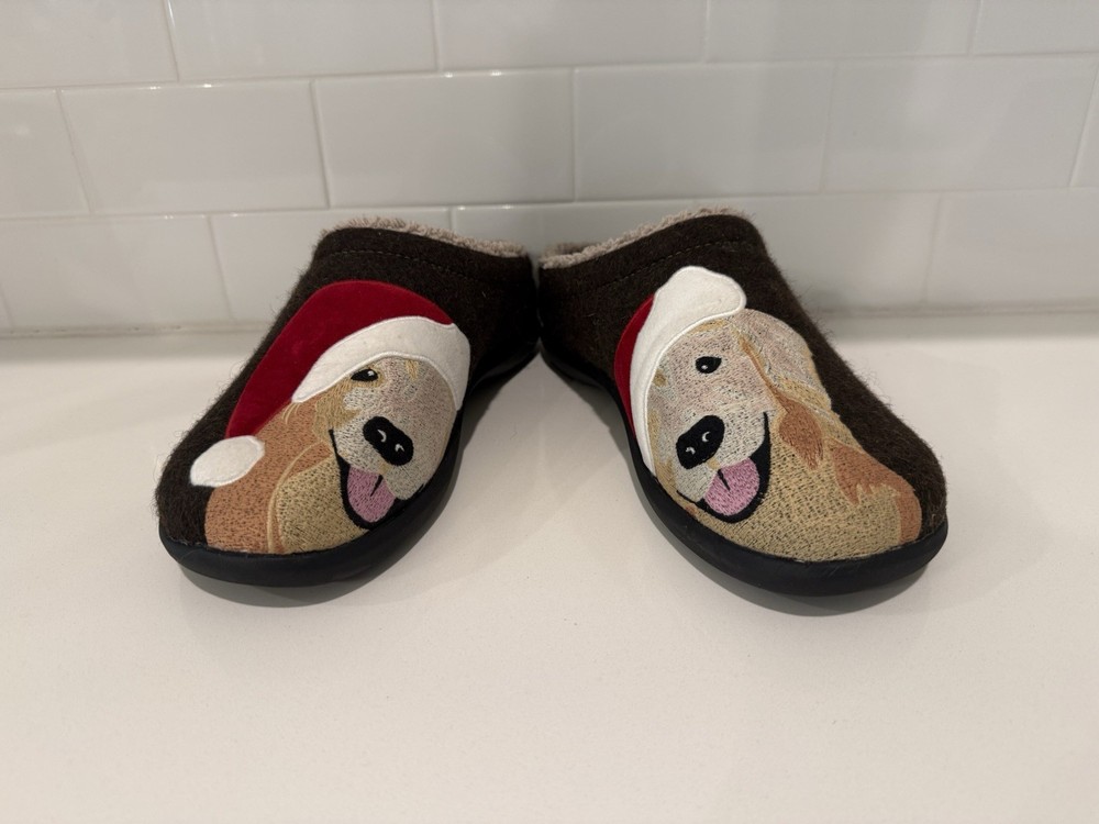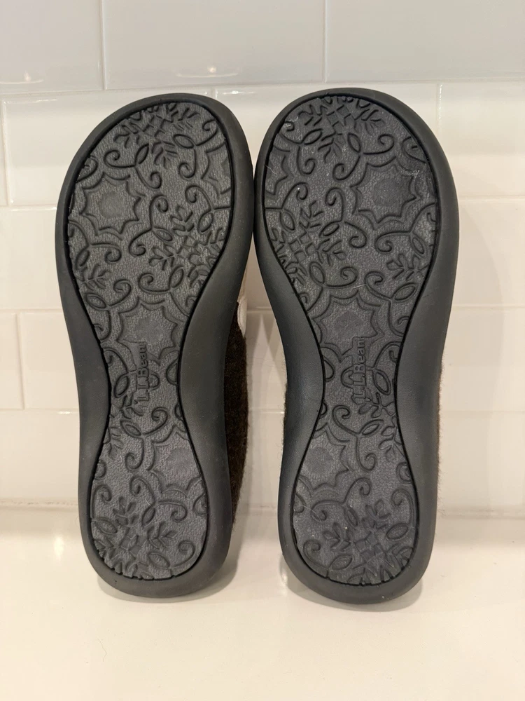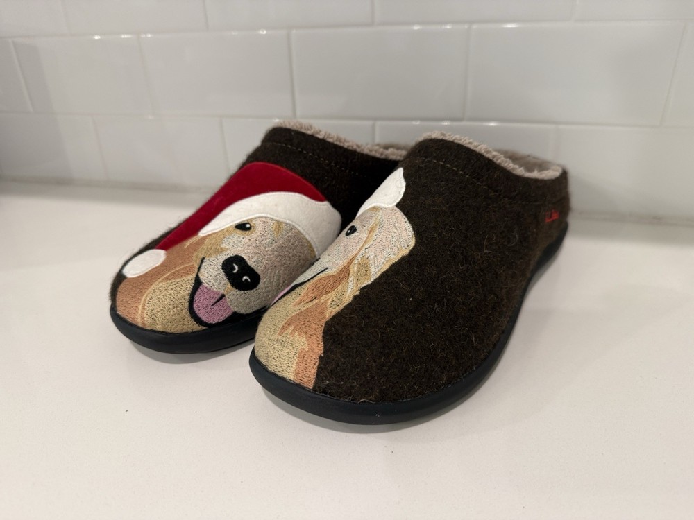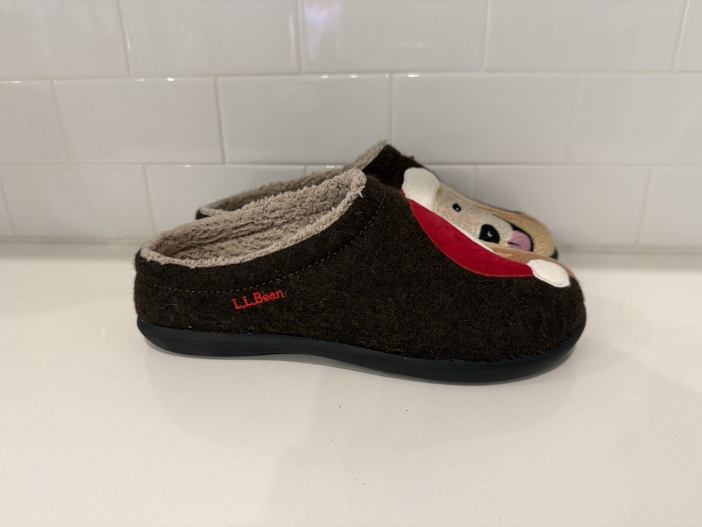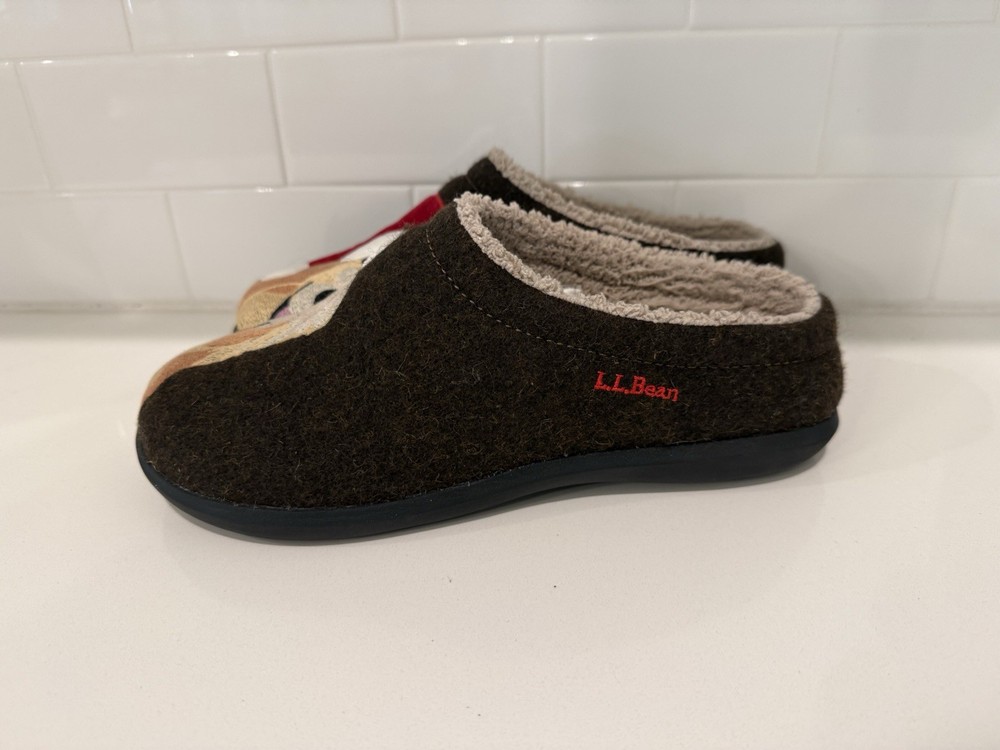 LL Bean Slippers Womens 10M Brown Daybreak Scuffs Christmas Santa Dog Fur Lined
