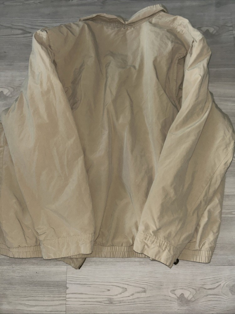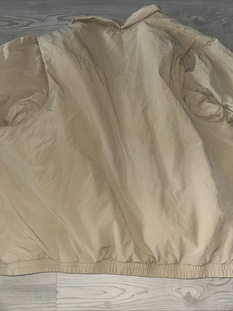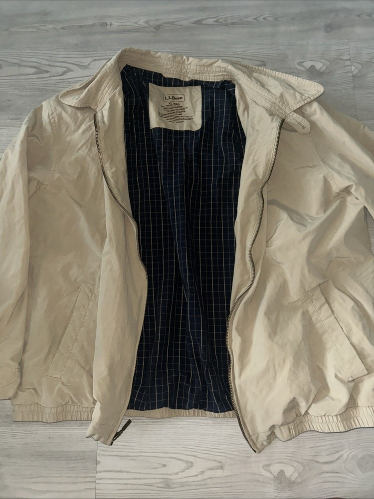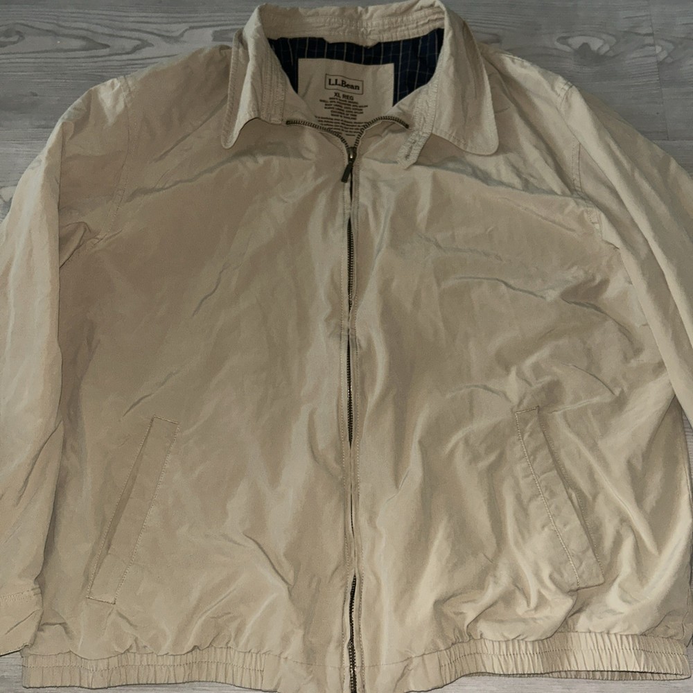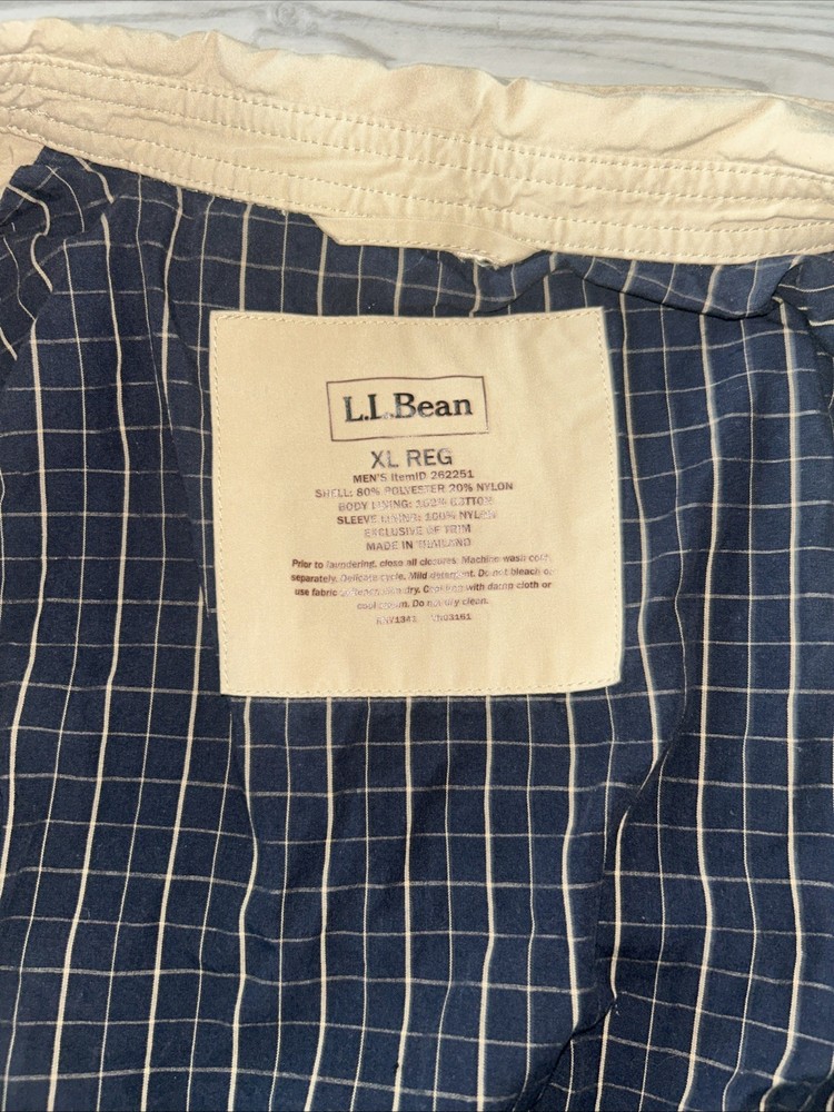 Preowned and excellent condition. The LL Bean Tan Jacket in size XL is a versatile outerwear piece perfect for casual occasions. Made from a durable blend of cotton and nylon, this solid beige jacket features a zip front closure and polyester insulation for added warmth.