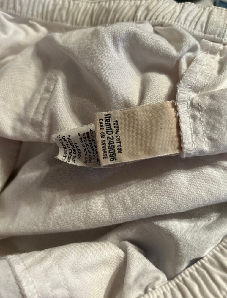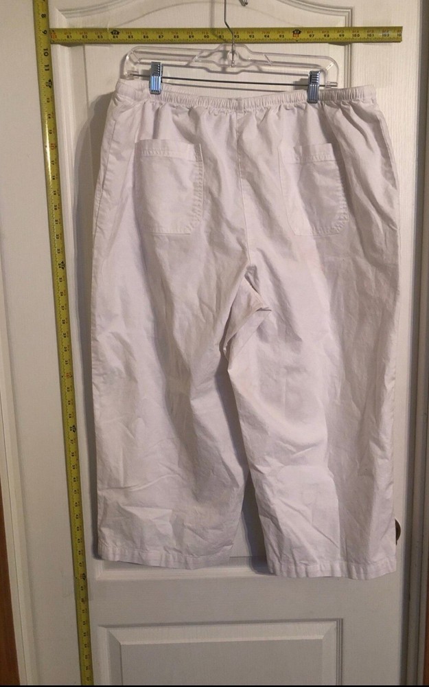 This is an L.L. Bean women's white capri crop pants in size 18, made of 100% linen. The pants feature a solid pattern with a zip closure and a flat front design. They are designed for casual or travel occasions and have adjustable waist for added comfort. The capri style adds a touch of sophistication, while the stretch material ensures a comfortable fit. Ideal for warm weather, these versatile pants can be paired with a variety of tops for a chic and effortless look. There is a small mark on them see the photo circled.