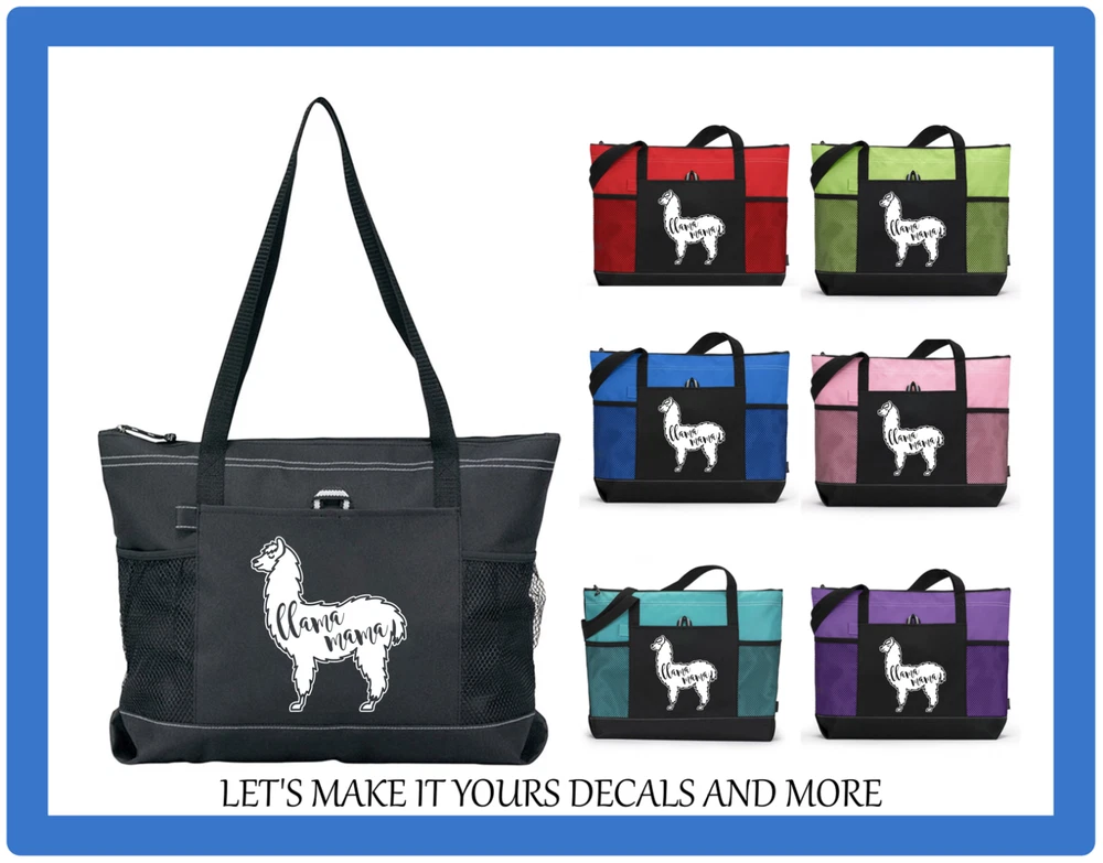 LLAMA MAMA ZIPPERED GEMLINE TOTE YOUR CHOICE OF COLOR TOTE COLOR GEMLINE BRAND TOTE - VERY NICE AND DURABLE GREAT TO USE FOR OVERNIGHT BAGS, PURSES, TRIPS TO THE LAKE OR BEACH, CAMPING, AND SO MUCH MORE THE DESIGN IS HEAT TRANSFER VINYL AND WILL BE DONE IN WHITE BAG SPECS: 600-denier polyester 29½" Black webbing shoulder straps Zippered main compartment Front pocket with pen loop Two side mesh pockets Back panel is Black 20"W x 14"H x 4"D If you have a design request feel free to send us a message. We will work to see what we can do for you. Thanks! We try to ship out our items as quick as possible, but with made to order items it could take up to 5 days for the item to be completed and shipped. We thank you for your patience. DESIGN MAY BE SLIGHTLY ENLARGED TO SHOW DETAIL. DESIGNS WILL NOT EXCEED 6.5 INCHES EITHER IN WIDTH OR LENGTH. Be sure to fully examine all pictures closely and read auction completely prior to placing a bid. If you have any questions please be sure to contact me and I will do my best to answers them. I do combine shipping! Please note that our post office is closed on Sat & Sun so we can only ship Mon-Fri. Paypal is the only form of payment we accept at this time. If ever there is a problem please contact us prior to leaving bad feedback. We strive for a 5 star rating. Thank You :-)