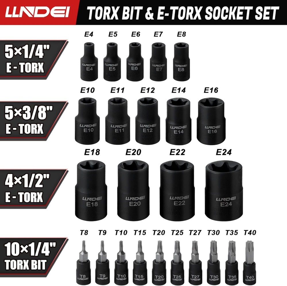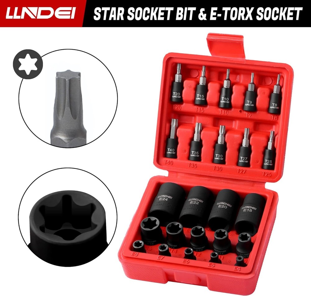 Torx Bit Socket and Female External Set 24PCS, LLNDEI 10 Star 24PCS Product Details Brand: LLNDEI Material: Chrome Vanadium Steel Drive System: Torx, Star, Torq-Set Finish Type: black phosphate finish Number of Pieces: 24 Manufacturer: LLNDEI Part Number: LLNDEI 24 Item Weight: 13.8 ounces Product Dimensions: 5.12 x 4.72 x 2.2 inches Country of Origin: China Item model number: LLNDEI 24 Size: 24PCS Finish: black phosphate finish Shape: torx Power Source: manual Torque: 569 Newton Meters Item Package Quantity: 1 Measurement System: Metric Compatible Fastener Range: 0.375 inches Included Components: TORX BIT SOCKET 1/4"DRIVE:T8,T9,T10,T15,T20,T25,T27,T30,T35,T40, E-TORX SOCKET 3/8"DRIVE:E10, E11, E12, E14, E16, E-TORX SOCKET 1/2"DRIVE:E18, E20, E22, E24, E-TORX SOCKET 1/4"DRIVE:E4, E5, E6, E7, E8 Batteries Included?: No Batteries Required?: No Brand: LLNDEI Material: Chrome Vanadium Steel Drive System: Torx, Star, Torq-Set Finish Type: black phosphate finish Number of Pieces: 24 Chrome Vanadium Steel DURABLE: Female Torx socket set & star bits set meets ANSI and DIN performance standards, constructed of heat-treated chrome vanadium steel(50BV30)and S2 with black phosphate finish for strength and durability. E-TORX SOCKET SET INCLUDE: 1/4"drive: E4, E5, E6, E7, E8; 3/8"drive: E10, E11, E12, E14, E16; 1/2"drive: E18, E20, E22, E24. TORX BIT SET INCLUDE: 1/4" drive:T8,T9,T10,T15,T20,T25,T27,T30,T35,T40. WIDE APPLICATIONS: Torx and e-Torx sockets can meet your requirements for multiple projects, it is an essential tools for your car, motorcycle, bicycle, lawn equipment, electrical appliances, machinery, etc. EASY TO USE: The torque socket set is equipped with a dedicated storage box, and each position is marked with dimensions for secure storage, laser etched high contrast and specific size marks make identification easier. 【889 certification】Our product has obtained U.S. Section 889 certification and meets all government requirements, so you can purchase with confidence.