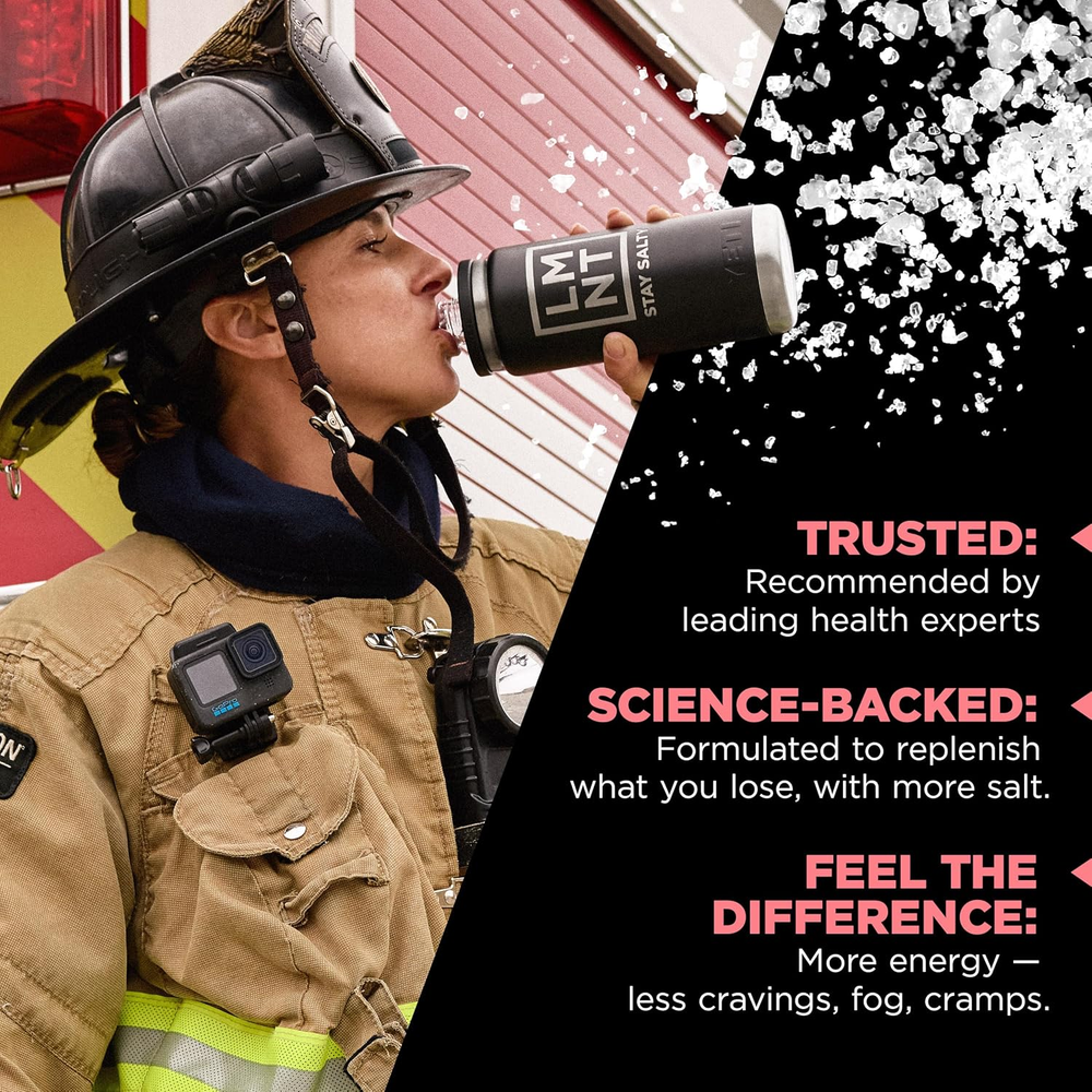 THE BEST ELECTROLYTE DRINK MIX EVER: LMNT is a tasty electrolyte drink mix with everything you need and nothing you don't — perfect for training, low-carb or keto diets, fasting, and those leading active lifestyles. MORE SALT, NOT LESS: A growing body of research reveals that optimal health outcomes occur at sodium levels 2-3x government recommendations. That’s why we say, More Salt, Not Less. OUR FORMULATION: Each stick pack contains 1000 mg sodium, 200 mg potassium, 60 mg magnesium — a truly meaningful serving of electrolytes in a science-backed ratio. FEEL THE DIFFERENCE: All-day energy starts with optimal hydration. More energy. No brain fog or cramps. You feel the difference when you get it right. HOW TO #STAYSALTY: Mix one stick pack with 16–32 ounces of water, sparkling water, tea, smoothie, or more. Product description The video showcases the product in use. The video guides you through product setup. The video compares multiple products. The video shows the product being unpacked. LMNT Electrolye Drink Replacement Merchant Video