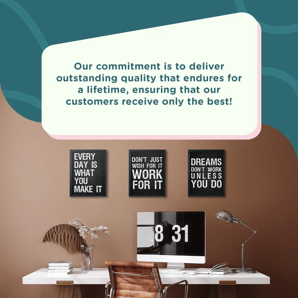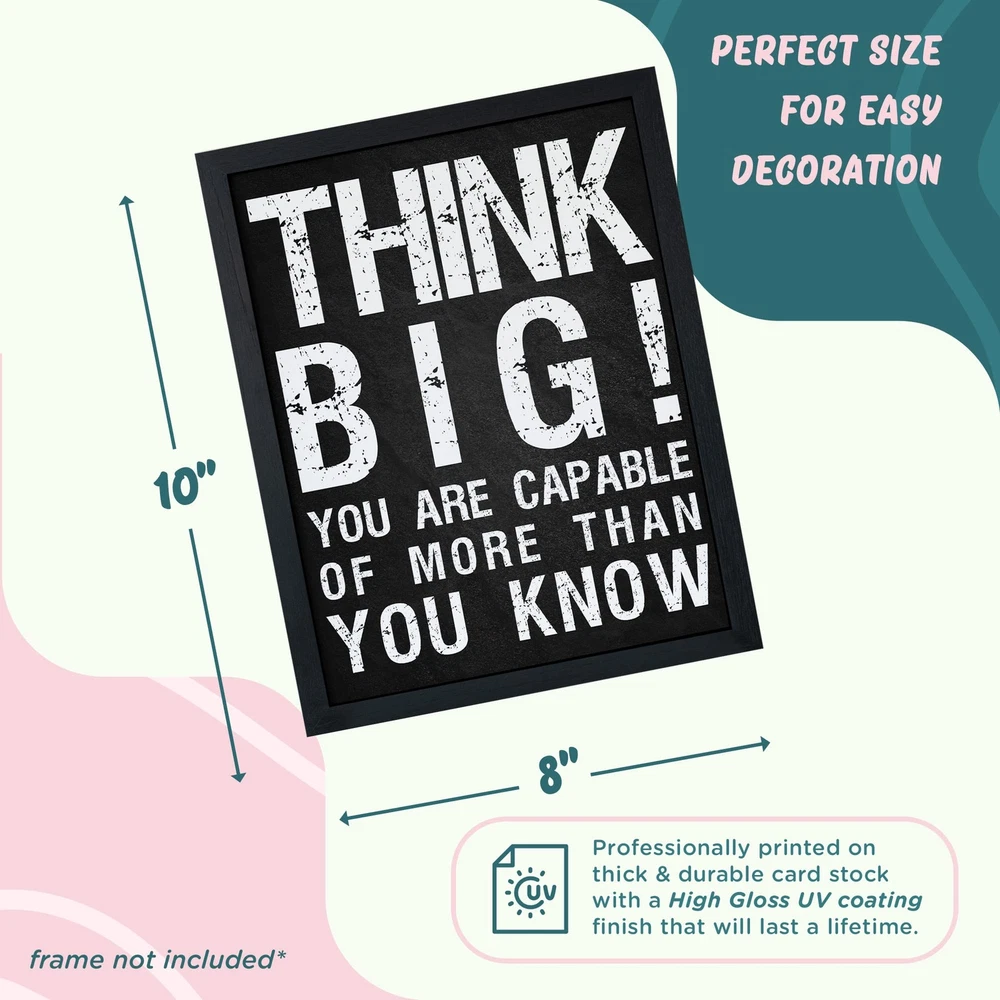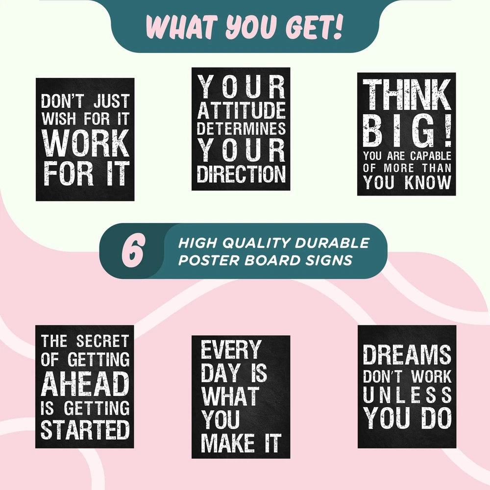 Decorate any room in your home or office with these simple, yet elegant and timeless inspirational quote prints from ! This home décor artwork will brighten any room and inspire and motivate. That’s why we created Inspirational Wall Art that feature six beautiful & original designs for wall décor. This 6-pack of artwork comes with everything you’ll need to decorate any room. Quotes include: DON’T JUST WISH FOR IT WORK FOR IT; EVERY DAY IS WHAT YOU MAKE IT; THINK BIG! YOU ARE CAPABLE OF MORE THAN YOU KNOW; YOUR ATTITUDE DETERMINES YOUR DIRECTION; THE SECRET OF GETTING AHEAD IS GETTING STARTED; DREAMS DON’T WORK UNLESS YOU DO. Product Details: Inspirational Wall Art (Set of 6) Easy to Hang, Frame, & Reuse Glossy Durable Finish All Ages Poster Dimensions: 8” x 10” (Each) No questions asked return policy Decorate any space with these inspirational & motivational prints that will surely be the perfect décor for any room by clicking 'Add to Cart’ above now. MOTIVATE & INSPIRE – With these striking designs and powerful quotes, our inspirational wall décor will motivate, inspire, and instill a positive, growth mindset in women, men, teens, boys, girls, and the whole family alike. BEAUTIFULLY PRINTED– These high quality black & white prints are printed on durable and thick poster board and feature six (size 8 x 10) pictures that will compliment any home, bedroom, living room, office, desk space, cubicle, workout, or sports space. HIGHEST QUALITY – We use the highest quality print materials with all of our products, with a high gloss finish that will protect them for years to come. Check out our storefront to see our other highly home, office, & classroom products and to see what our satisfied customers have to say! PERFECT GIFT – Our affordable & Artistic wall art will satisfy anyone’s taste, from rustic, to farmhouse, to modern. They look great with a frame or without (Frames not included), and with frames they are even more elegant than bulky canvas! VETERAN & MOM OWNED & OPERATED – We are a small, family & veteran business that only manufactures in the USA. We care deeply about our products and your satisfaction, so if you’re not satisfied, simply return the product and we will fully your order, no questions asked!