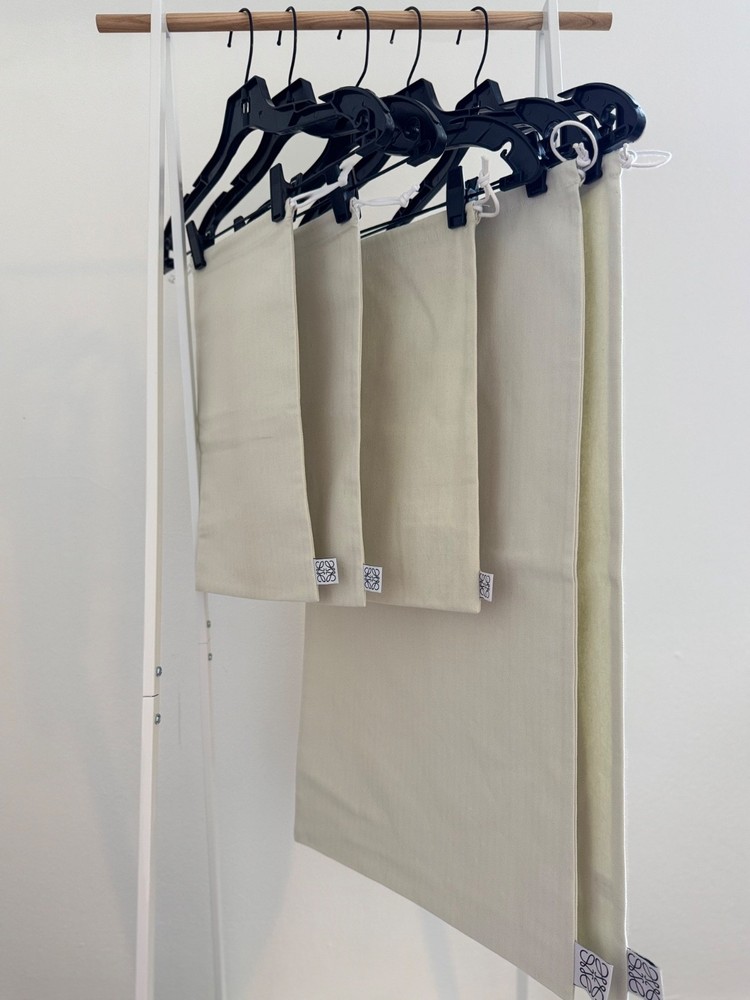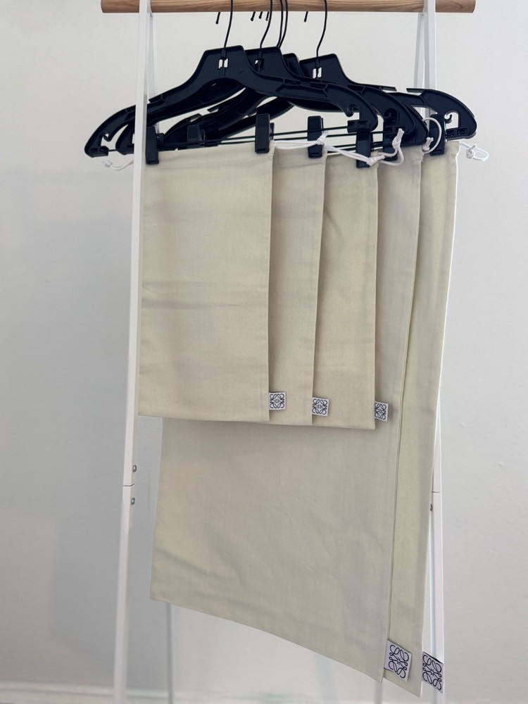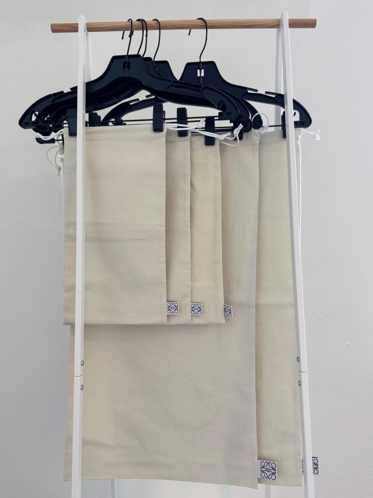 Authentic LOEWE cotton drawstring dust bags in beige – the perfect way to protect and store your luxury items. Crafted from high-quality cotton, these dust bags are reusable, eco-friendly, and ideal for keeping handbags, shoes, and accessories safe from dust and scratches. Each bag features the signature LOEWE logo tag for an elegant, minimalist look. ✨ Set includes: 3 Small dust bags (ideal for shoes, belts, or small accessories) 2 Large dust bags (perfect for handbags or larger items) Whether you’re organizing at home or packing for travel, this versatile LOEWE dust bag set combines practicality with timeless designer style.