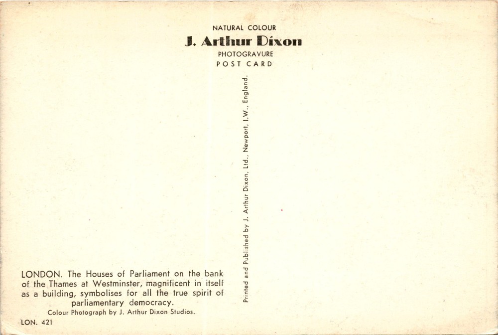 MAKE AN OFFER. THE MORE YOU BUY THE BETTER DEAL I WILL ACCEPT The postcard features a color photograph of the Houses of Parliament on the bank of the Thames at Westminster in London. The Houses of Parliament is a magnificent building that symbolizes the true spirit of parliamentary democracy. The photograph was taken by the J. Arthur Dixon Studios and the postcard was printed and published by J. Arthur Dixon, Ltd.