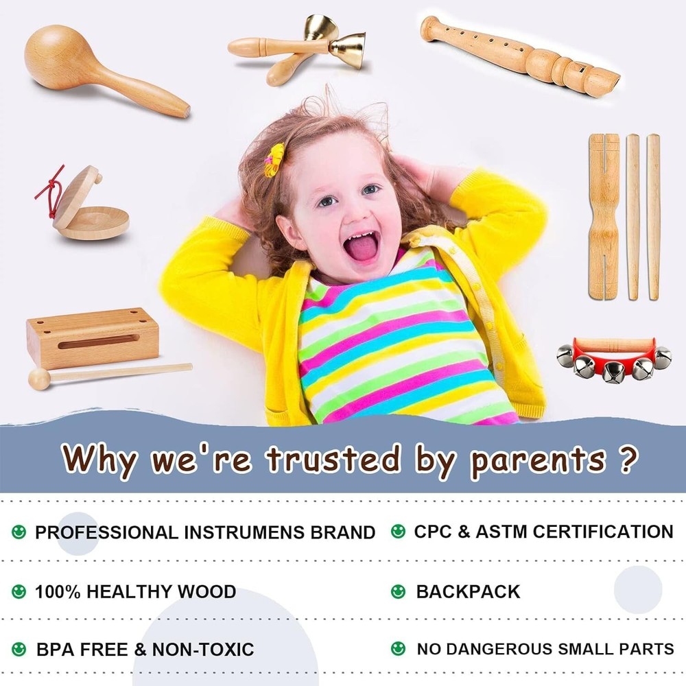 【8 IN 1 MONTESSORI MUSICAL INSTRUMENTS】Designed for 3Y+ sensory learners, this Montessori Musical Instruments Set features rounded edges that prevent mouthing hazards, with washable surfaces that simplify hygiene. Modern parents value the minimalist design blending sensory development and safety – a space where every tap and shake builds neural pathways through self-directed play 【MUSICAL INSTRUMENT SET】This set includes 1 xylophone, 1 tambourine, 2 drumsticks, 1 clarinet, 1 castanets, 1 triangle, 1 wood sounder, 1 rain sound shaker, 1 maracas and 2 wooden sticks. Your little ones can now embark on a magical musical adventure with this musical instrument set 【EDUCATIONAL DEVELOPMENT】Every drumstick tap and xylophone chime nurtures rhythm recognition and motor coordination – skills proven to accelerate cognitive development by 23% in preschoolers 【SAFE MATERIALS】Crafted for toddlers 3+ years, these BPA-free wooden instruments combine musical exploration with safety: ASTM/CPSIA-certified, anti-swallow design, and washable surfaces. Each piece nurtures rhythm recognition and fine motor skills through play-based learning