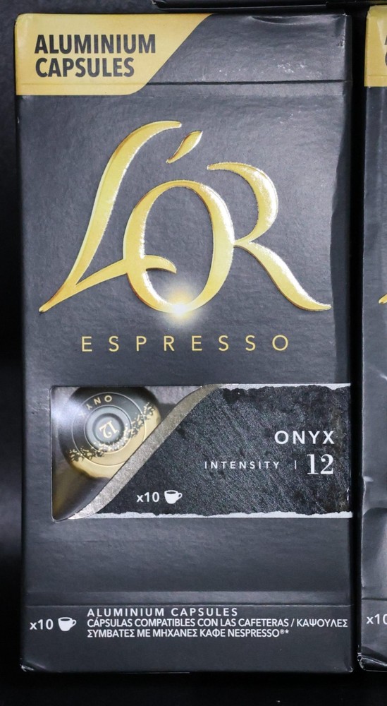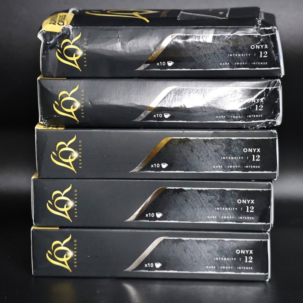 L'OR Espresso - Onyx, Level 12 Intensity Dark Roast, EX: 5/26 *50 CAPSULES* Includes 5 boxes - each box contains 10 capsules - 50 total capsules One box has been opened but all capsules are sealed Some boxes have minor damage - all shown in photos